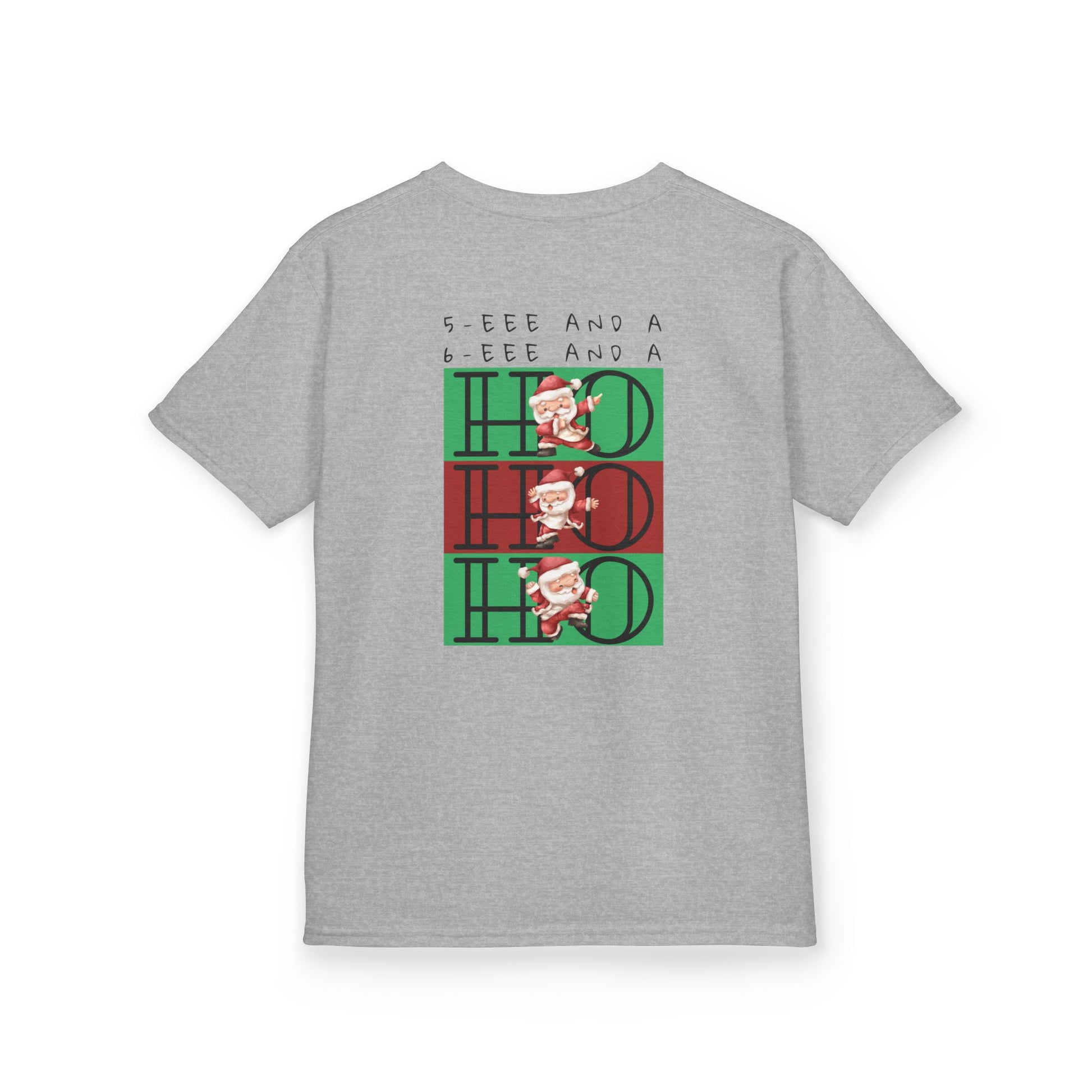 “5-eee and a 6-eee and a Ho, Ho, Ho” YOUTH Short Sleeve Tee with Playful Dancing Santa Front & Back – Festive Christmas Dance Tee for Dancers & Studios