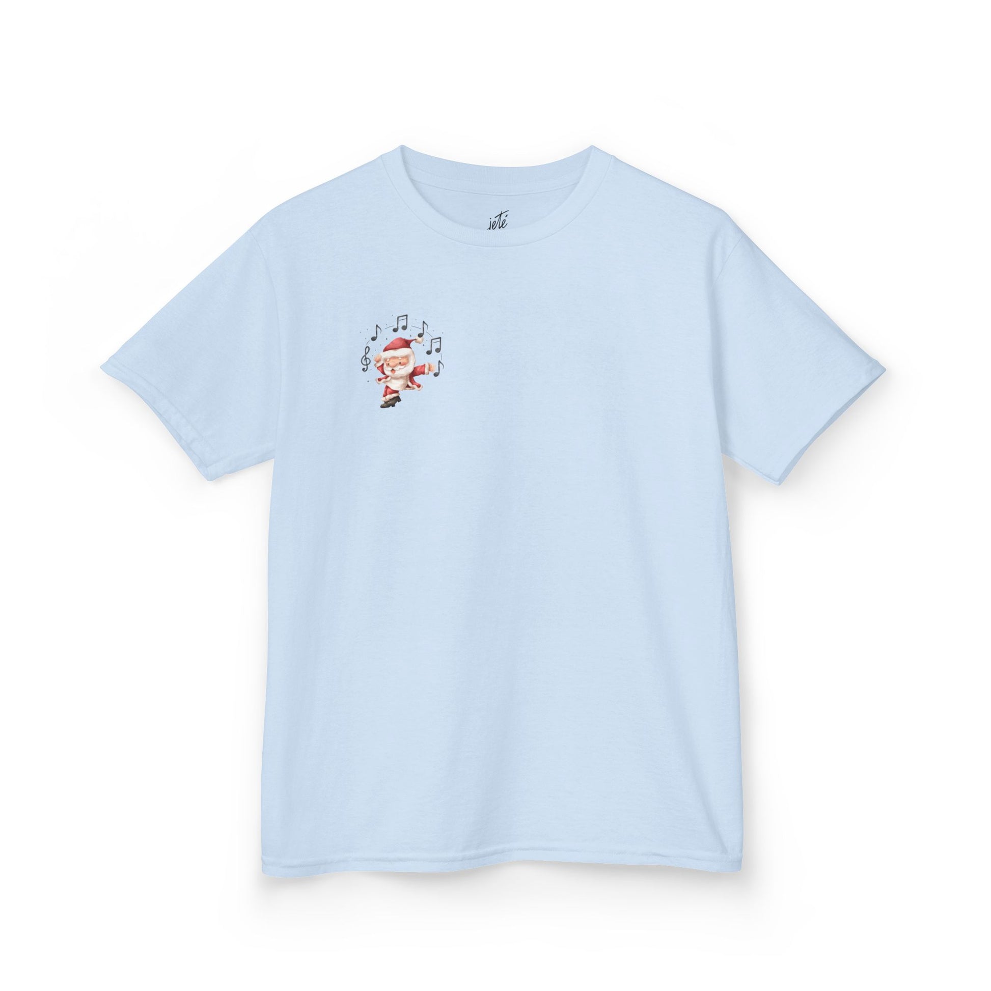 - Small dancing Santa on the chest + bold stacked Santa blocks on the back