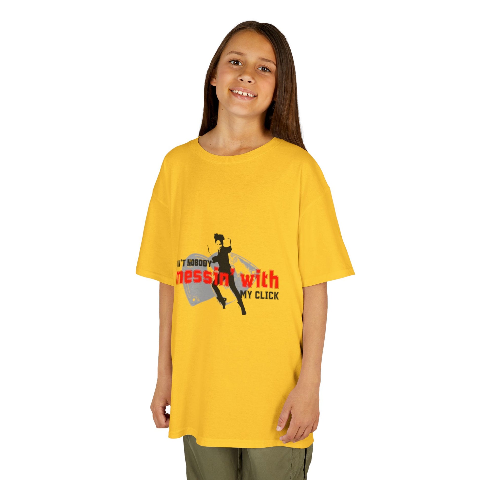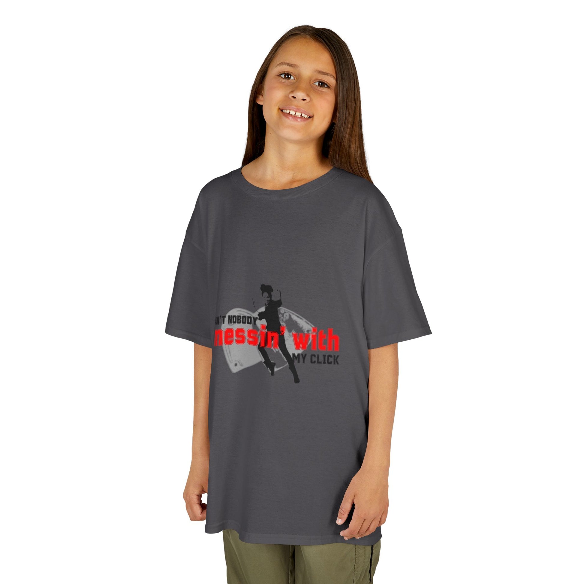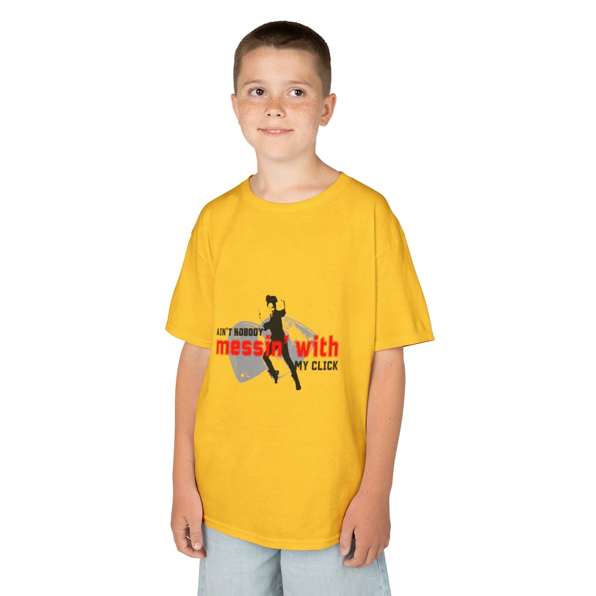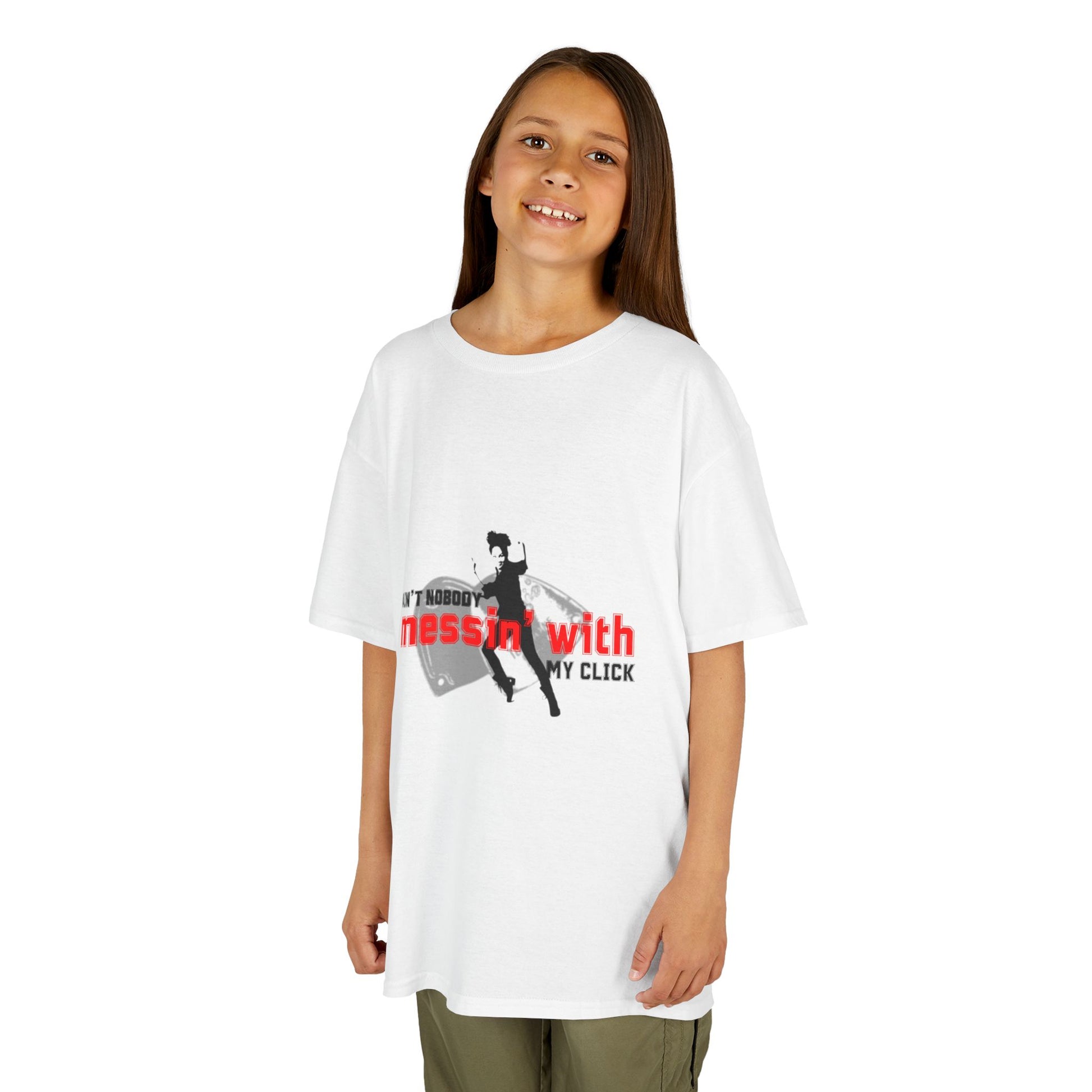 "Ain’t Nobody Messin’ With My Click" – Youth Short Sleeve Dance Tee with Tap Shoes & Tap Dancer Graphic