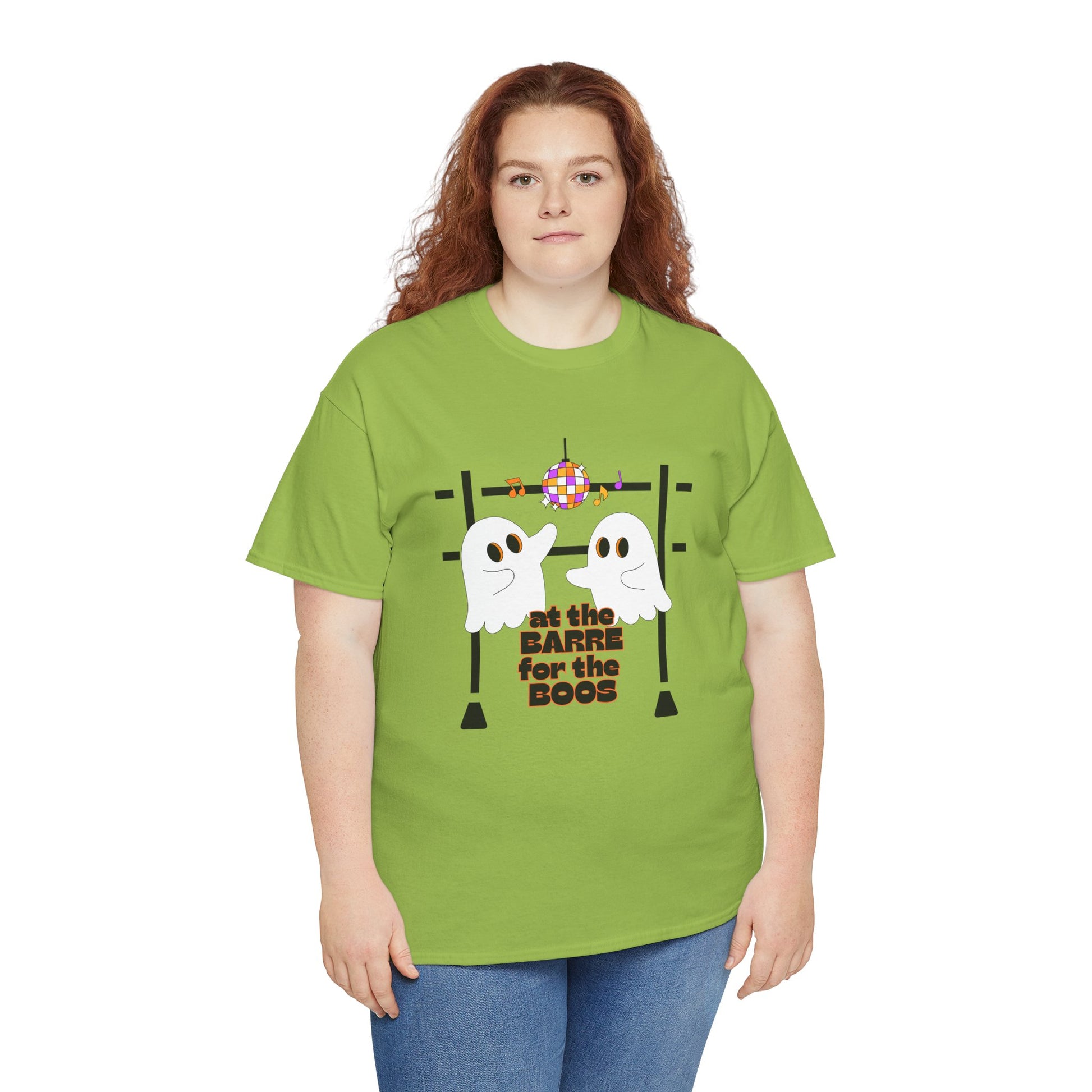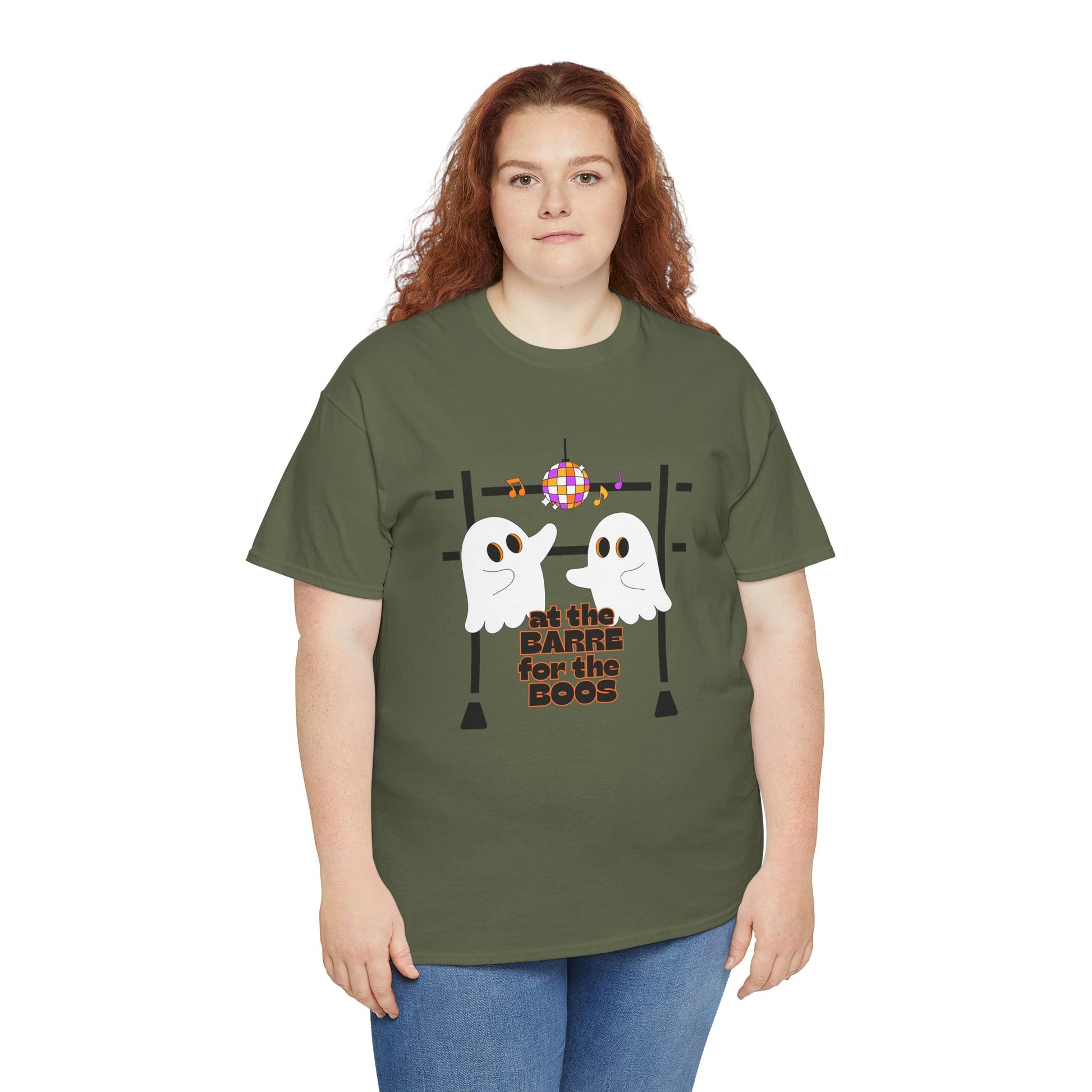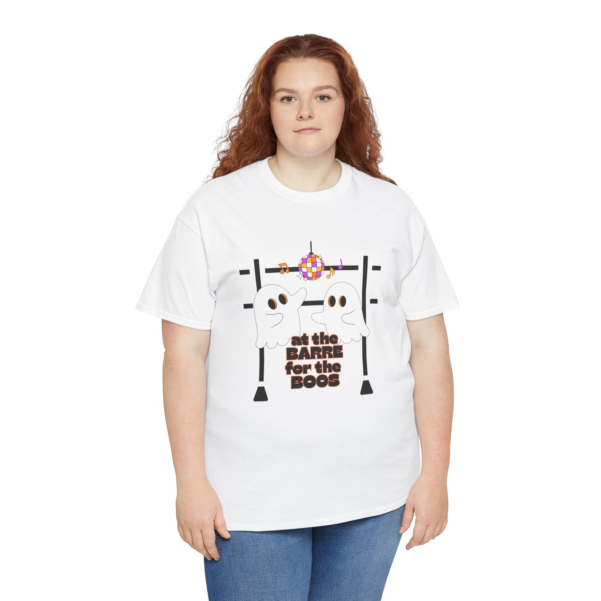 “At the Barre for the Boos” Dance Halloween T-Shirt with Cute Ghost Ballet Graphics - Unisex Heavy Cotton Tee