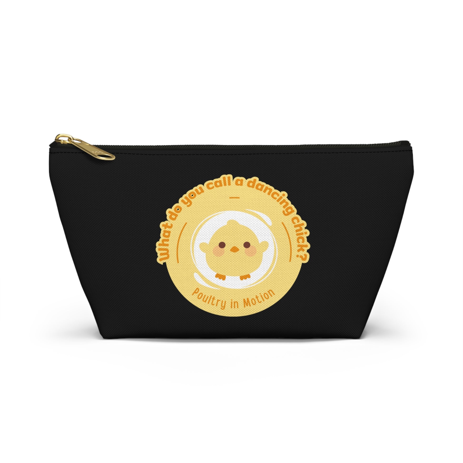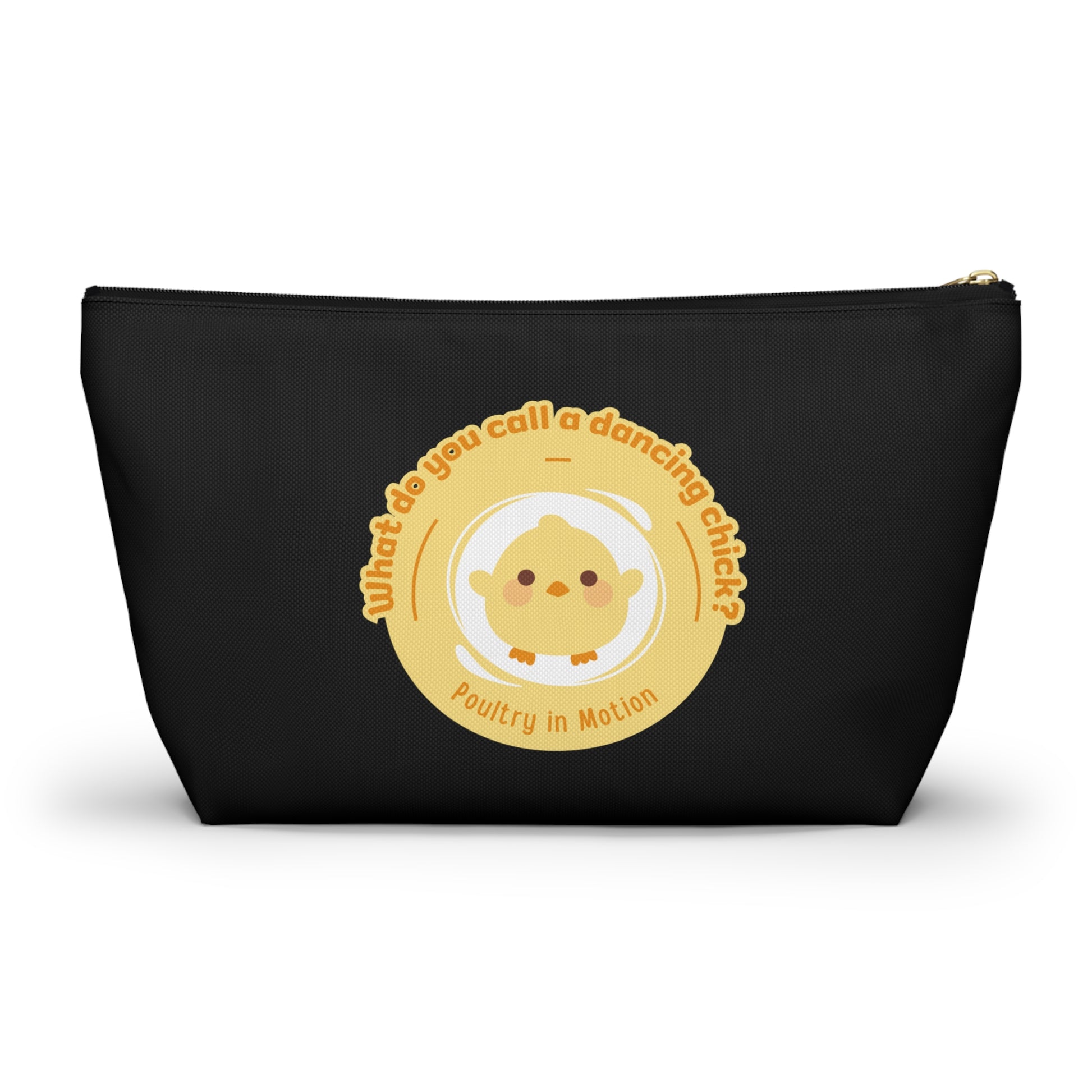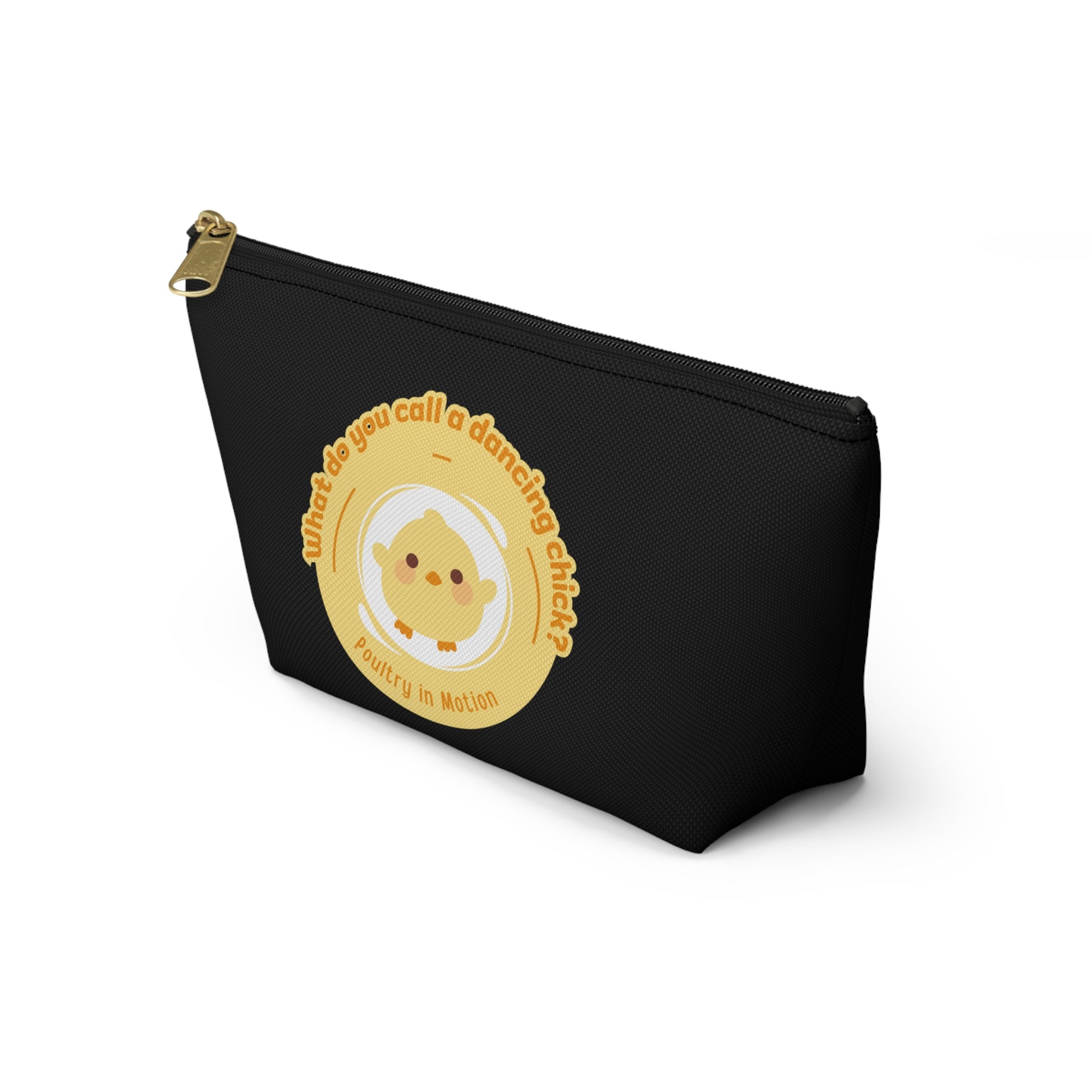 "What do you call a dancing chick? Poultry in Motion." Makeup Bag – Funny Dancing Chick Pun with Cute Chicken Graphic – Dance-Themed Zipper Pouch for Cosmetics, Accessories & Gifts