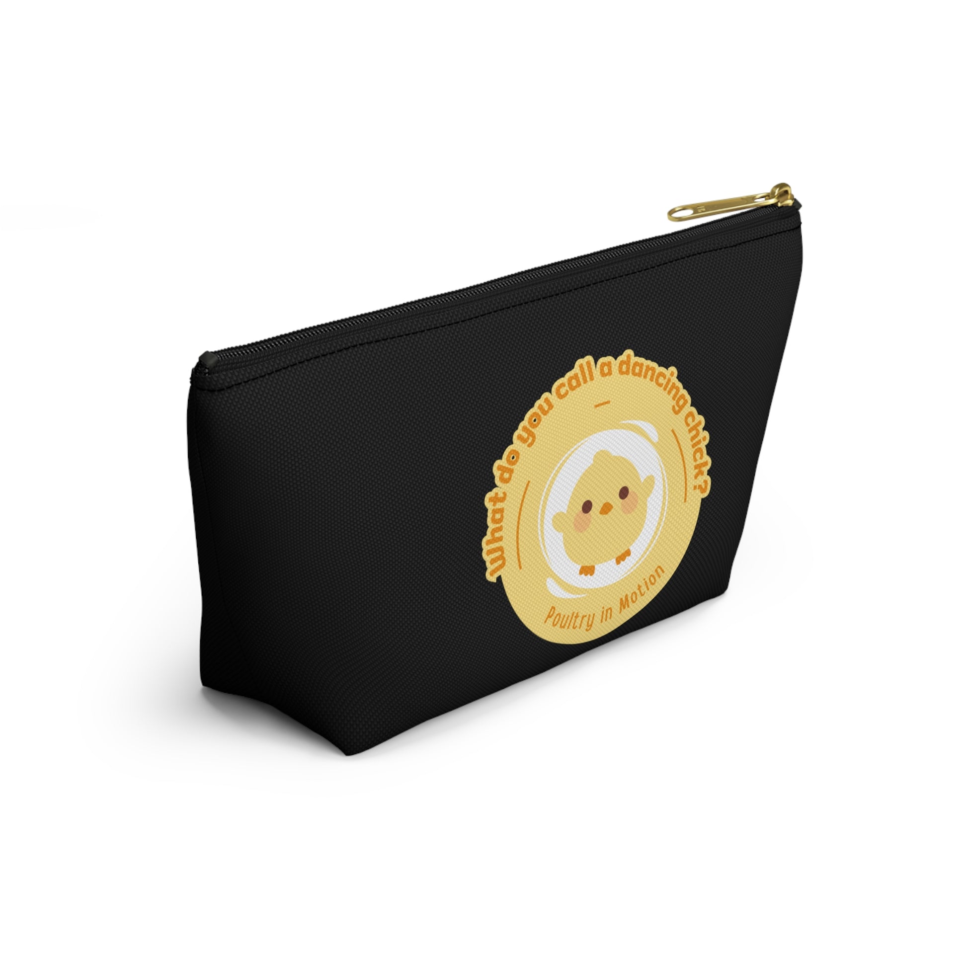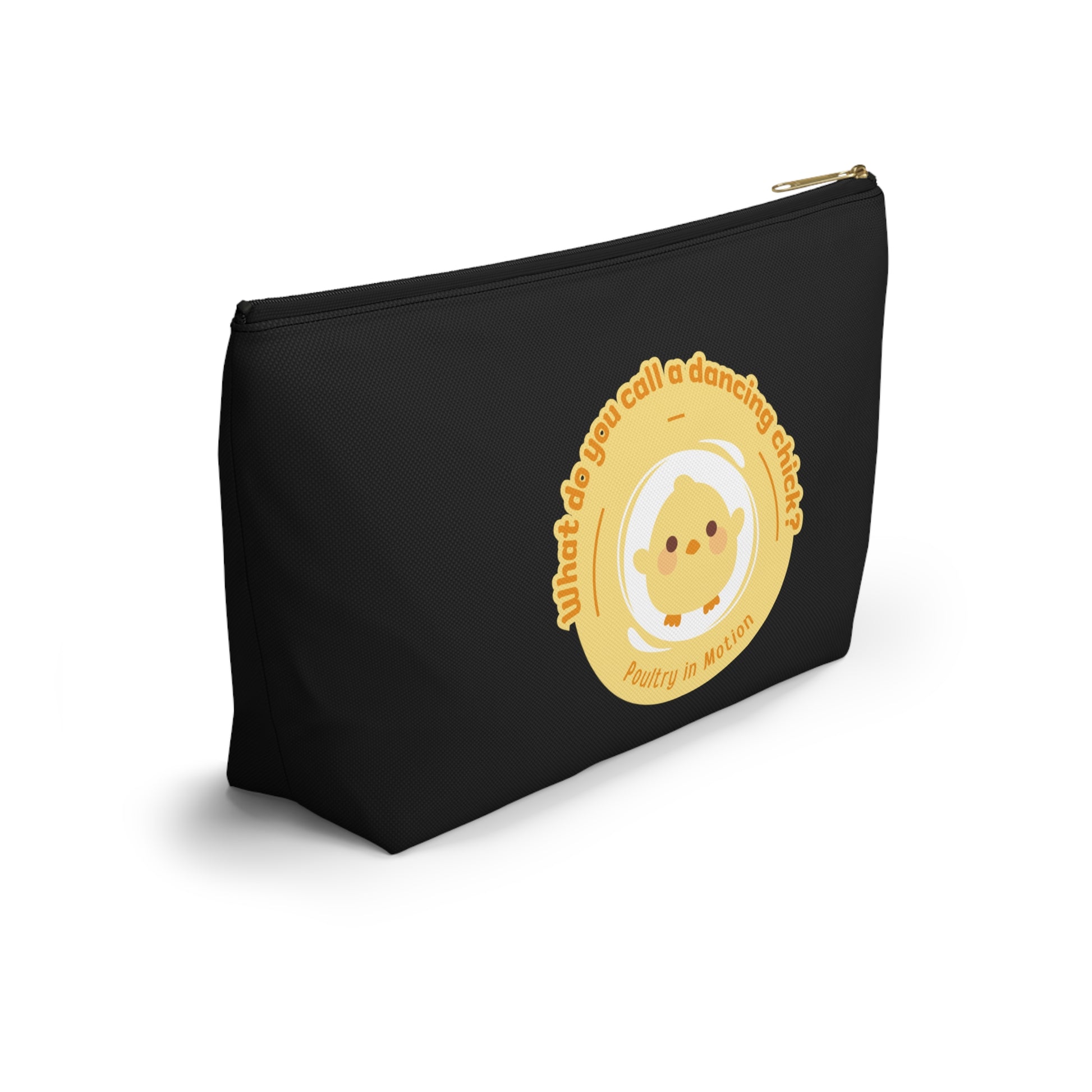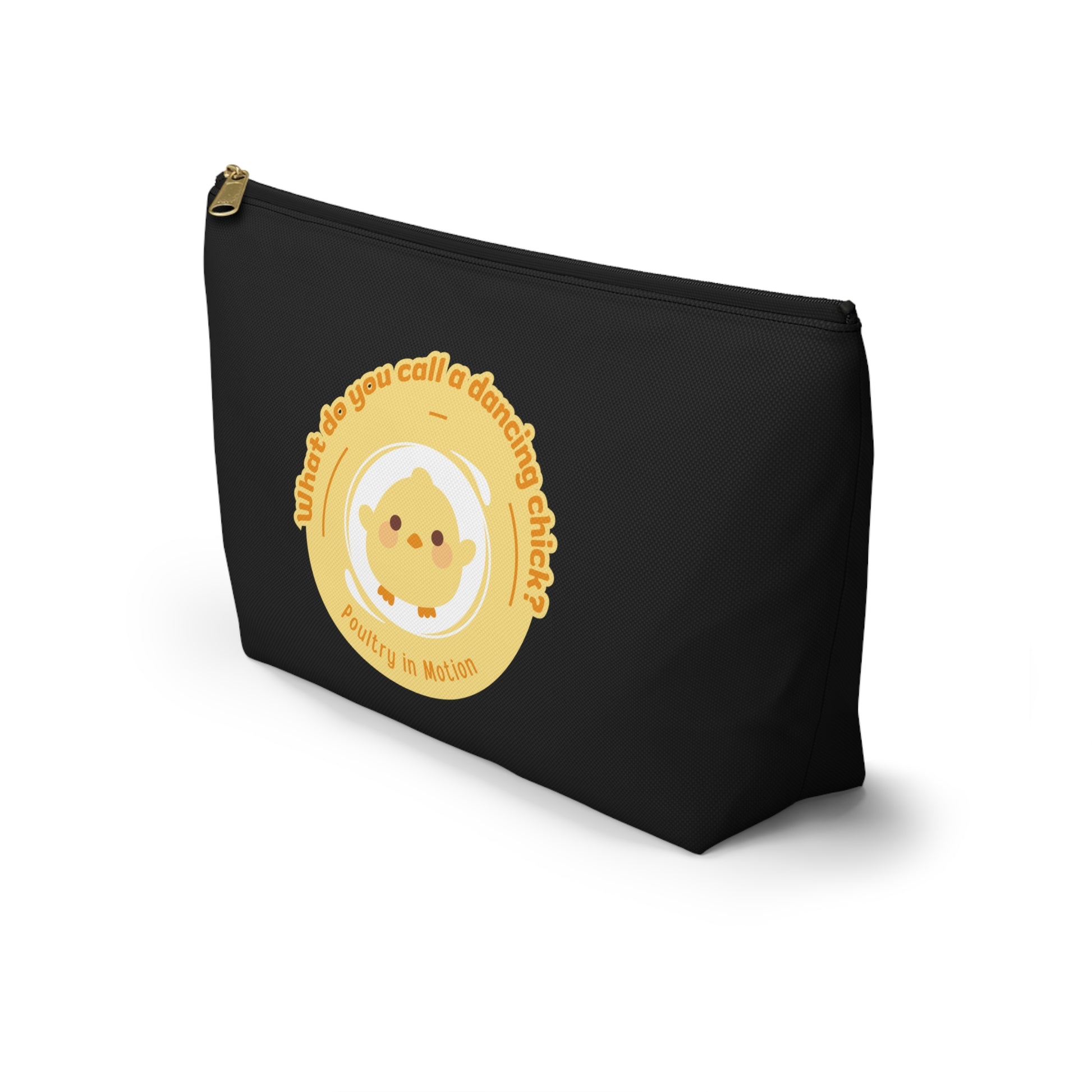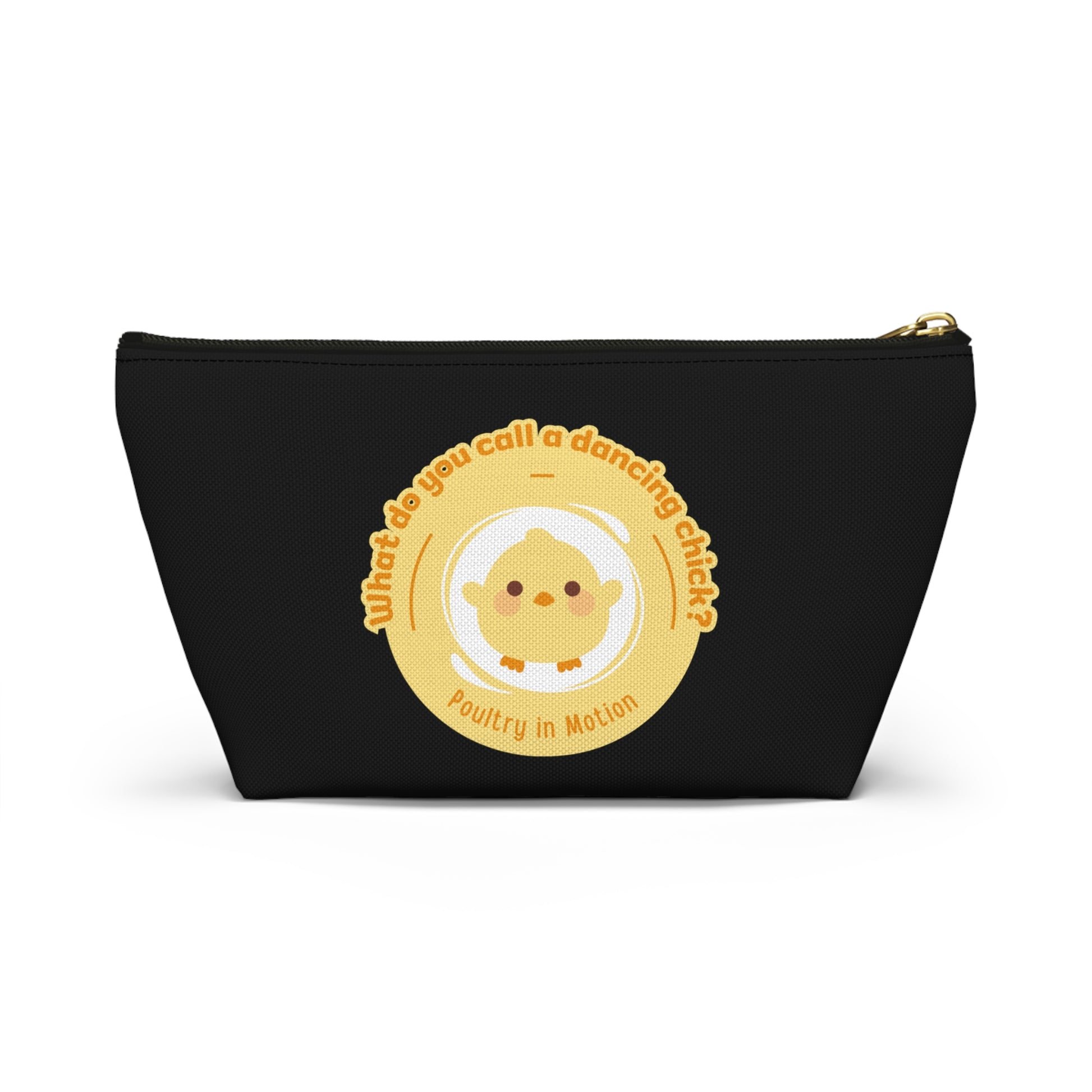 "What do you call a dancing chick? Poultry in Motion." Makeup Bag – Funny Dancing Chick Pun with Cute Chicken Graphic – Dance-Themed Zipper Pouch for Cosmetics, Accessories & Gifts