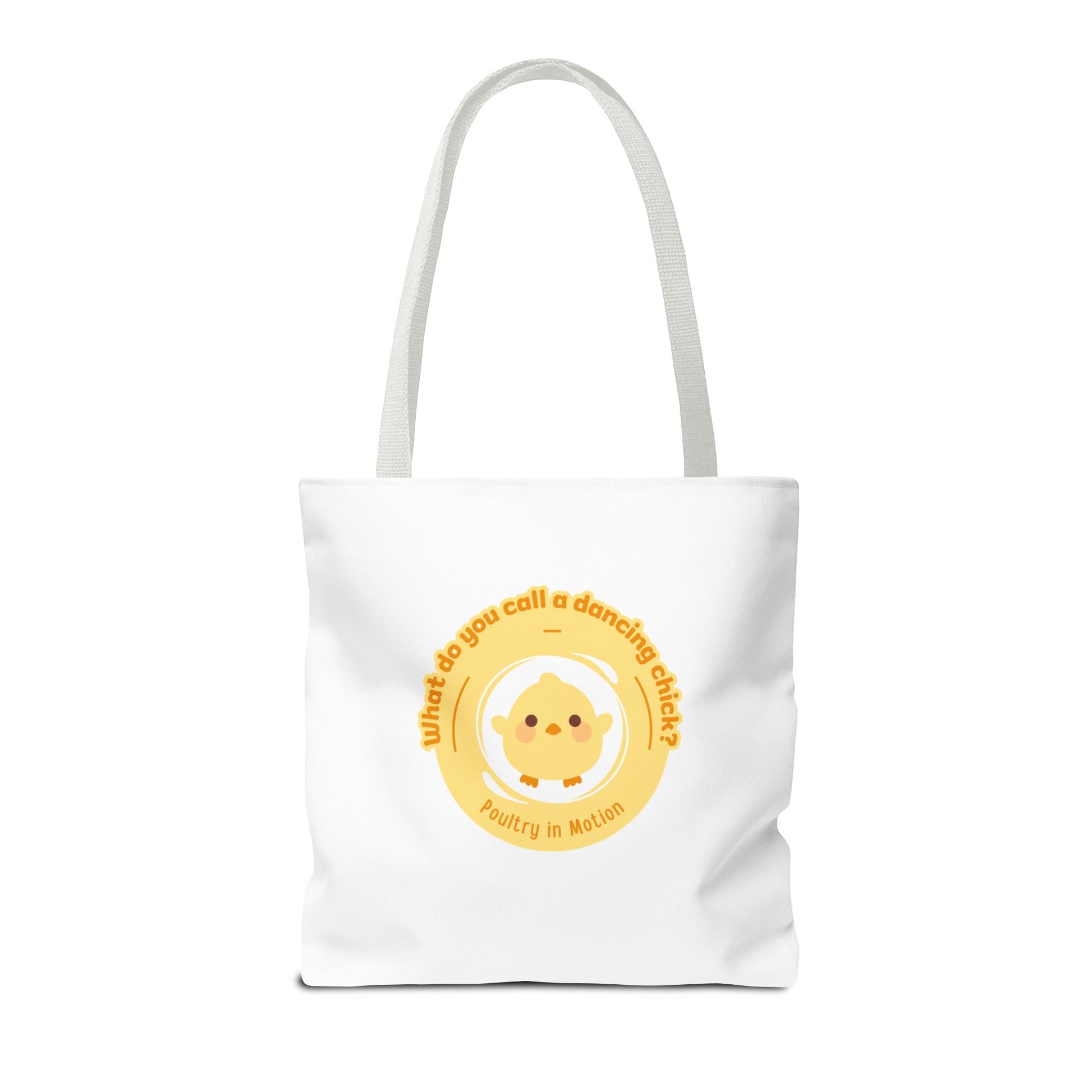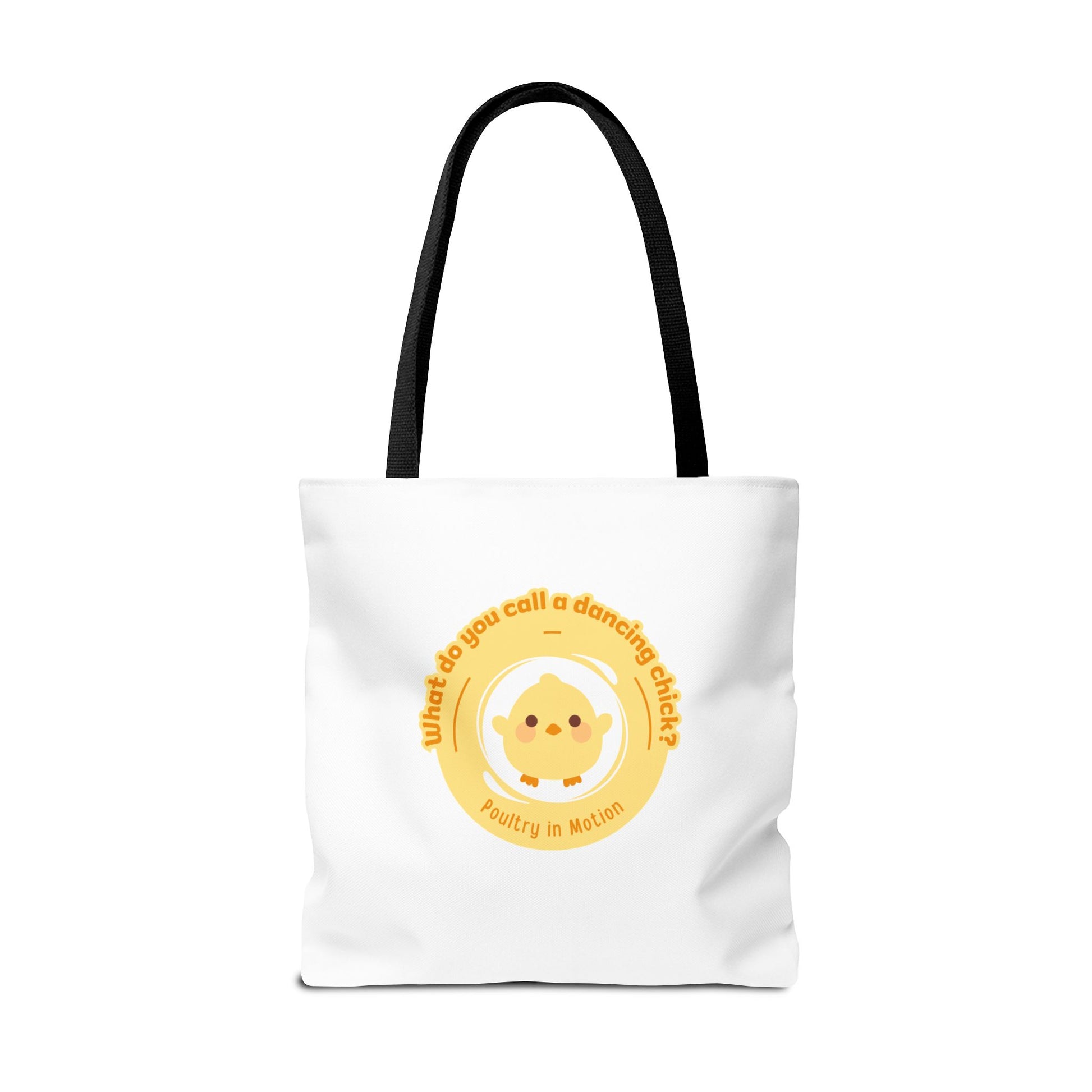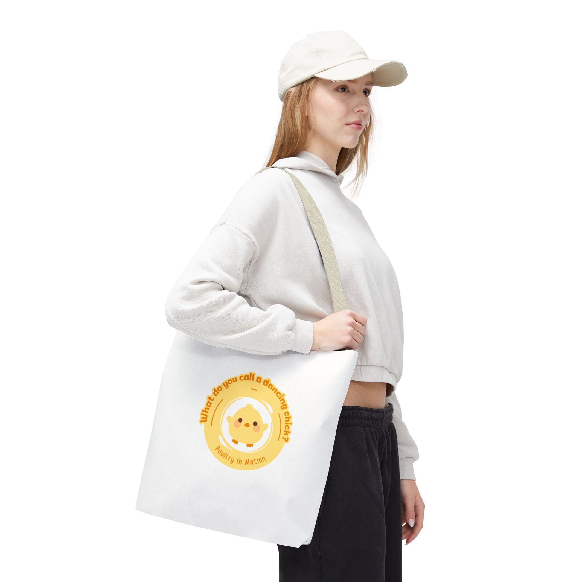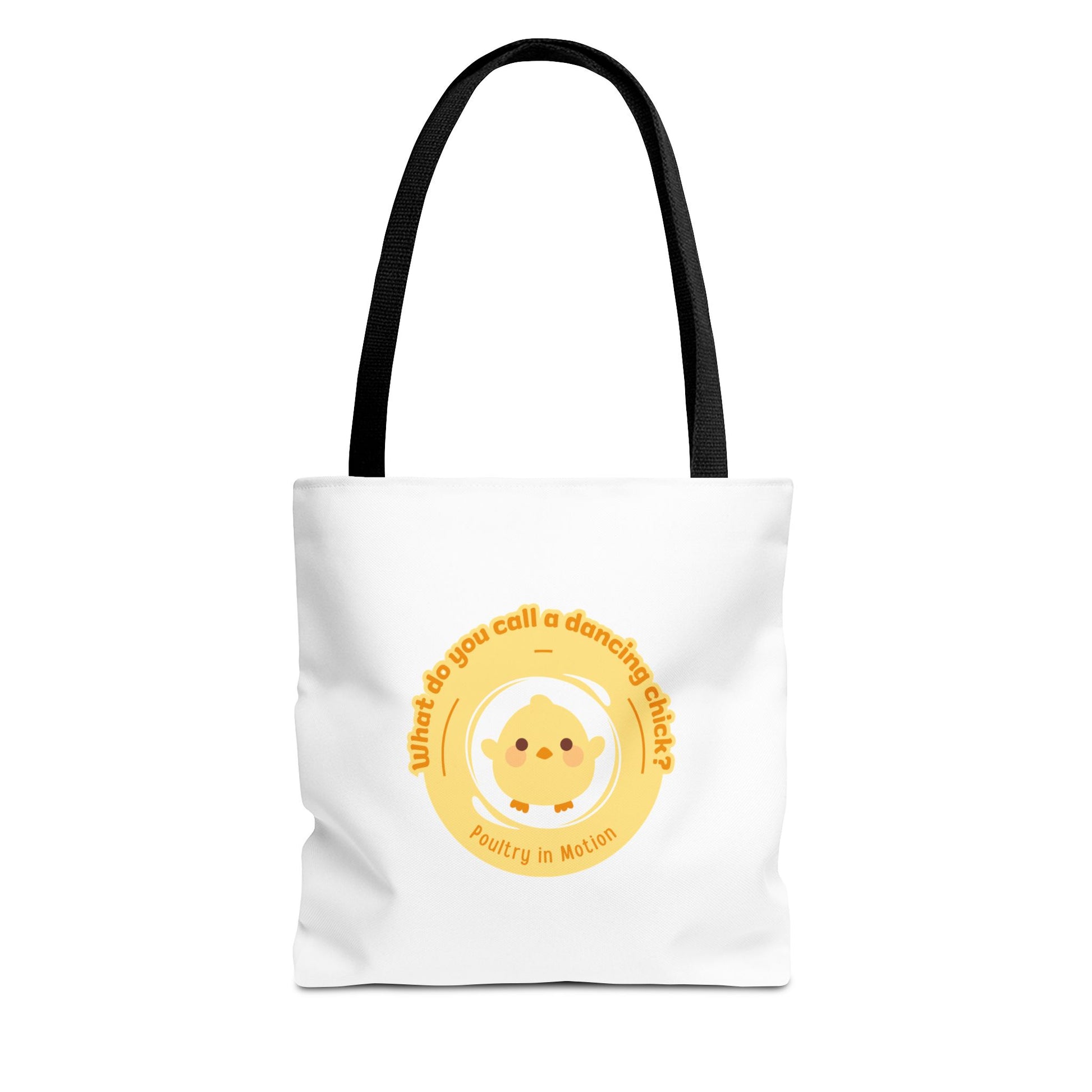 "What do you call a dancing chick? Poultry in Motion" Funny Dance Tote Bag – Kawaii Chicken Canvas Tote for Dancers & Dance Lovers