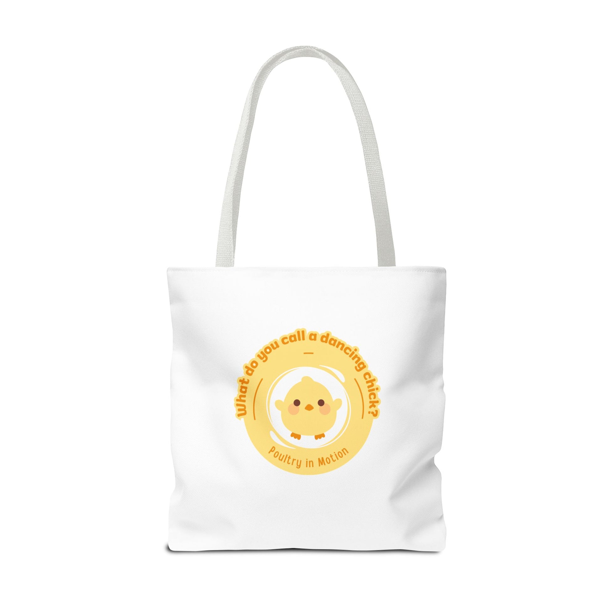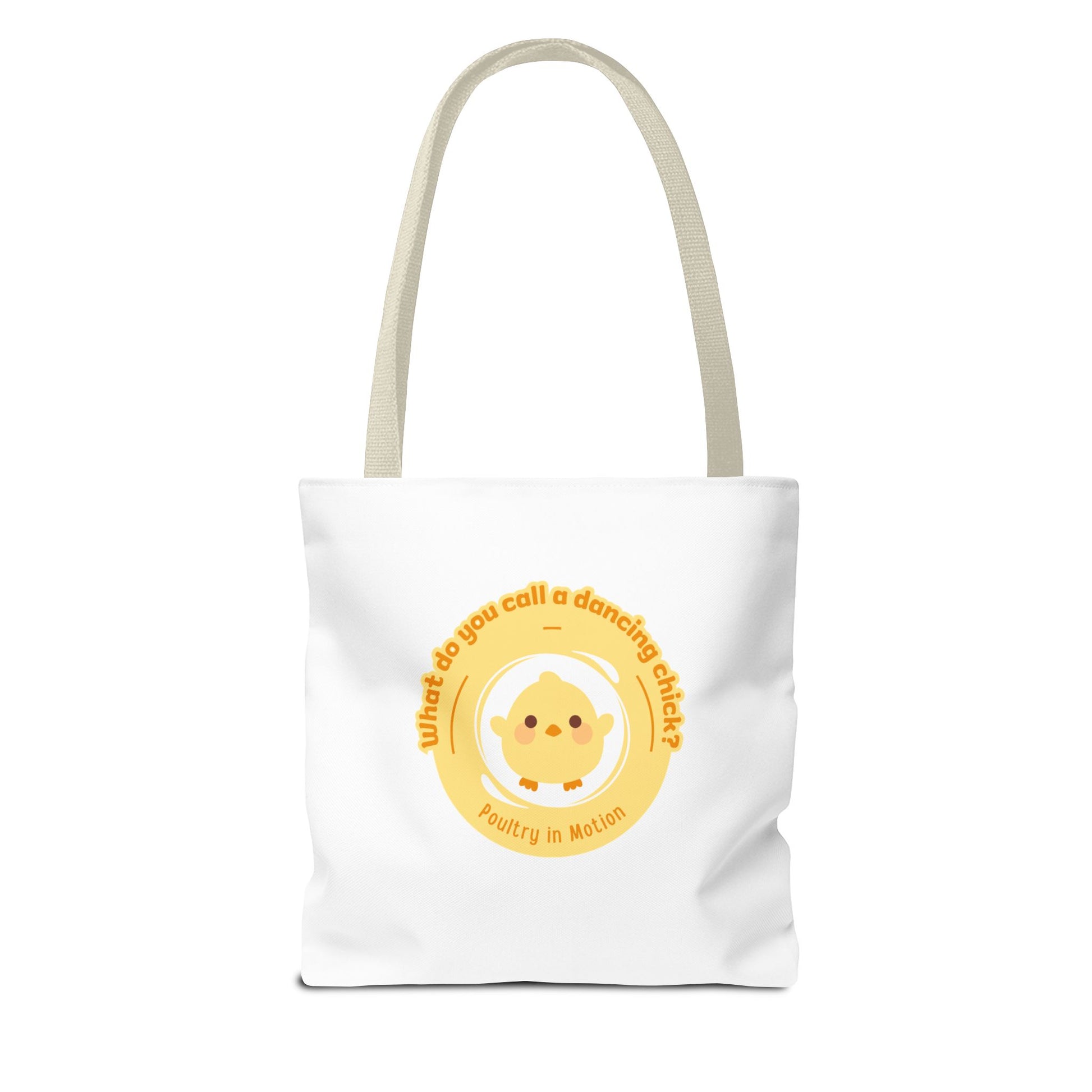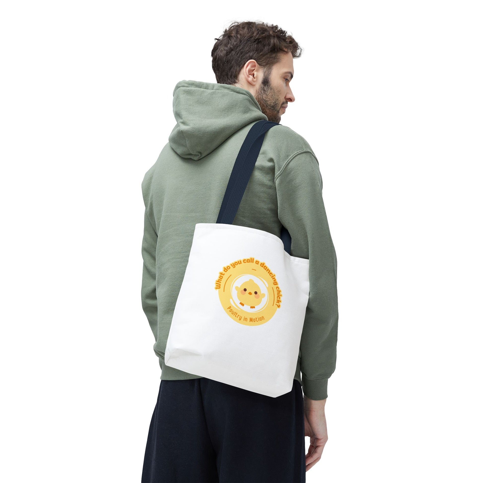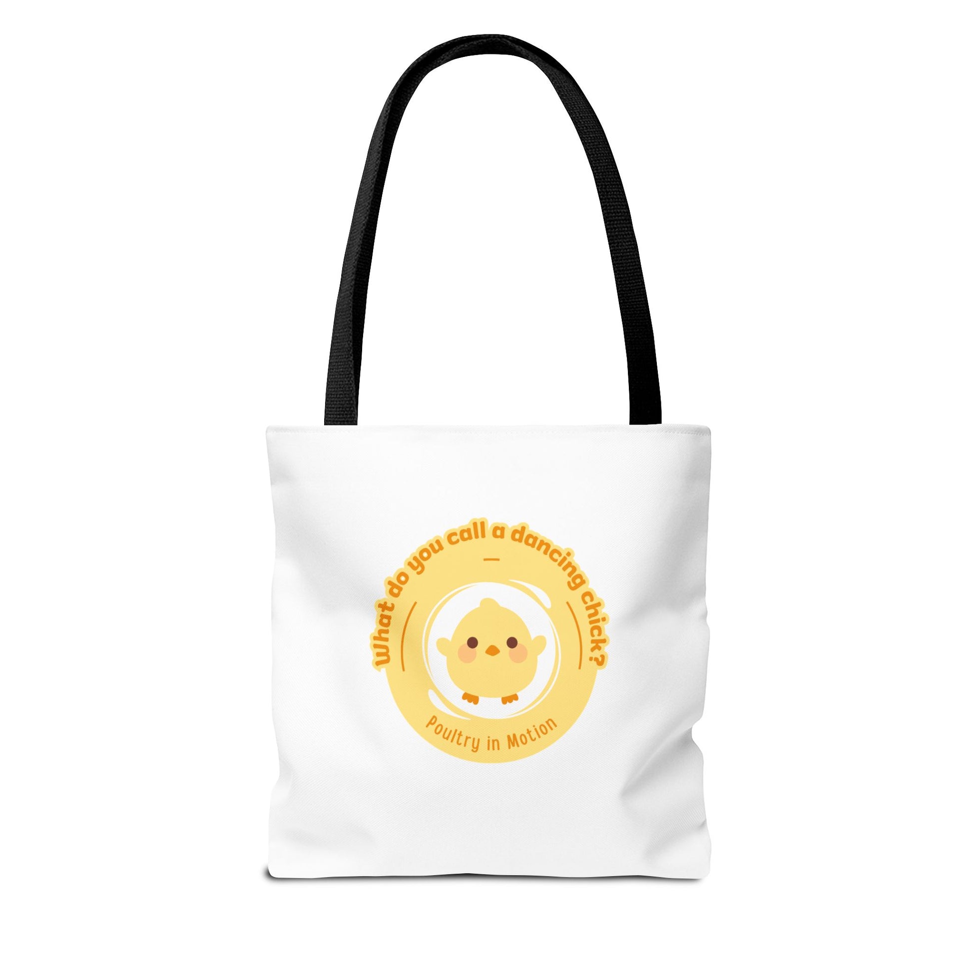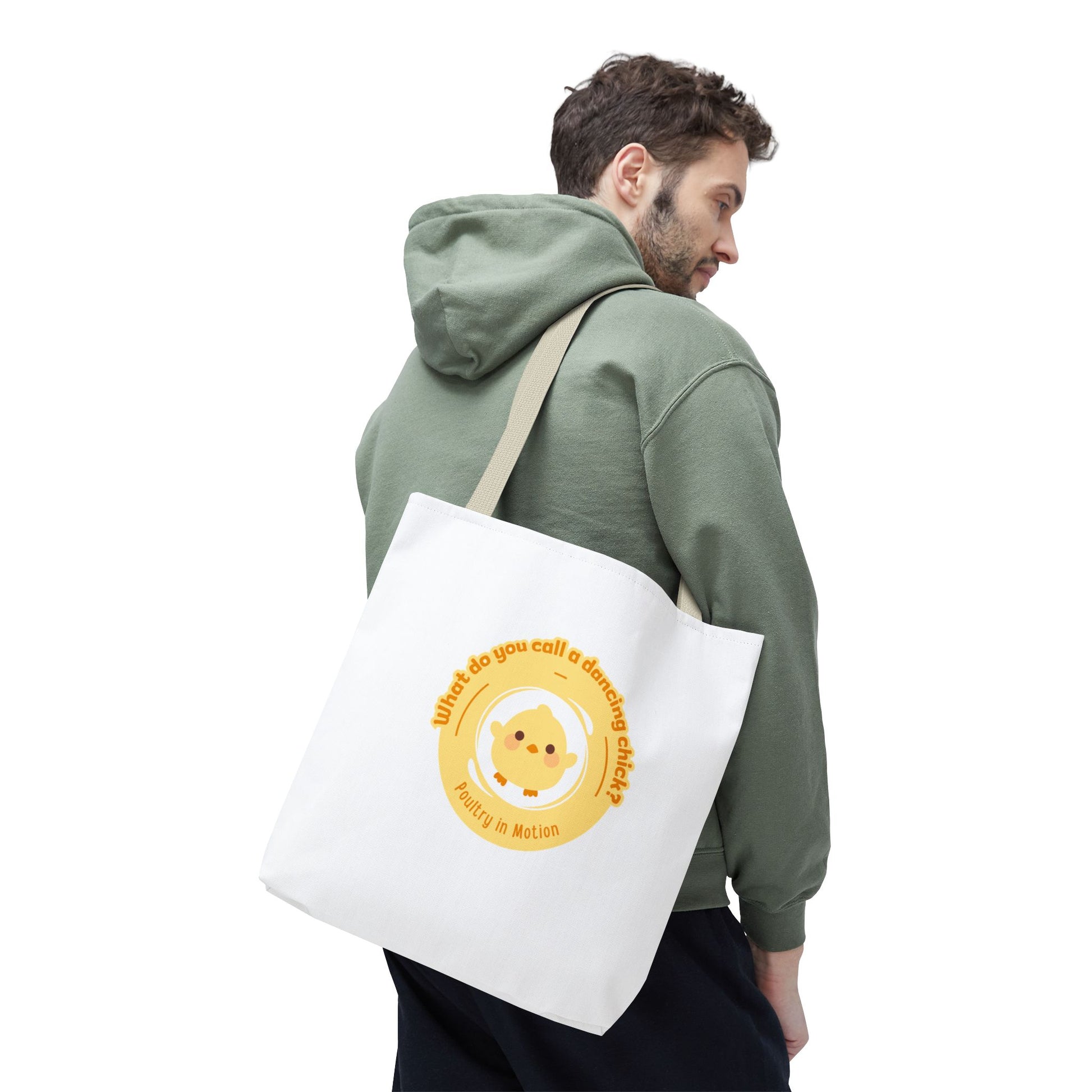 "What do you call a dancing chick? Poultry in Motion" Funny Dance Tote Bag – Kawaii Chicken Canvas Tote for Dancers & Dance Lovers