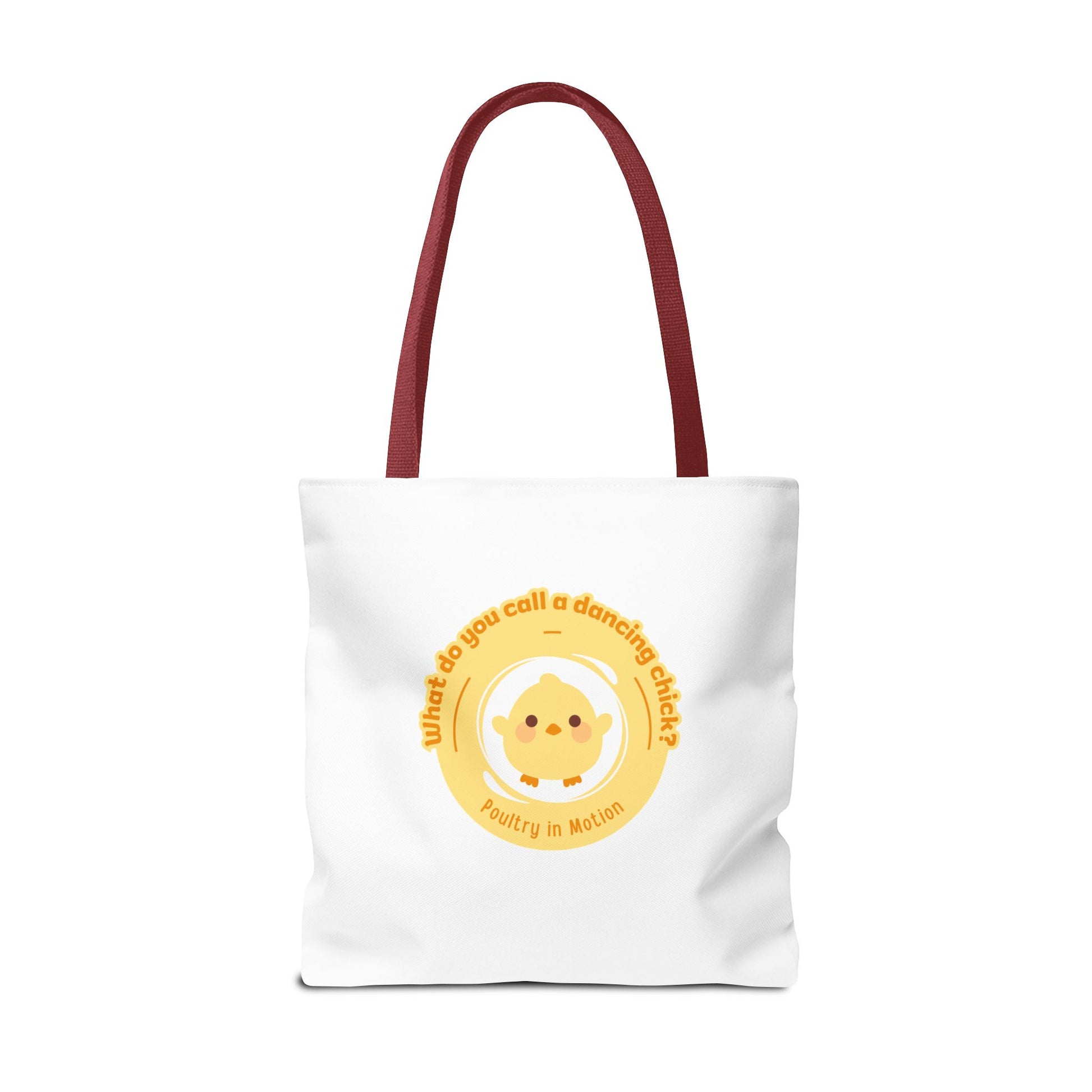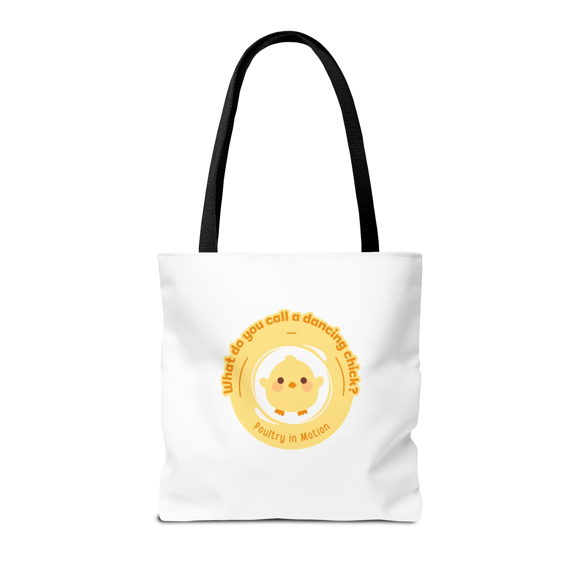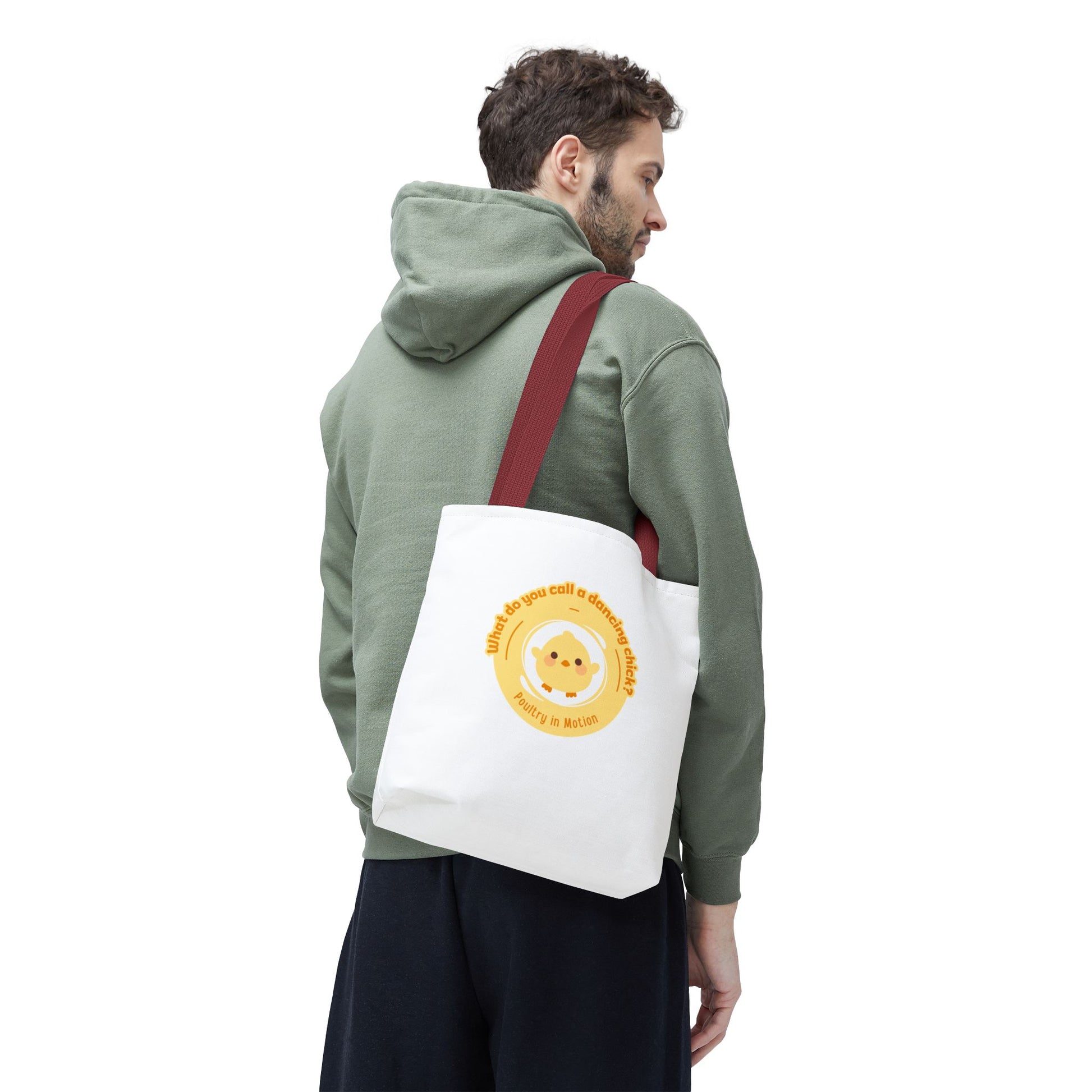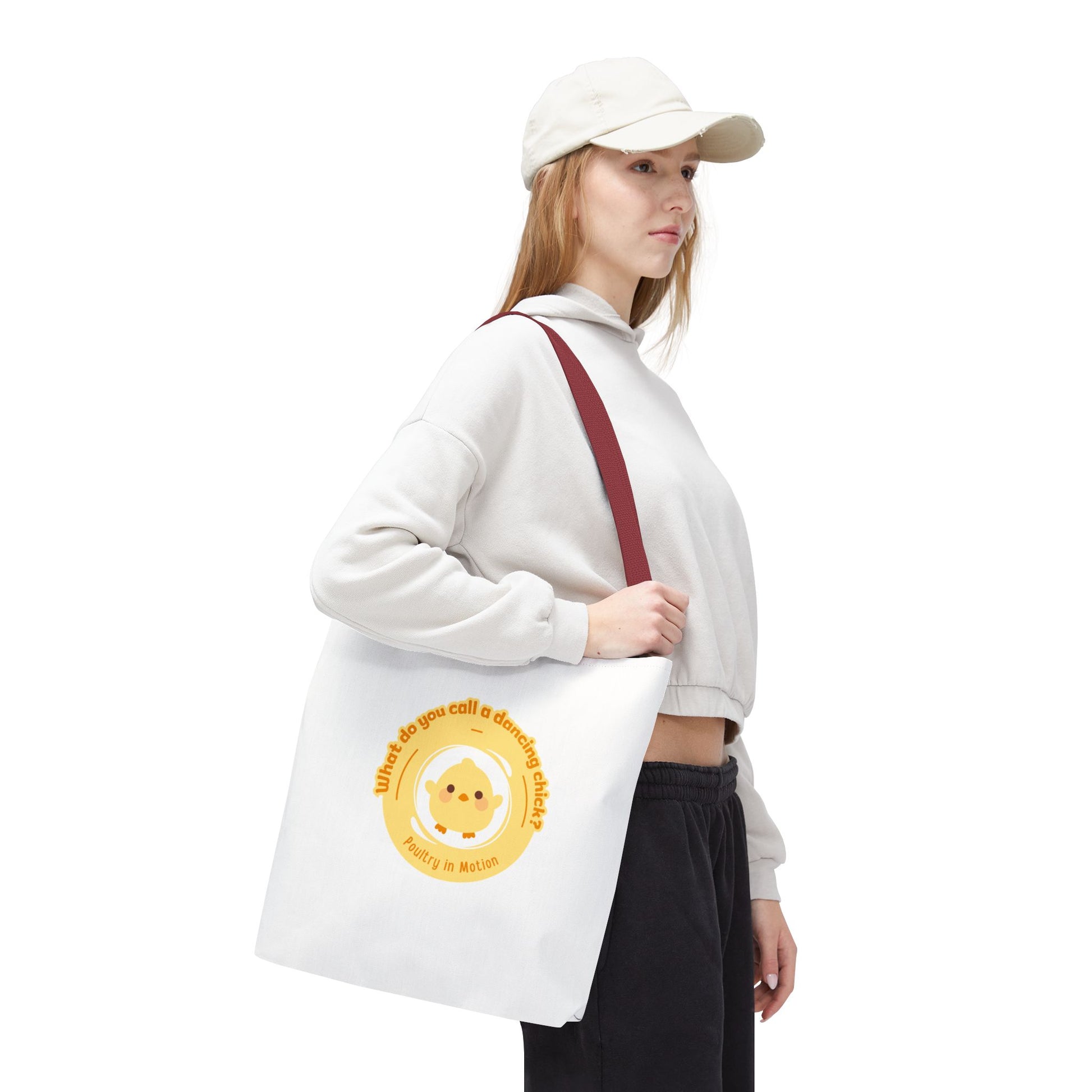"What do you call a dancing chick? Poultry in Motion" Funny Dance Tote Bag – Kawaii Chicken Canvas Tote for Dancers & Dance Lovers