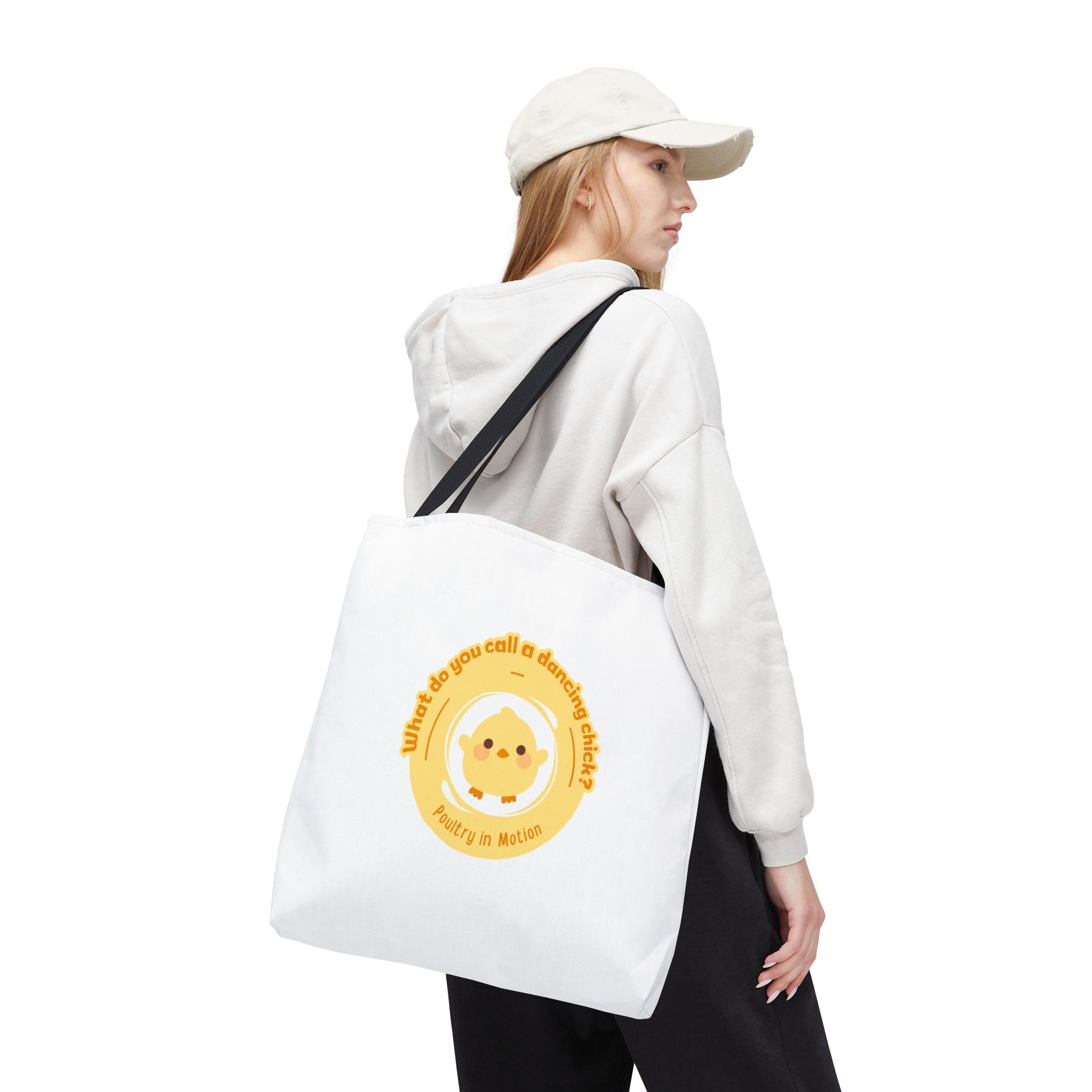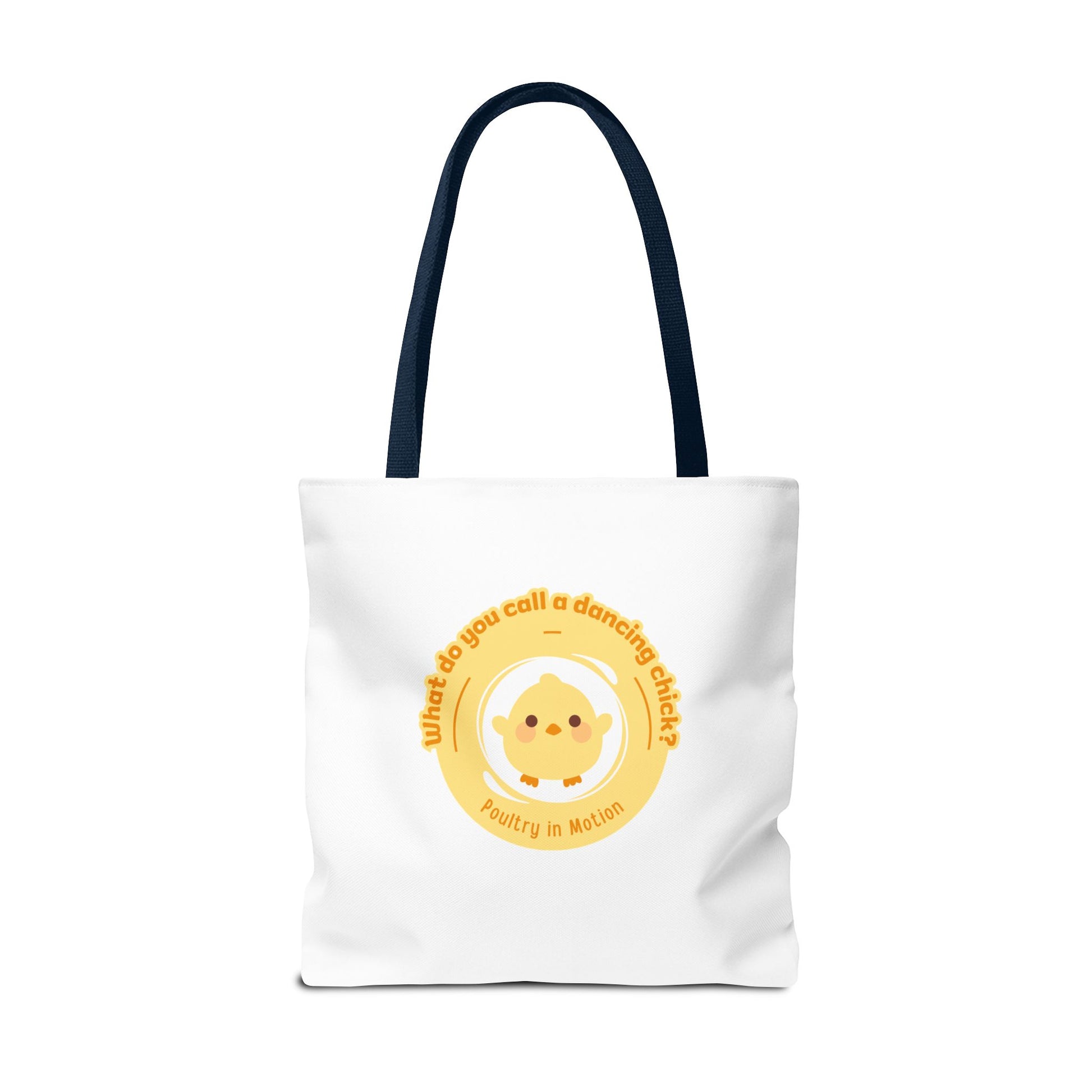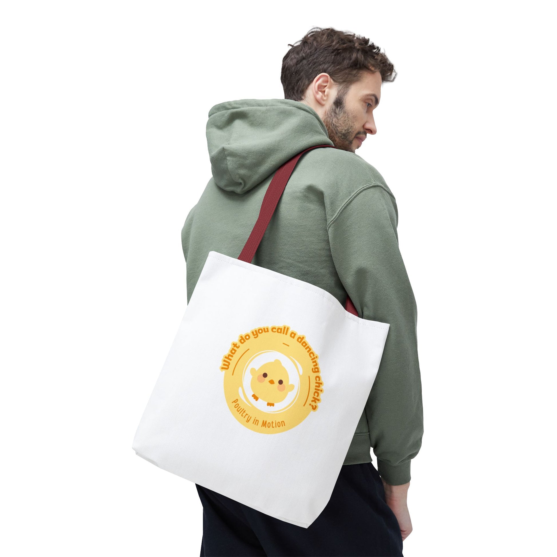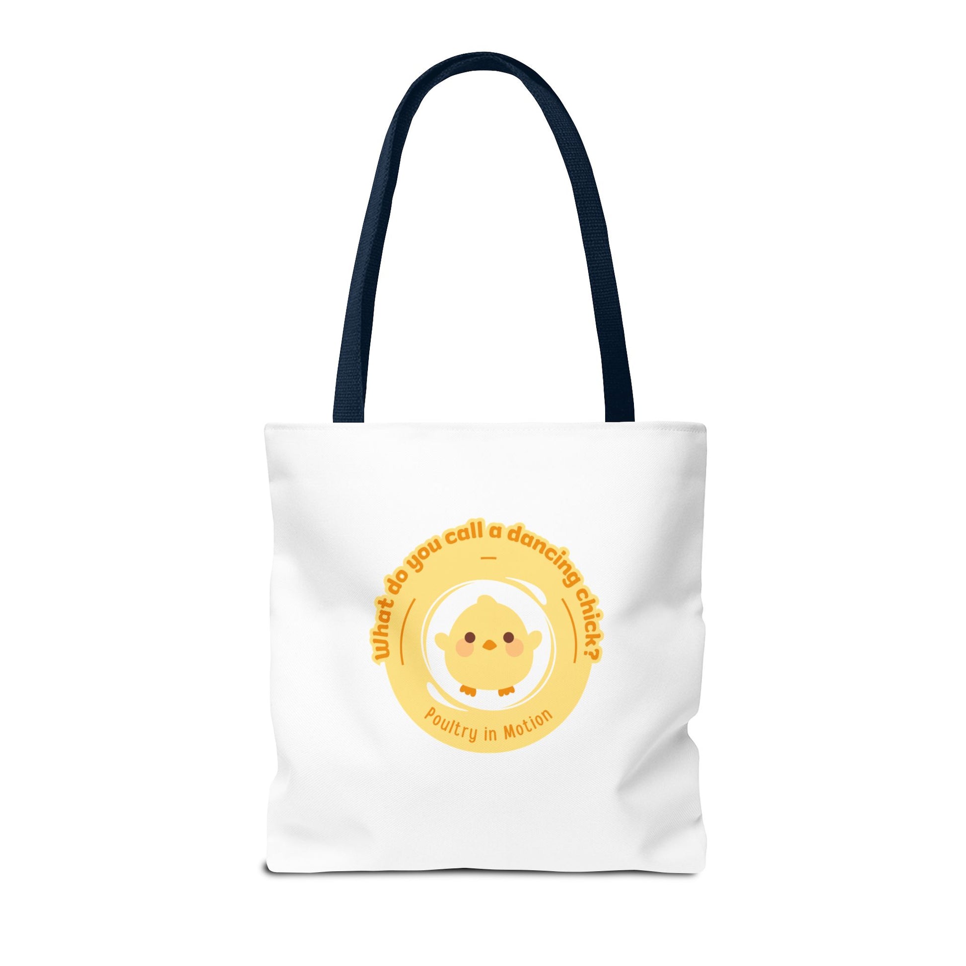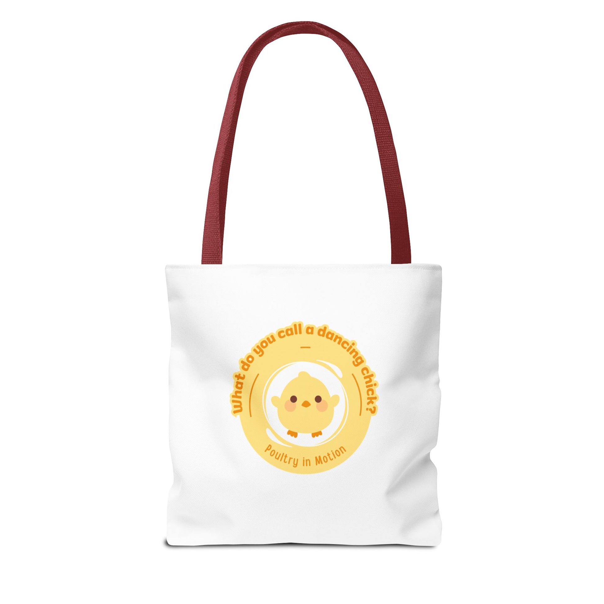"What do you call a dancing chick? Poultry in Motion" Funny Dance Tote Bag – Kawaii Chicken Canvas Tote for Dancers & Dance Lovers