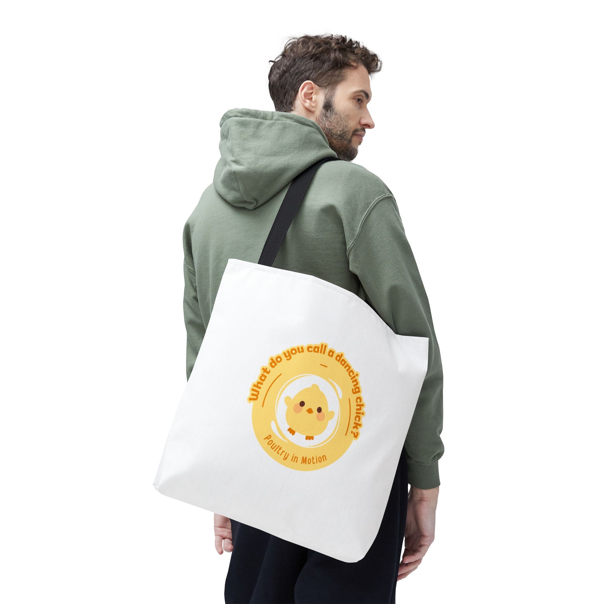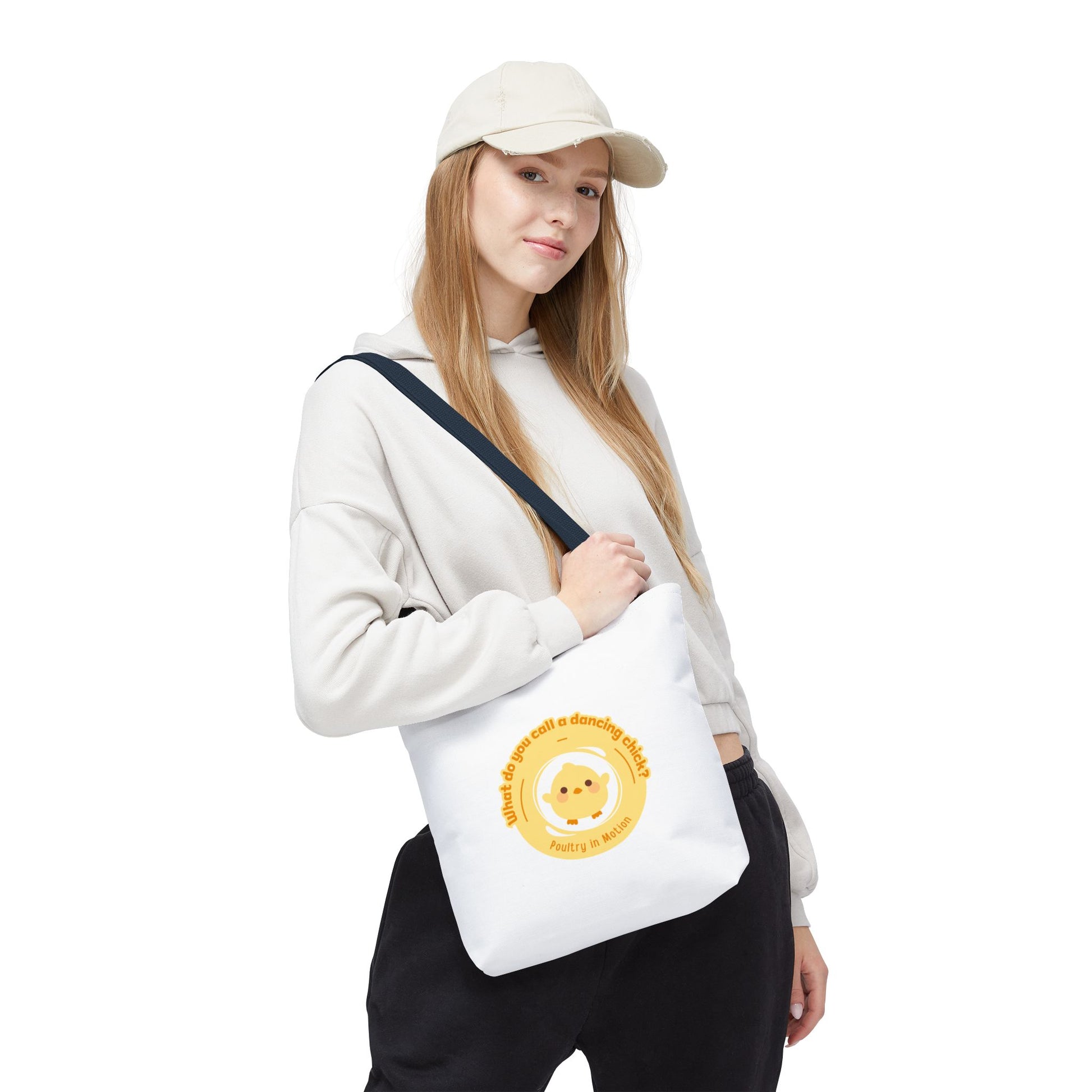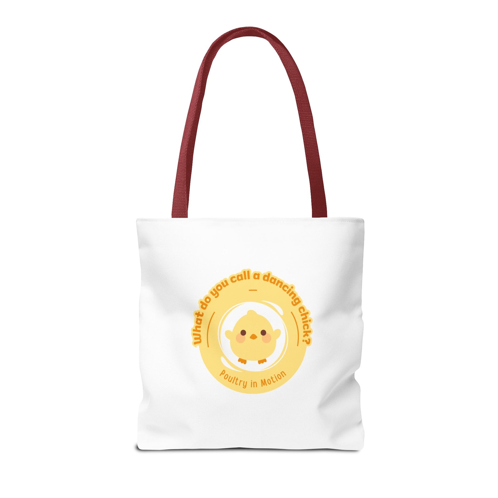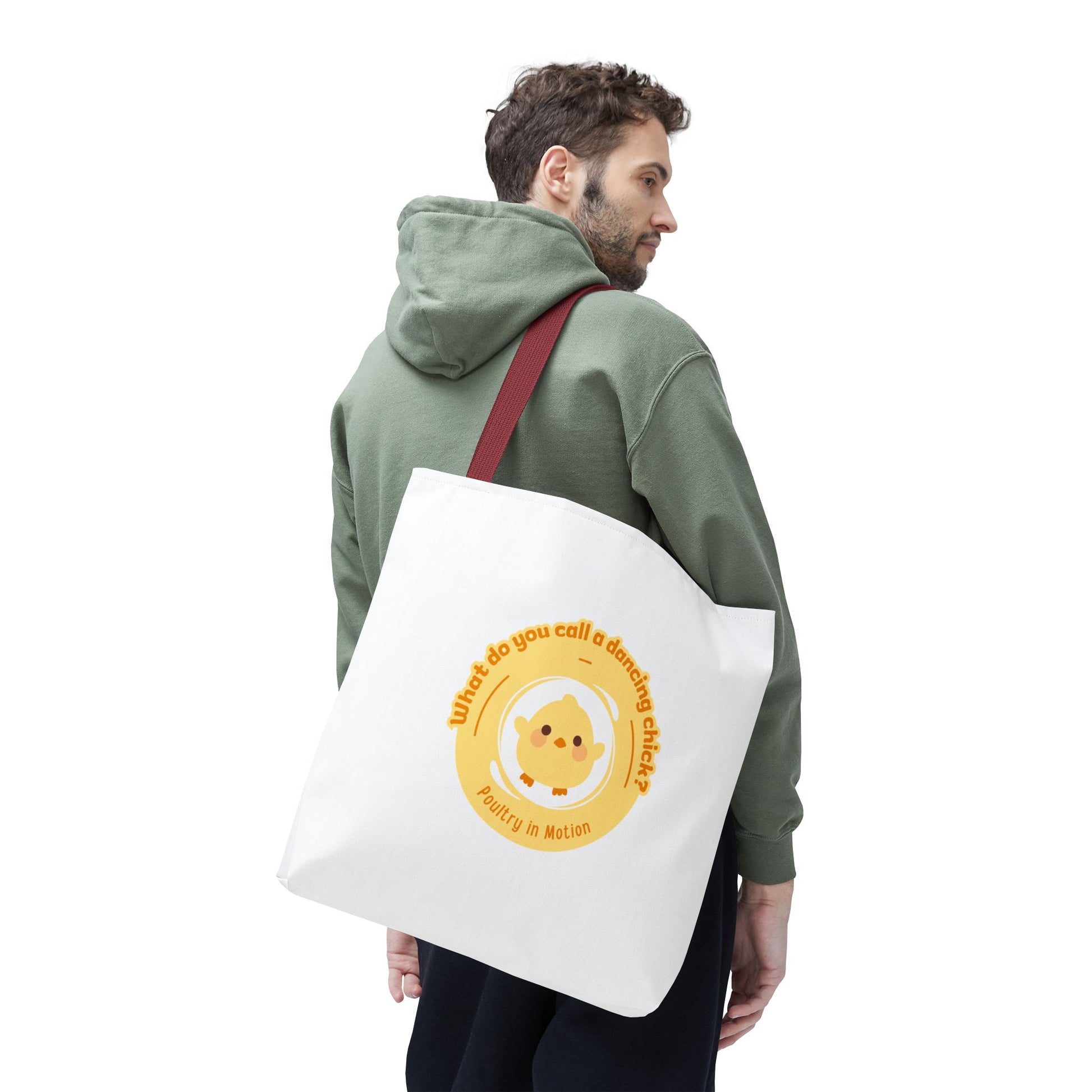 "What do you call a dancing chick? Poultry in Motion" Funny Dance Tote Bag – Kawaii Chicken Canvas Tote for Dancers & Dance Lovers
