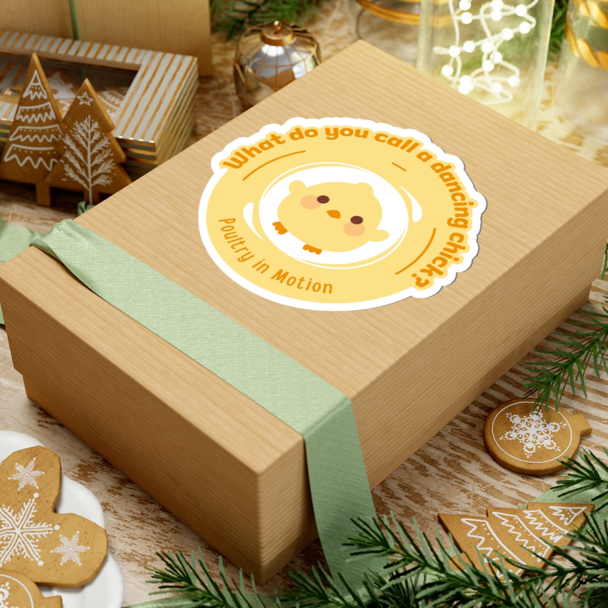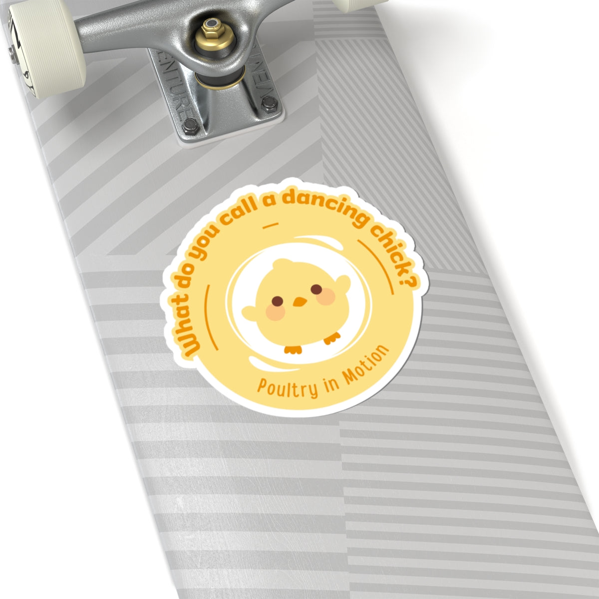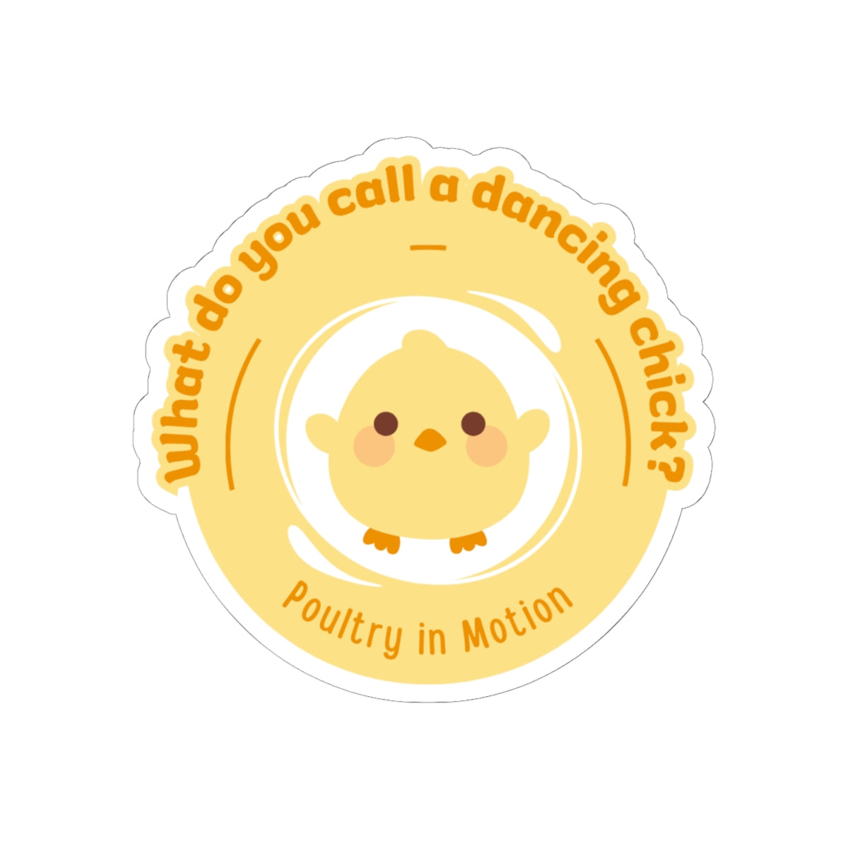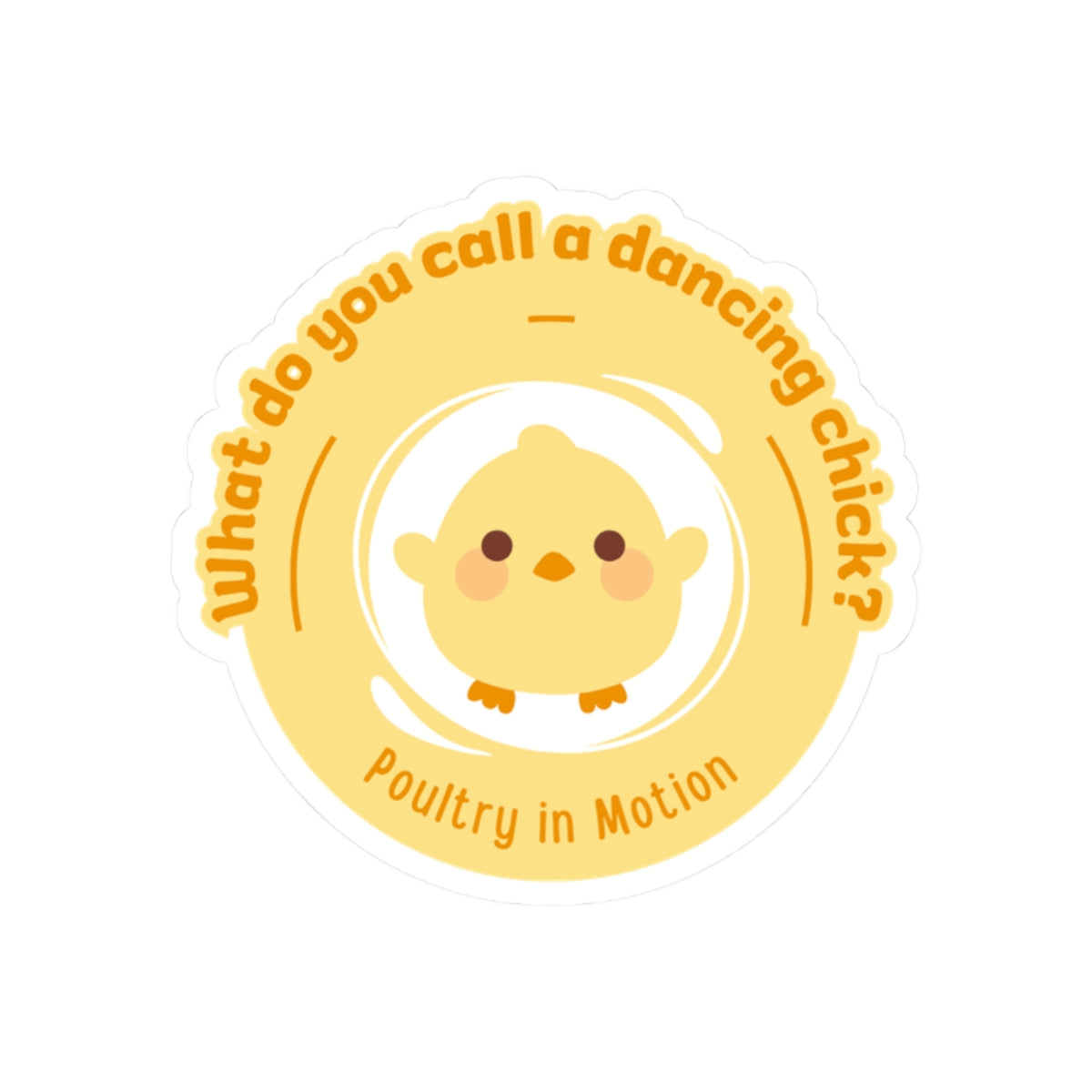 "What do you call a dancing chick? Poultry in Motion." Kiss-Cut Sticker – Funny Dancing Chicken Pun – Cute Dance-Themed Vinyl Sticker for Laptops, Journals & Water Bottles