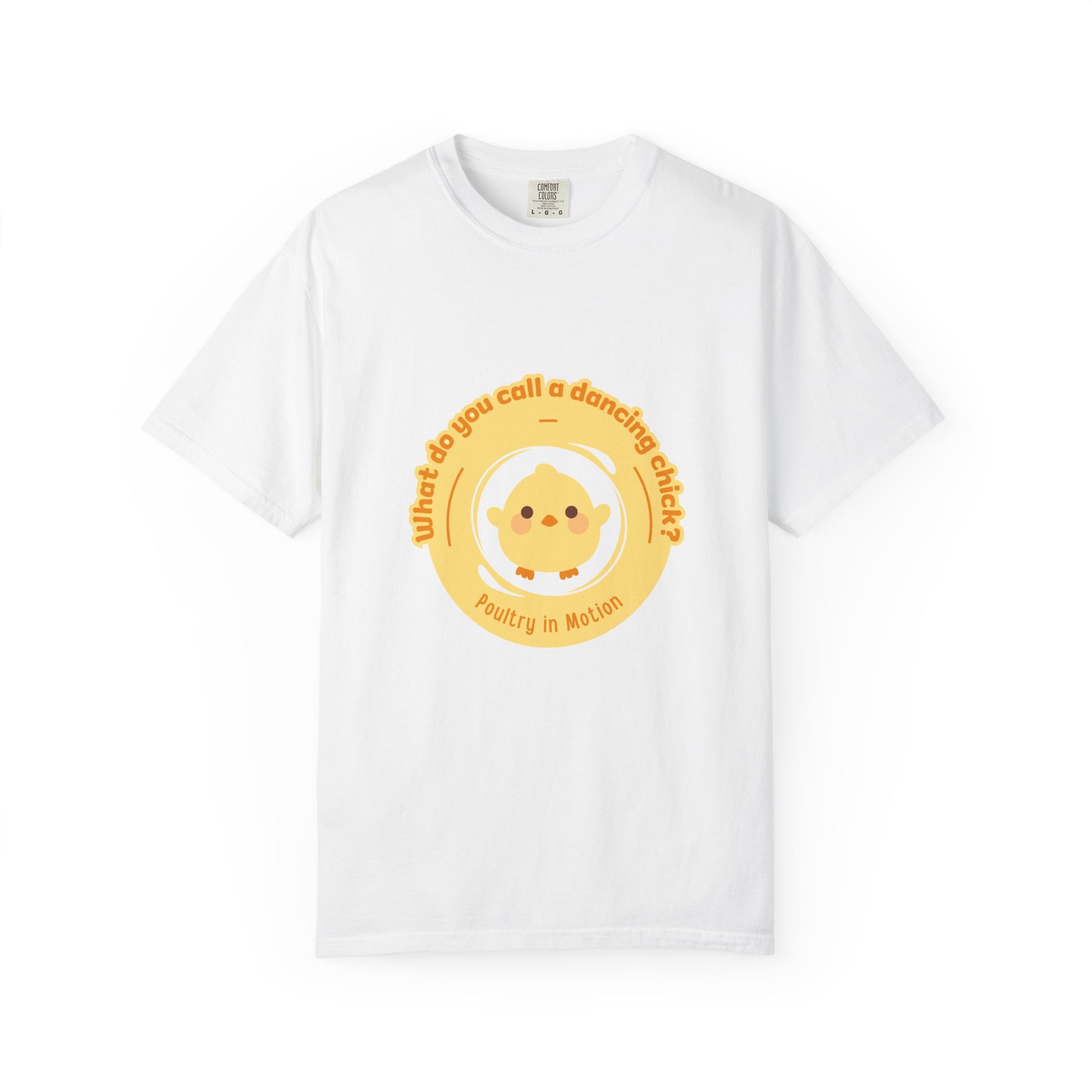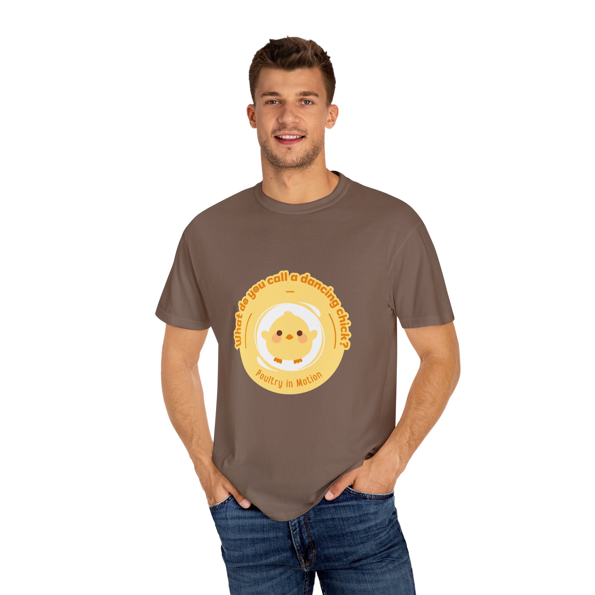 "What Do You Call a Dancing Chick? Poultry in Motion." Unisex Garment-Dyed T-Shirt – Funny Dance Pun Tee with Kawaii Chicken Graphic