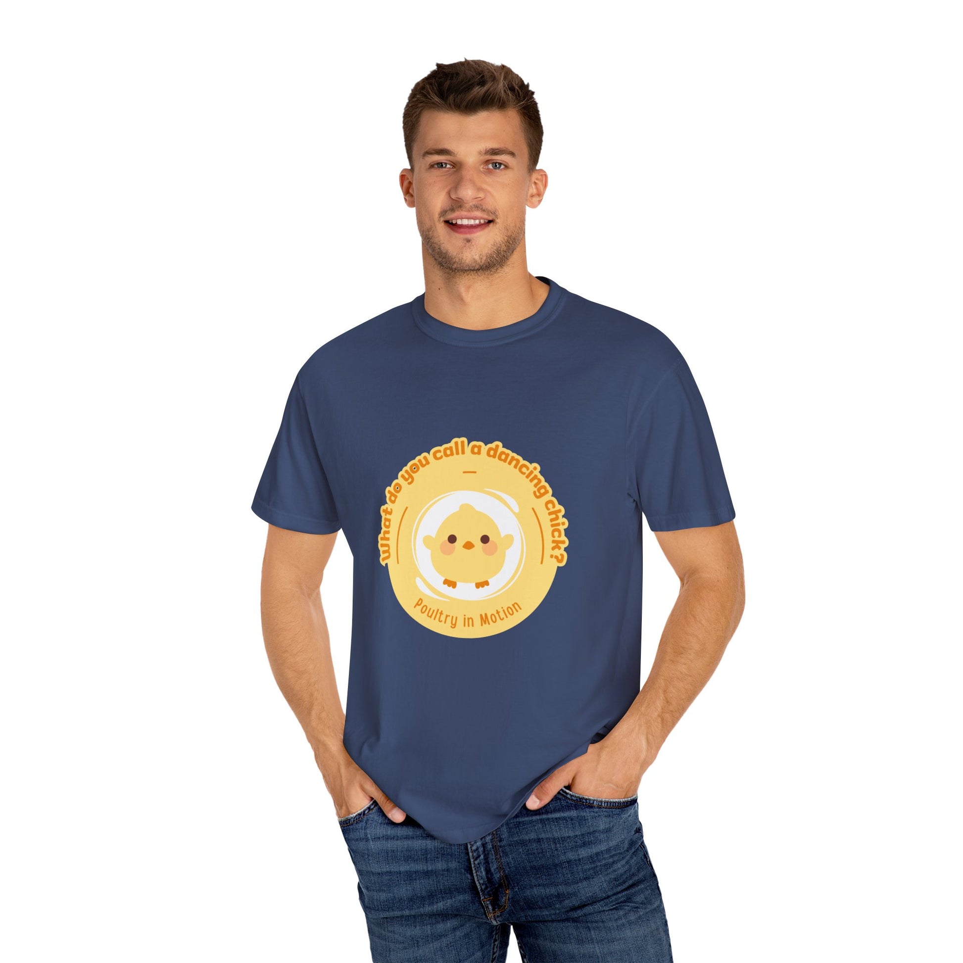 “What Do You Call a Dancing Chick? Poultry in Motion” Unisex Garment-Dyed T-Shirt