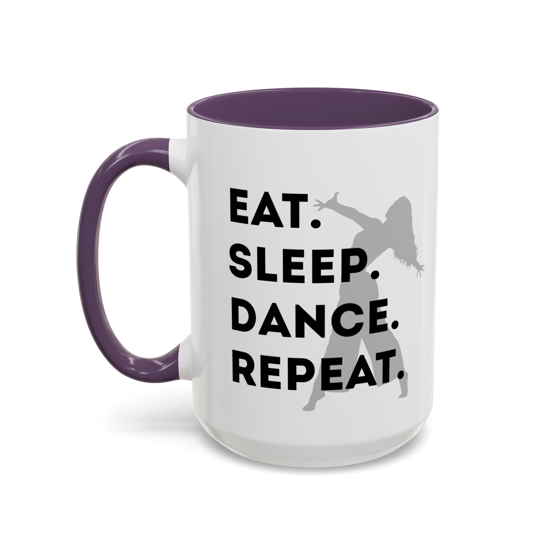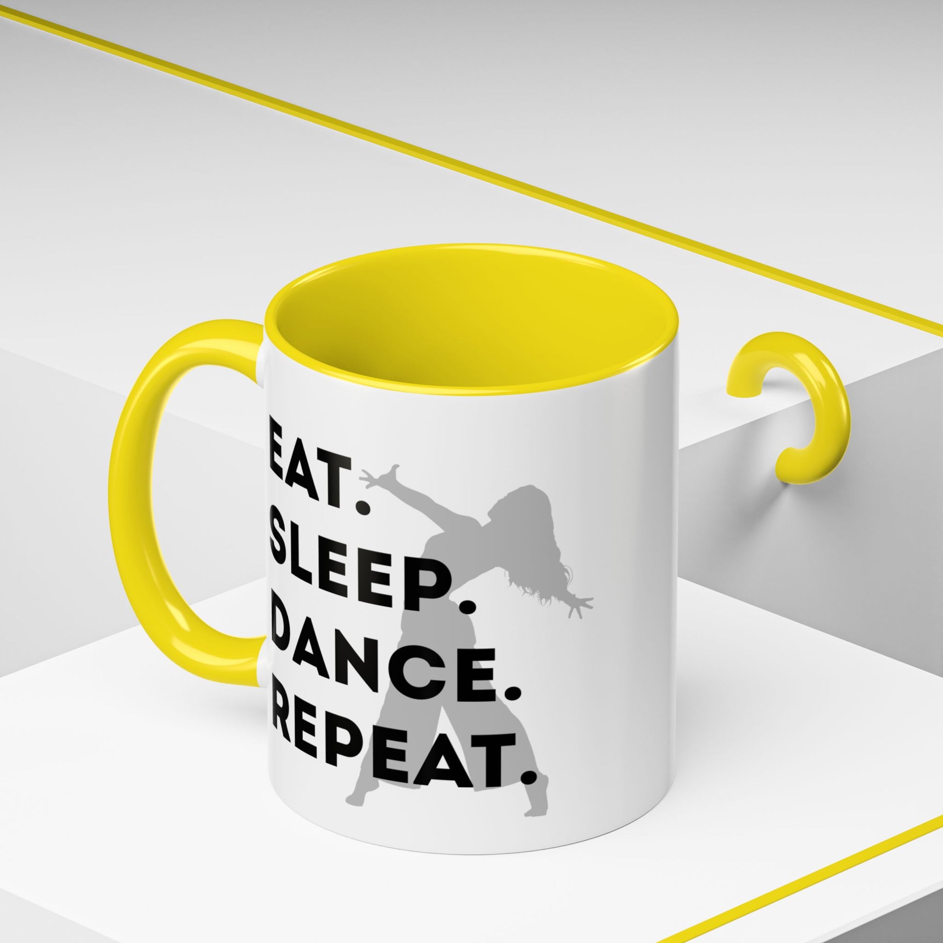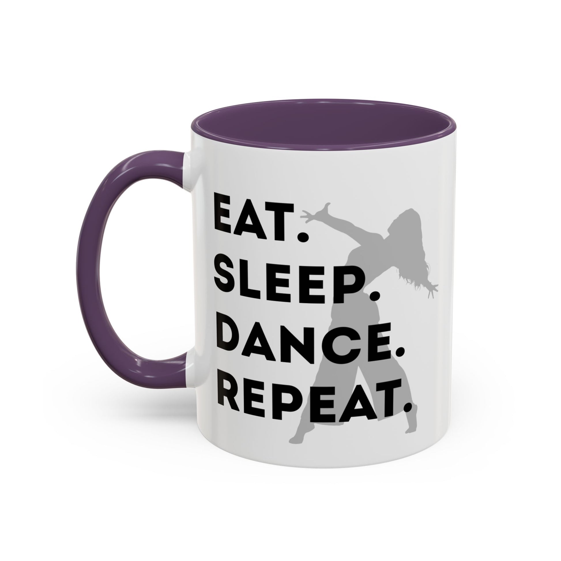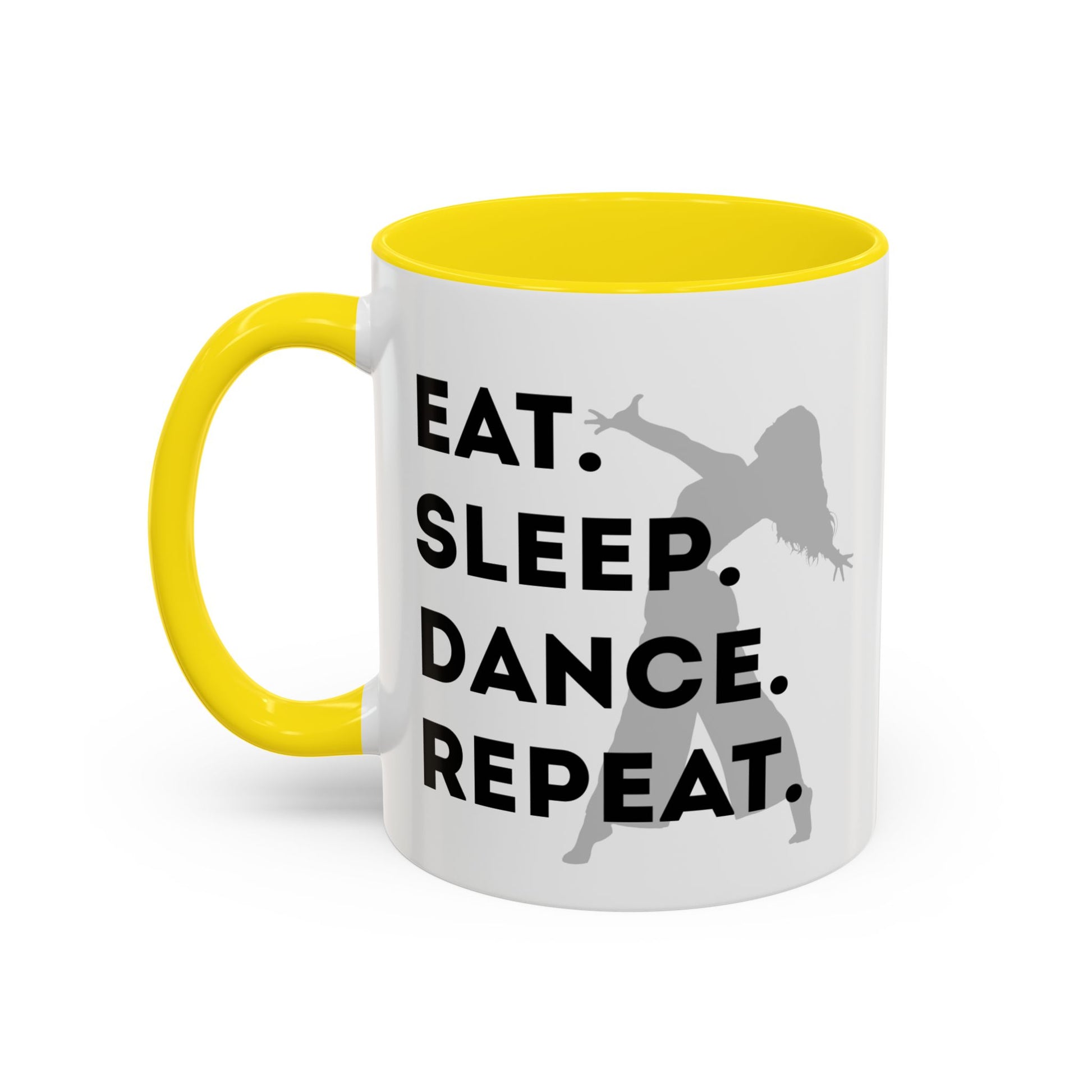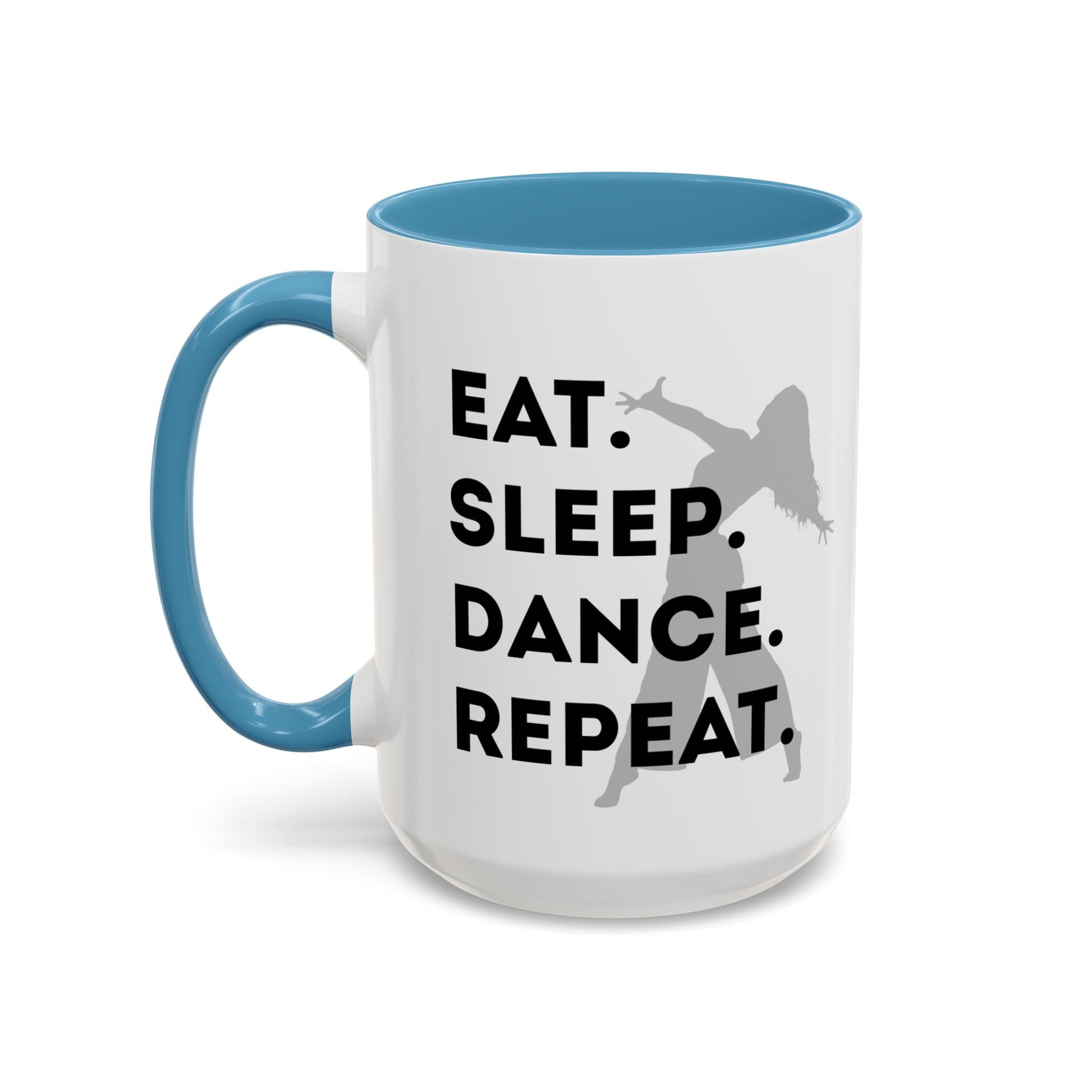 Fuel your mornings with rhythm and style with the "Eat Sleep Dance Repeat" Accent Coffee Mug! Featuring a sleek female dancer graphic and bold lettering that celebrates your nonstop passion for movement, this vibrant ceramic mug is perfect for dancers who live life one 8-count at a time. 🎶💥