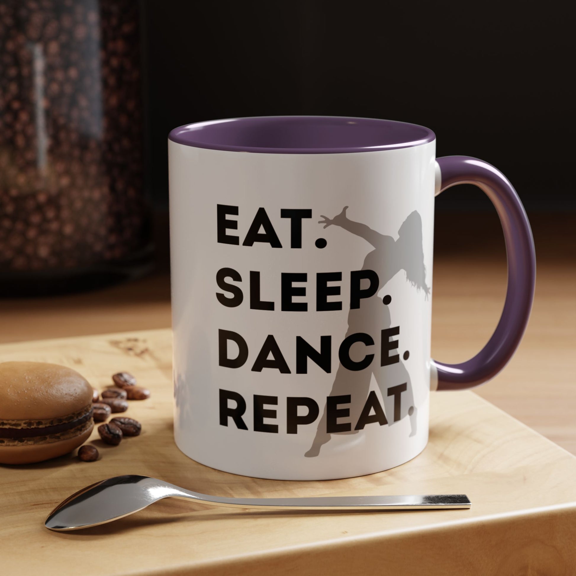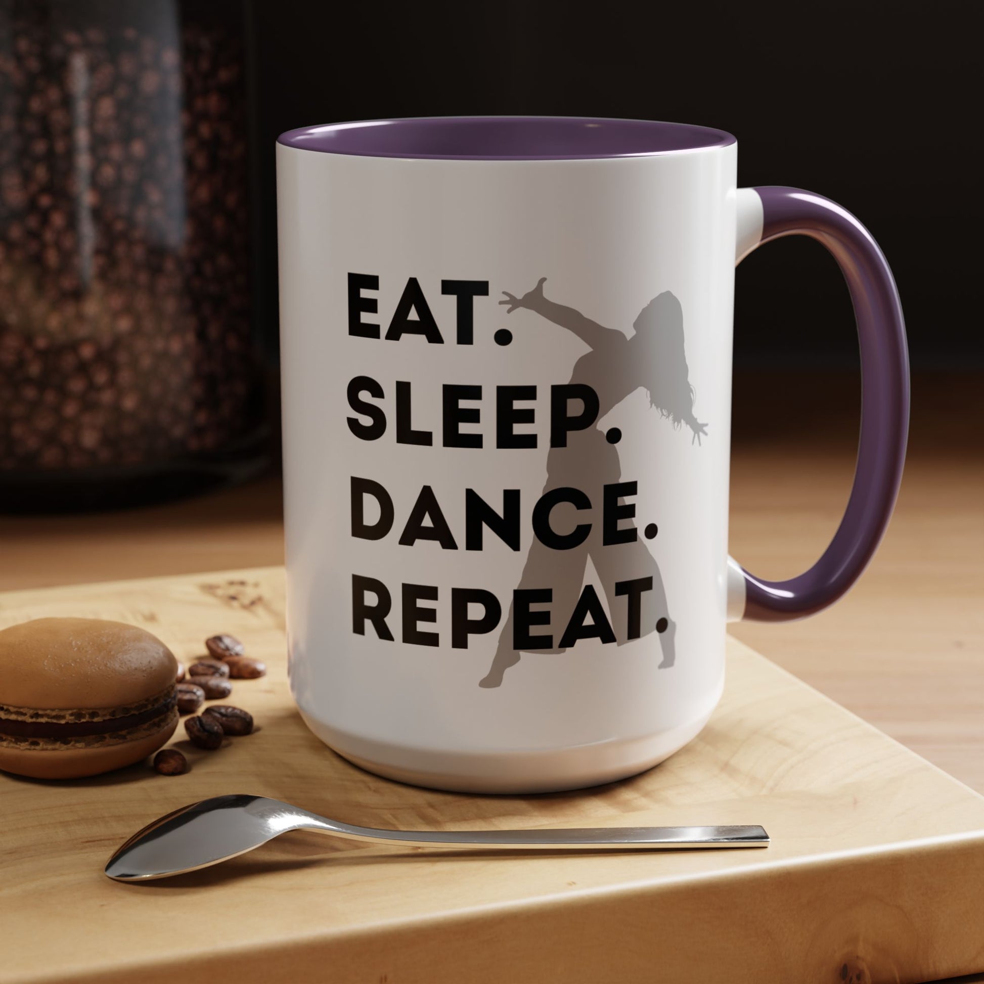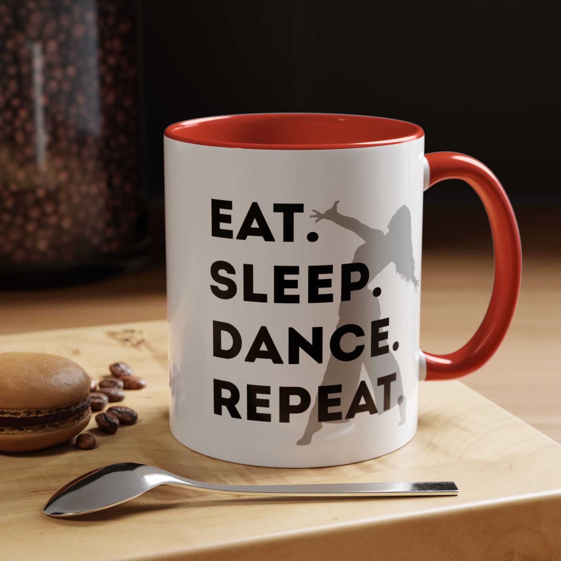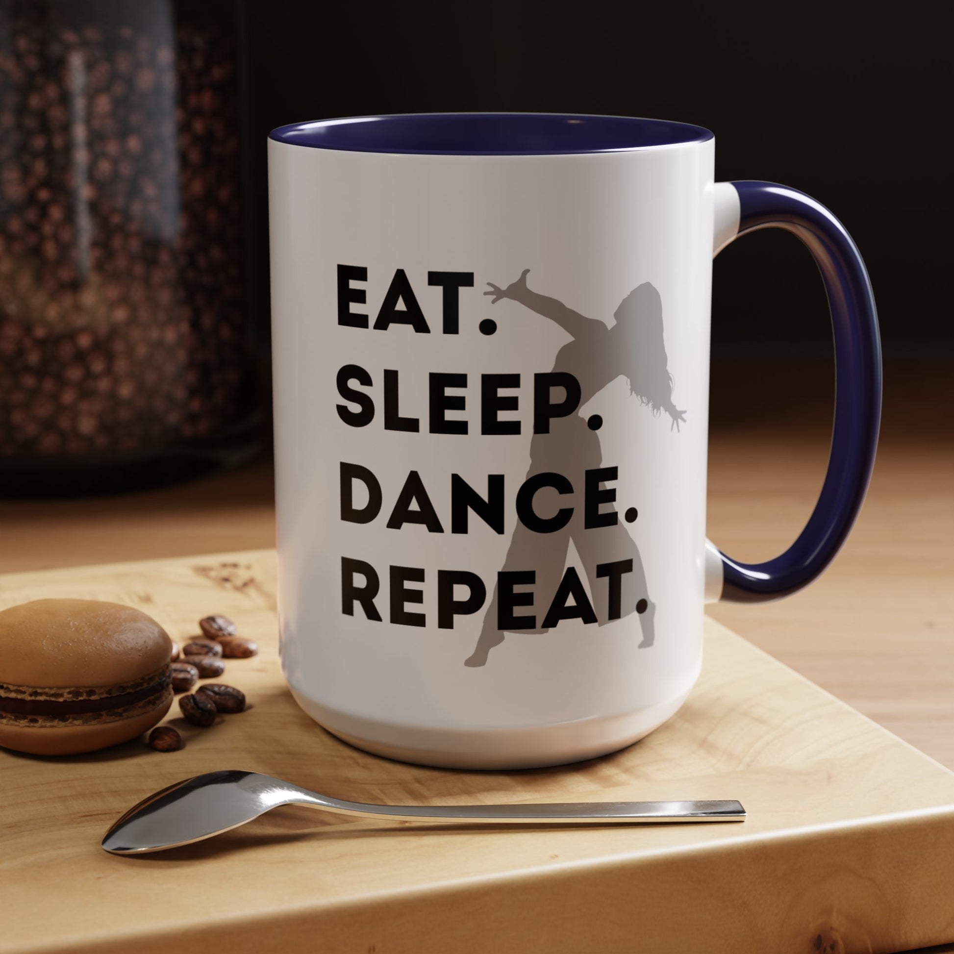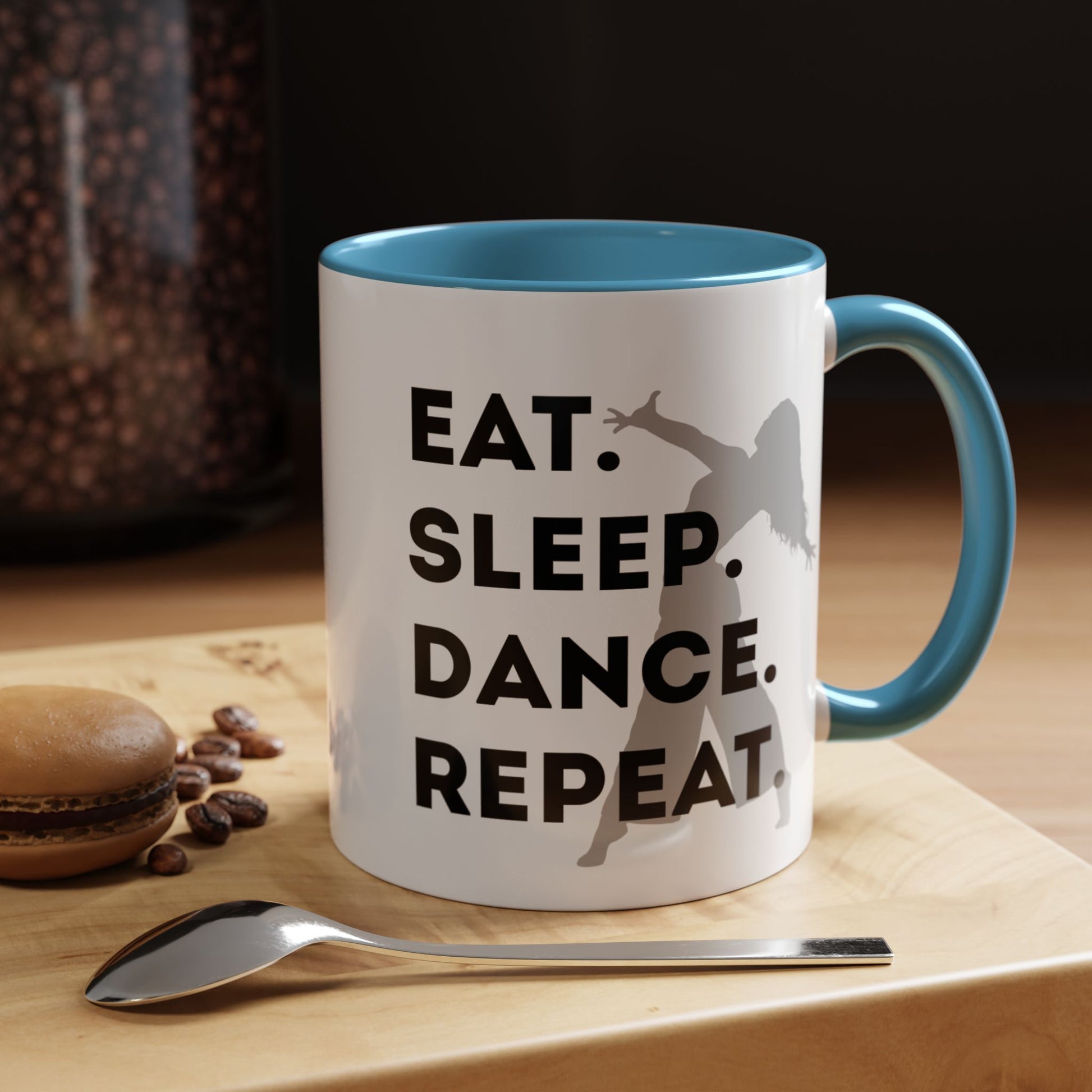 Fuel your mornings with rhythm and style with the "Eat Sleep Dance Repeat" Accent Coffee Mug! Featuring a sleek female dancer graphic and bold lettering that celebrates your nonstop passion for movement, this vibrant ceramic mug is perfect for dancers who live life one 8-count at a time. 🎶💥