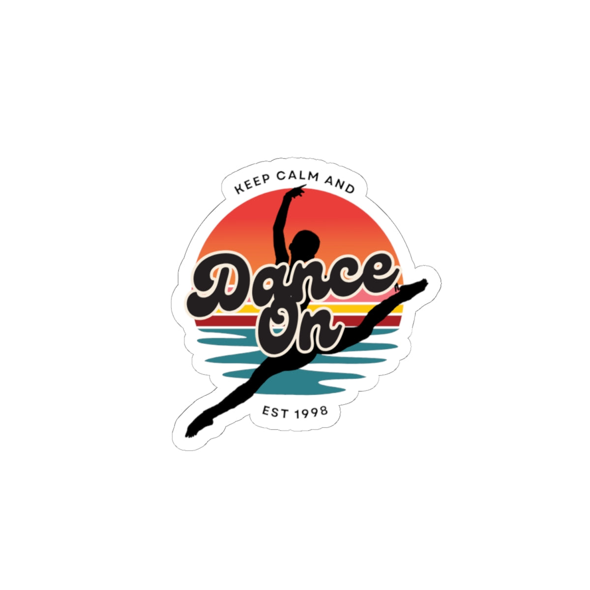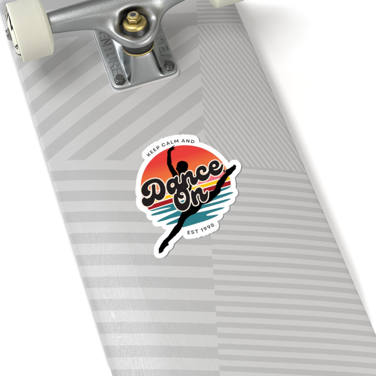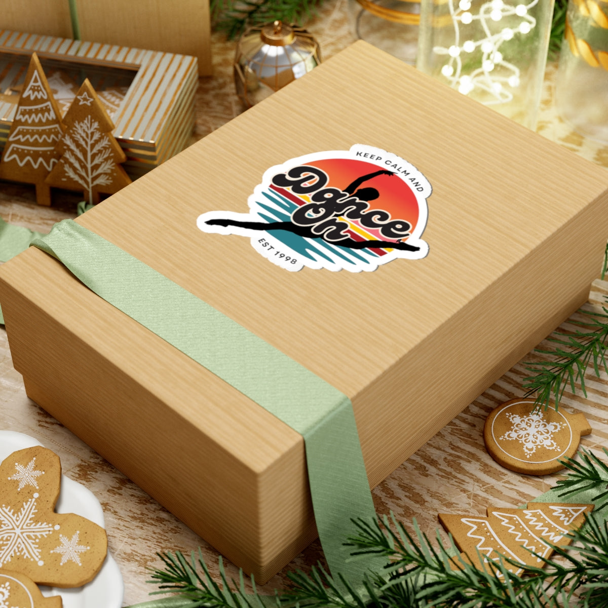 "Keep Calm and Dance On" Kiss-Cut Sticker – Retro Dancer Graphic – Motivational Dance-Themed Vinyl Sticker for Laptops, Journals & Water Bottles