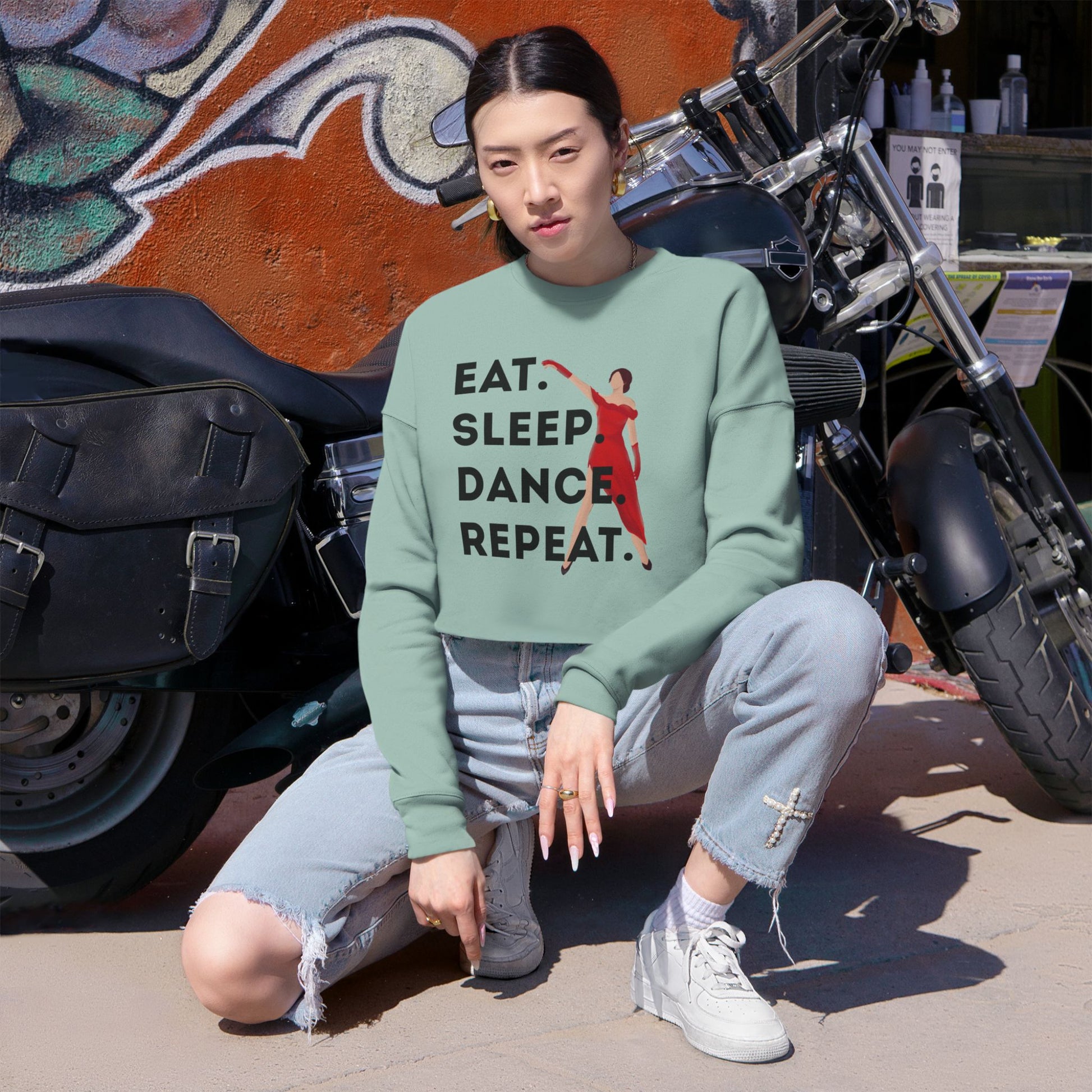 "Eat, Sleep, Dance, Repeat" Women’s Cropped Dance Sweatshirt – Bold Dancer Graphic | Trendy Streetwear for Dance Lovers & Performers
