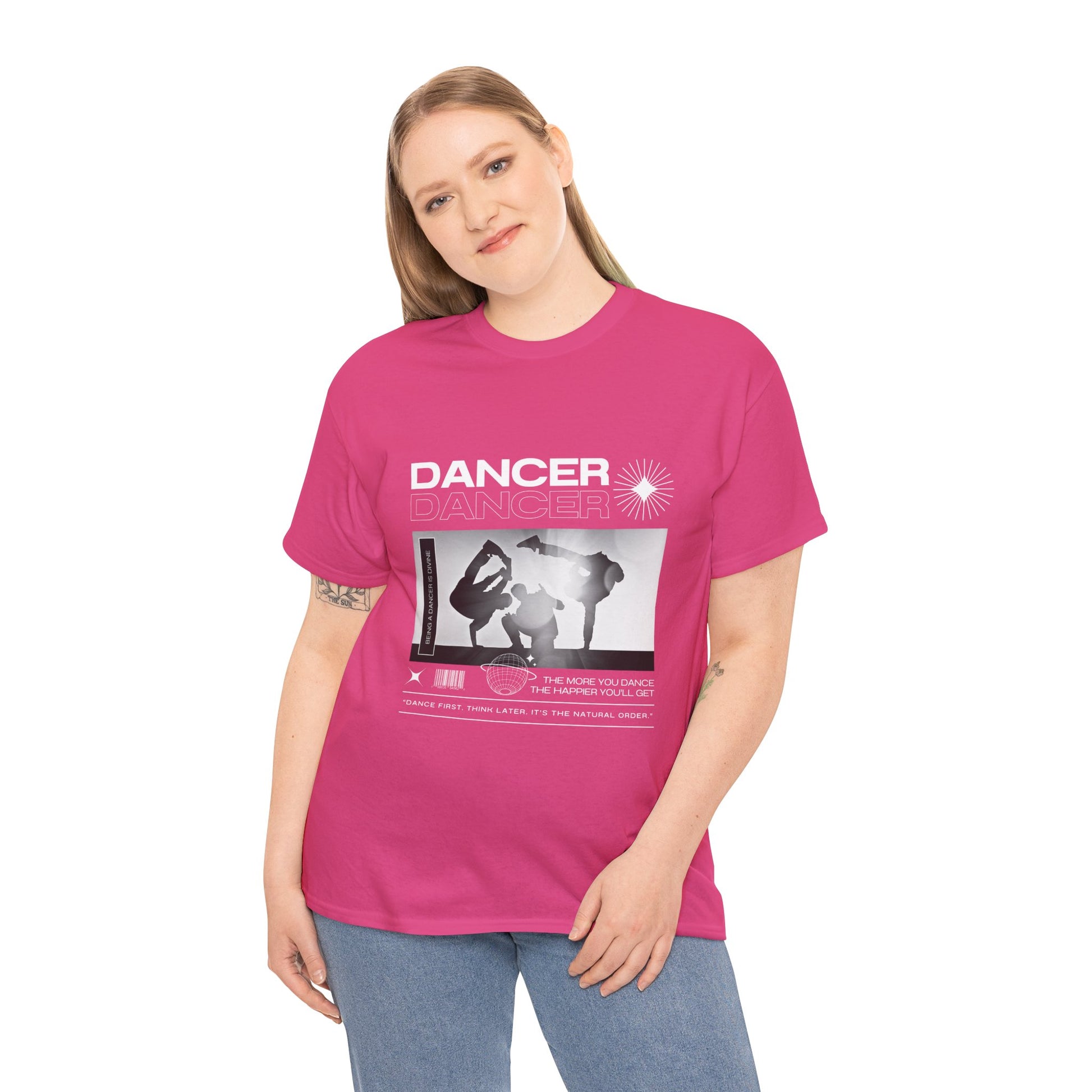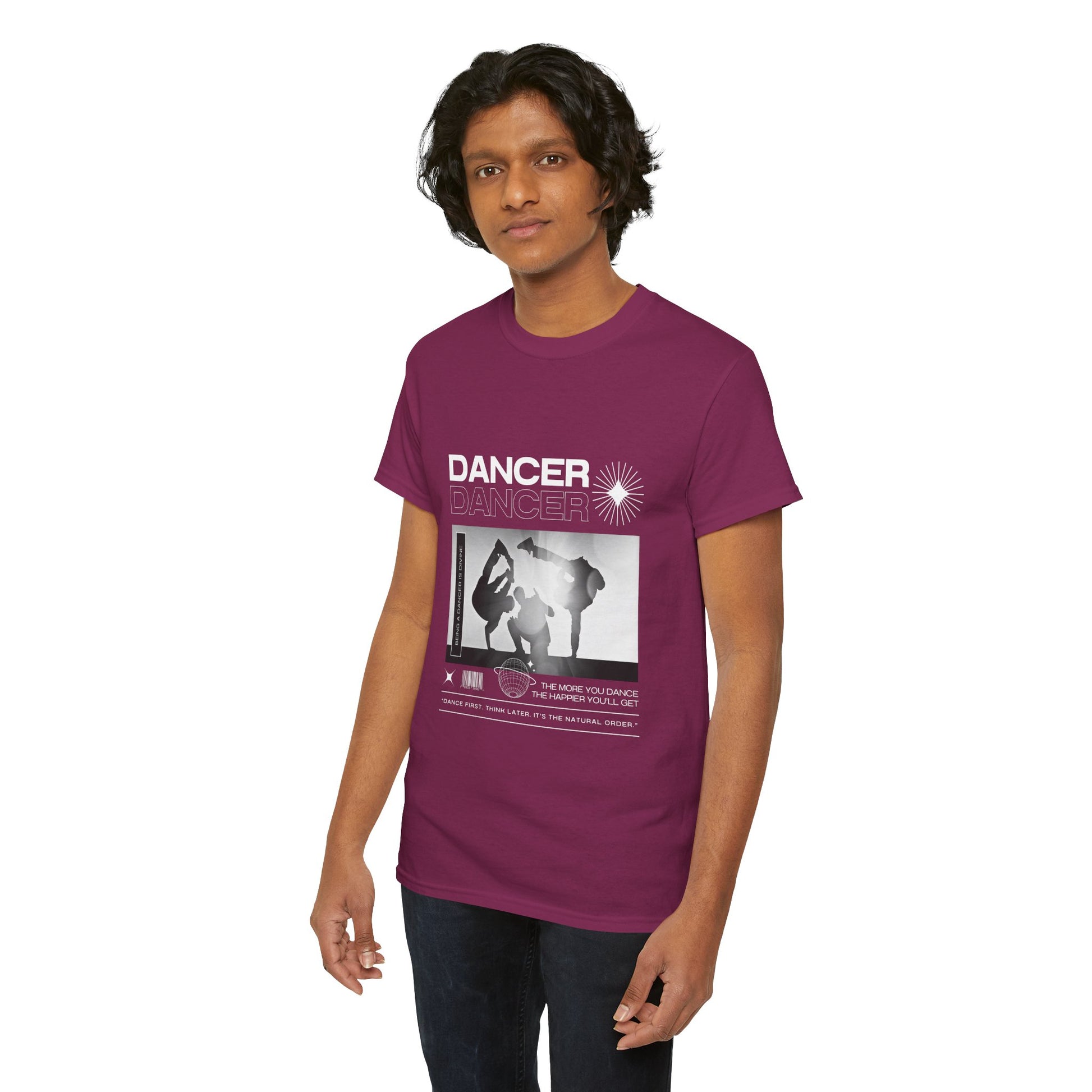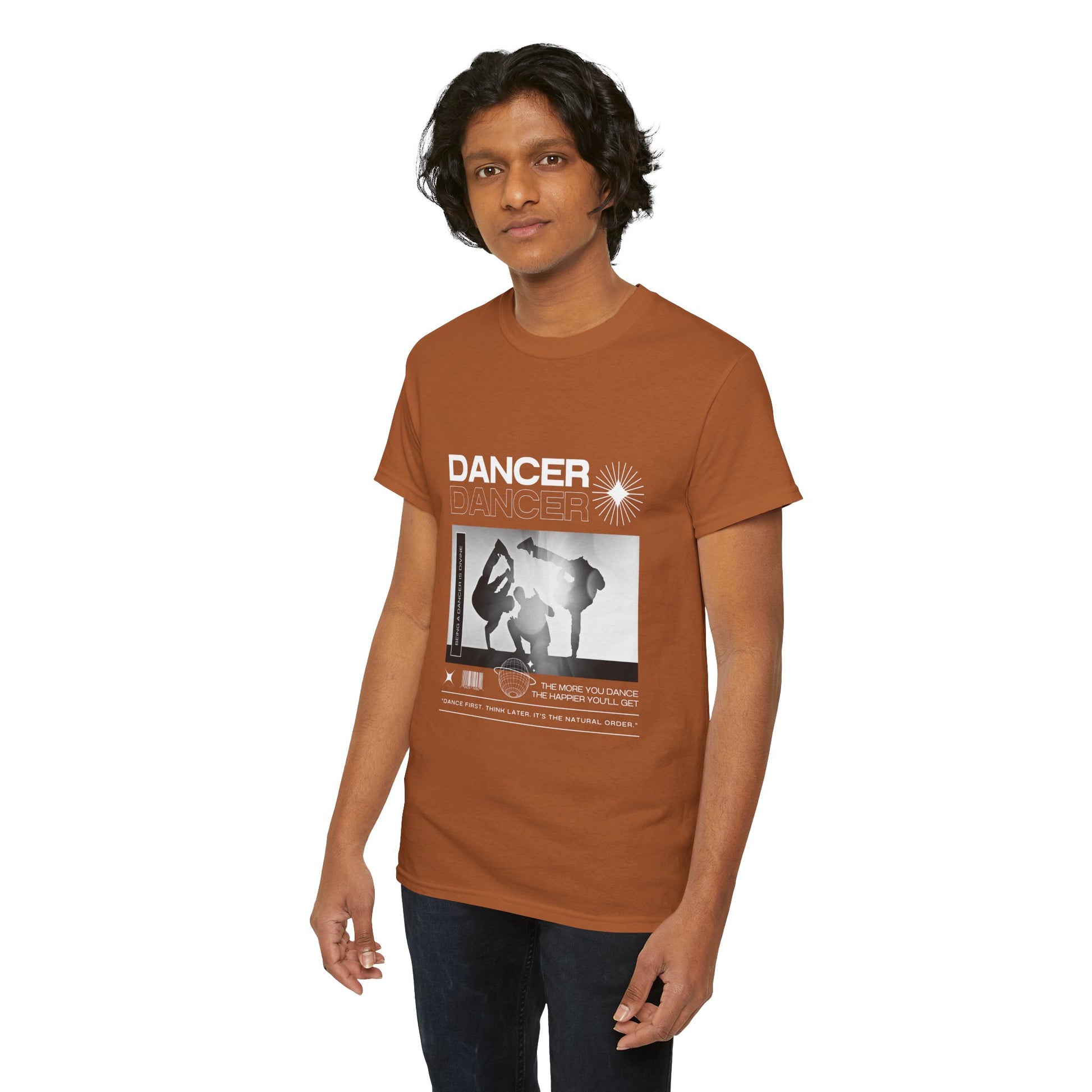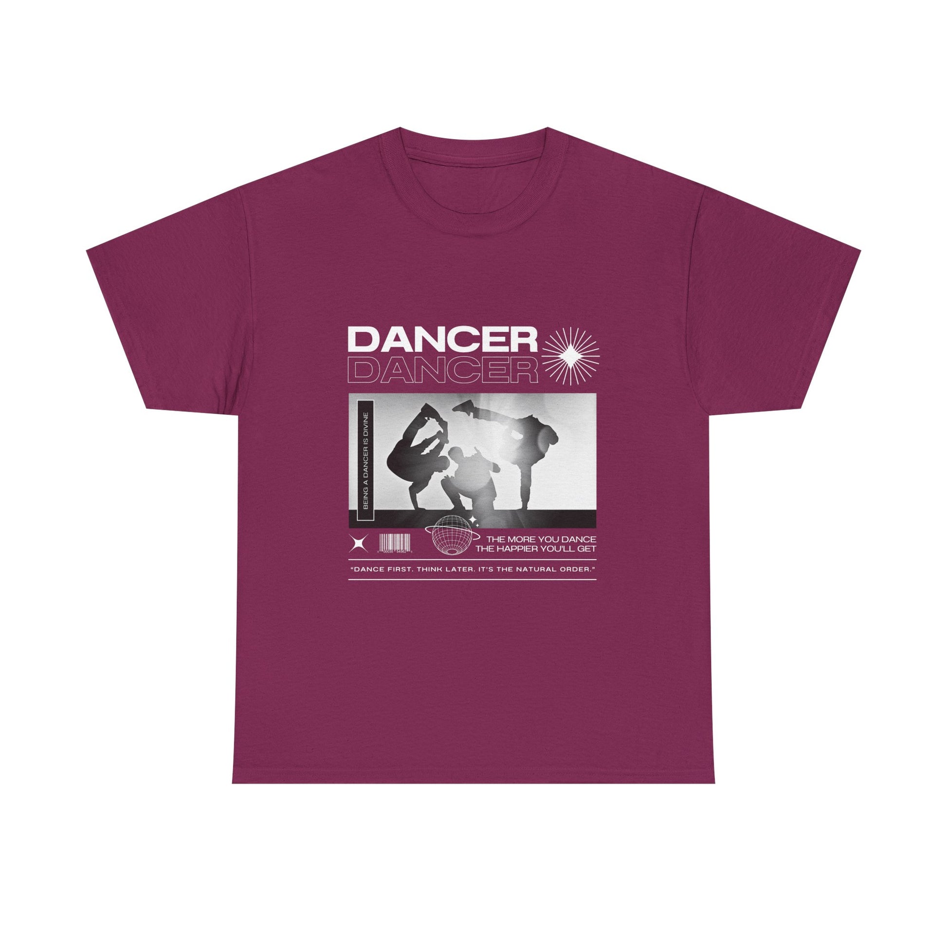 Text on Tee: "Dancer, The More You Dance, The Happier You'll Get. Dance first. Think later. It's the natural order. Being a dancer is divine."
