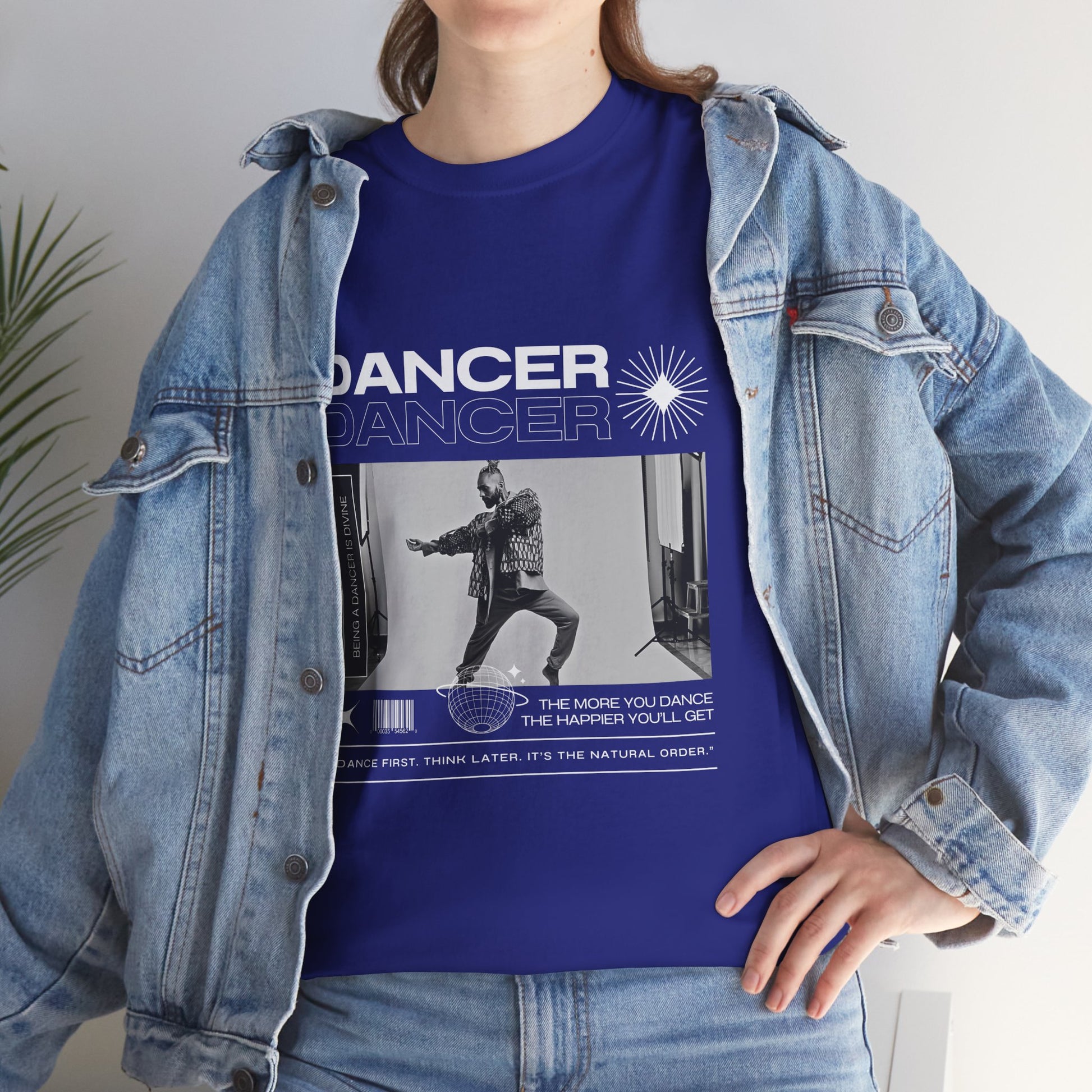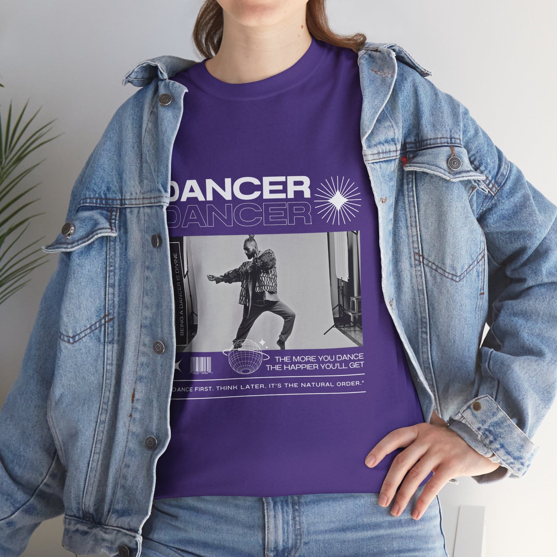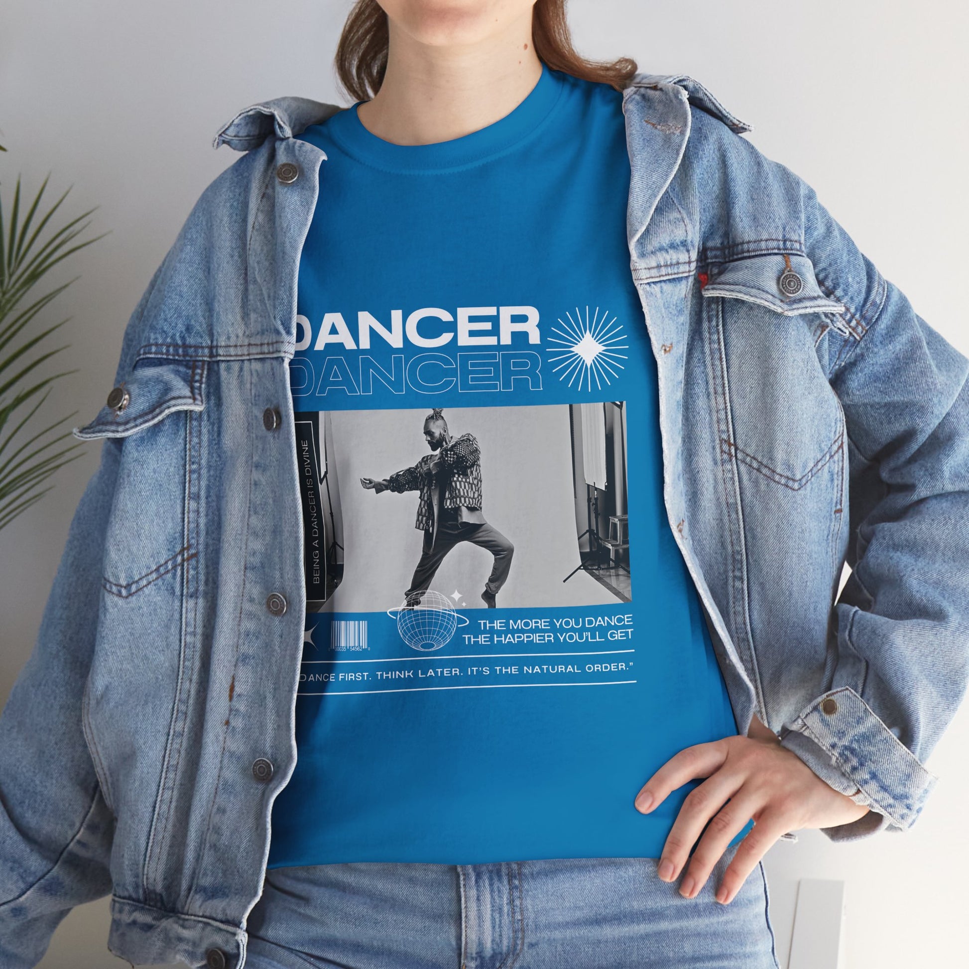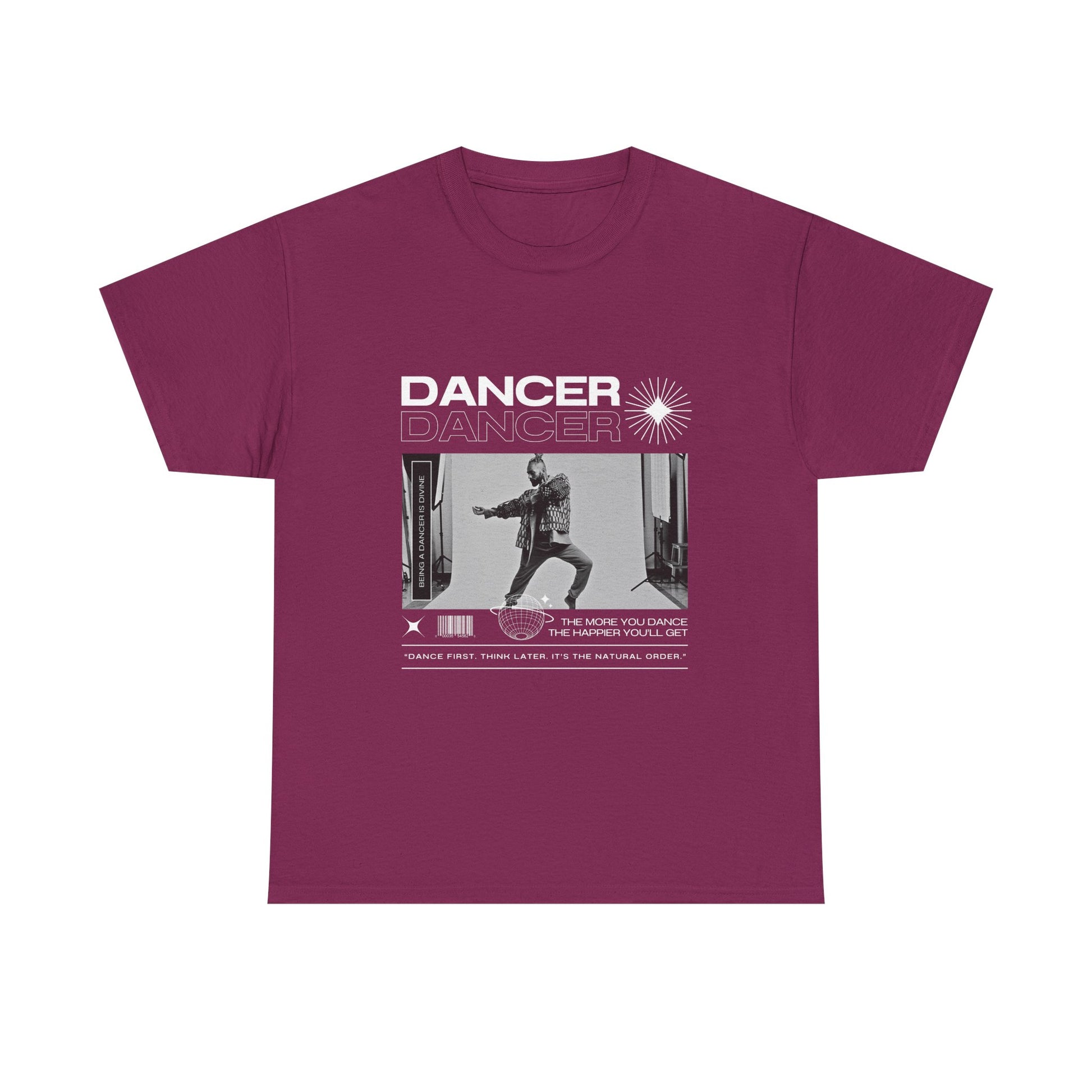 Text on Tee: "Dancer, The More You Dance, The Happier You'll Get. Dance first. Think later. It's the natural order. Being a dancer is divine."