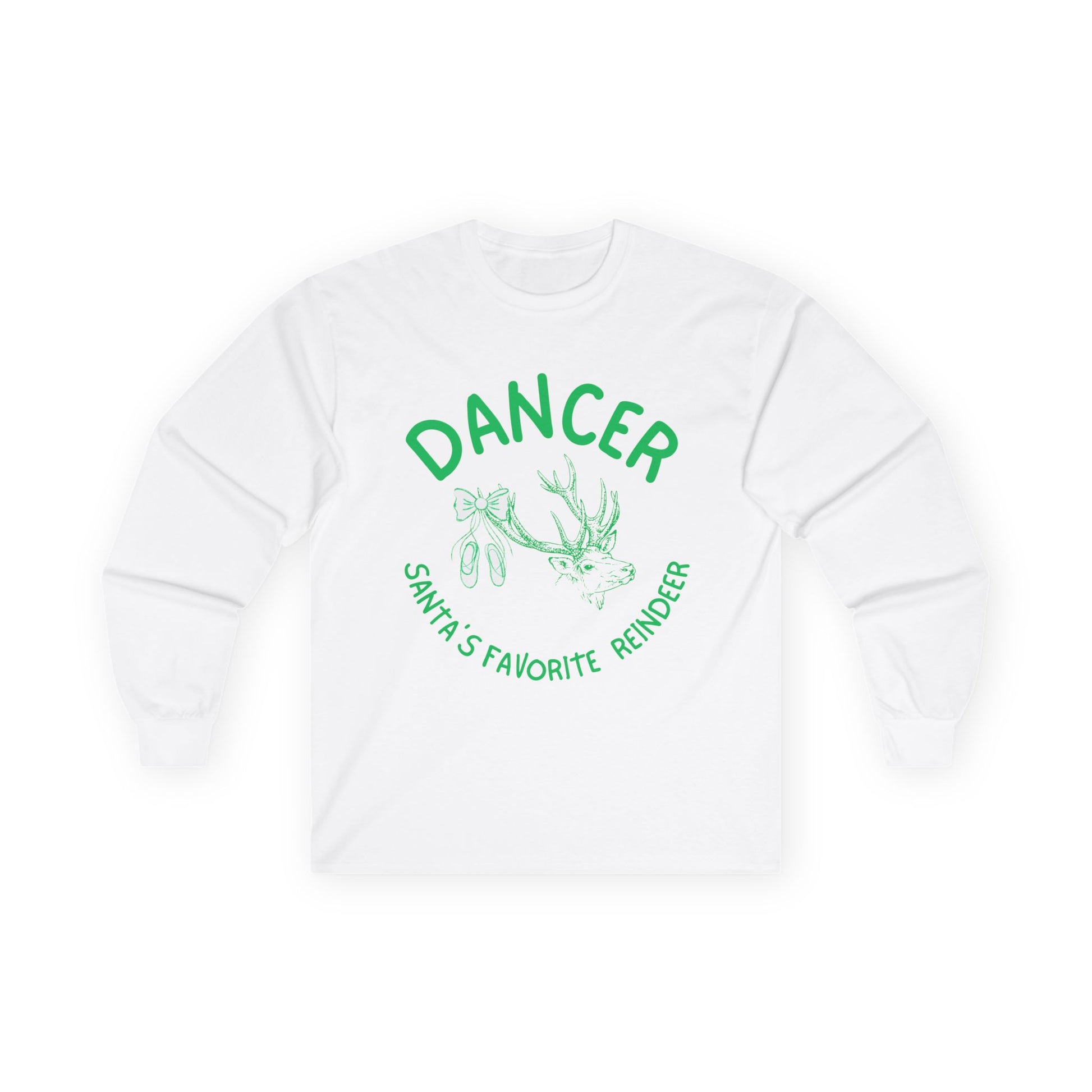 “Dancer, Santa’s Favorite Reindeer” ADULT TEE Unisex Long Sleeve with Vintage Reindeer Graphic – Festive Christmas Dance Tee for Dancers & Holiday Events