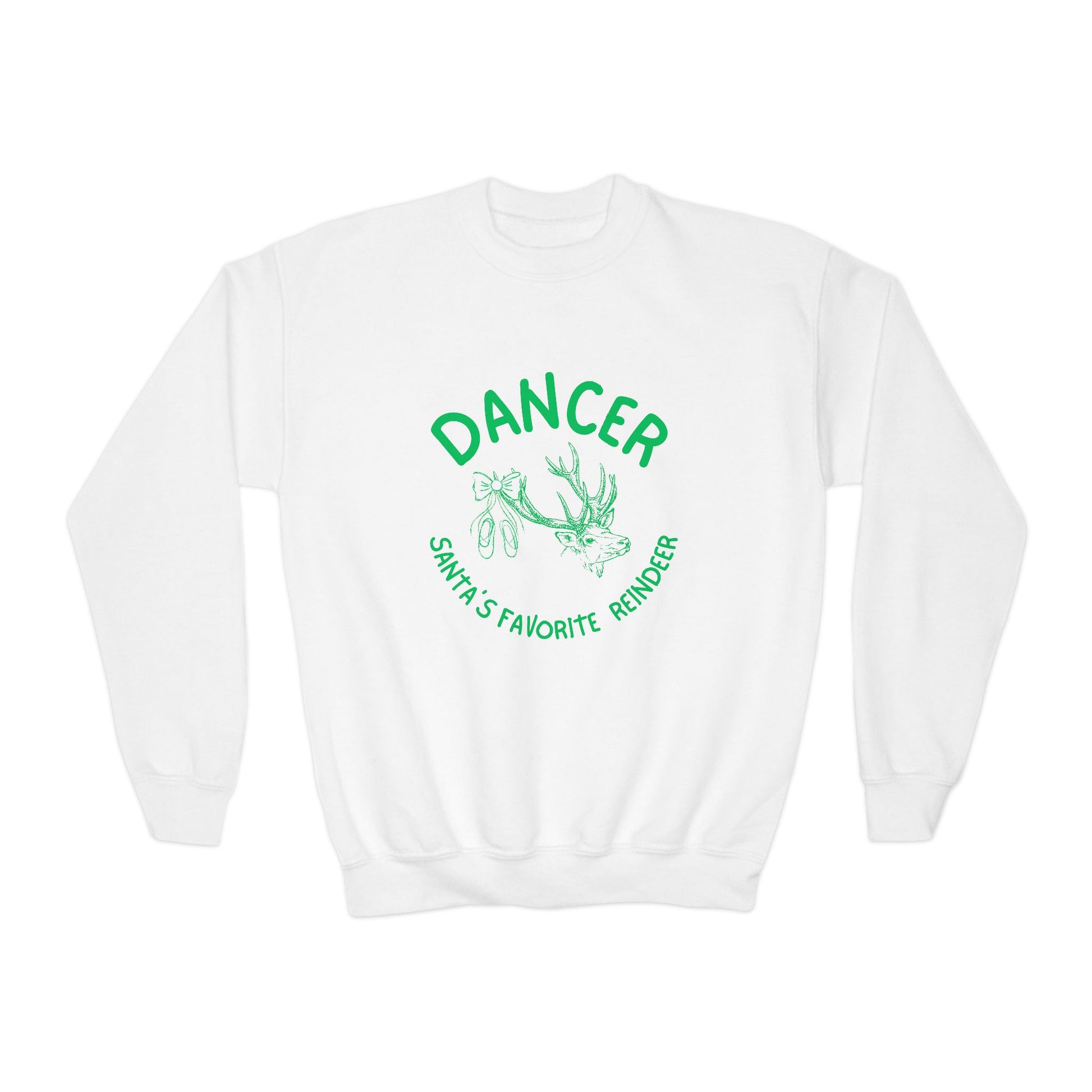 “Dancer, Santa’s Favorite Reindeer” YOUTH SWEATSHIRT Crewneck with Vintage Reindeer Graphic – Festive Christmas Dance Sweatshirt for Dancers & Holiday Events