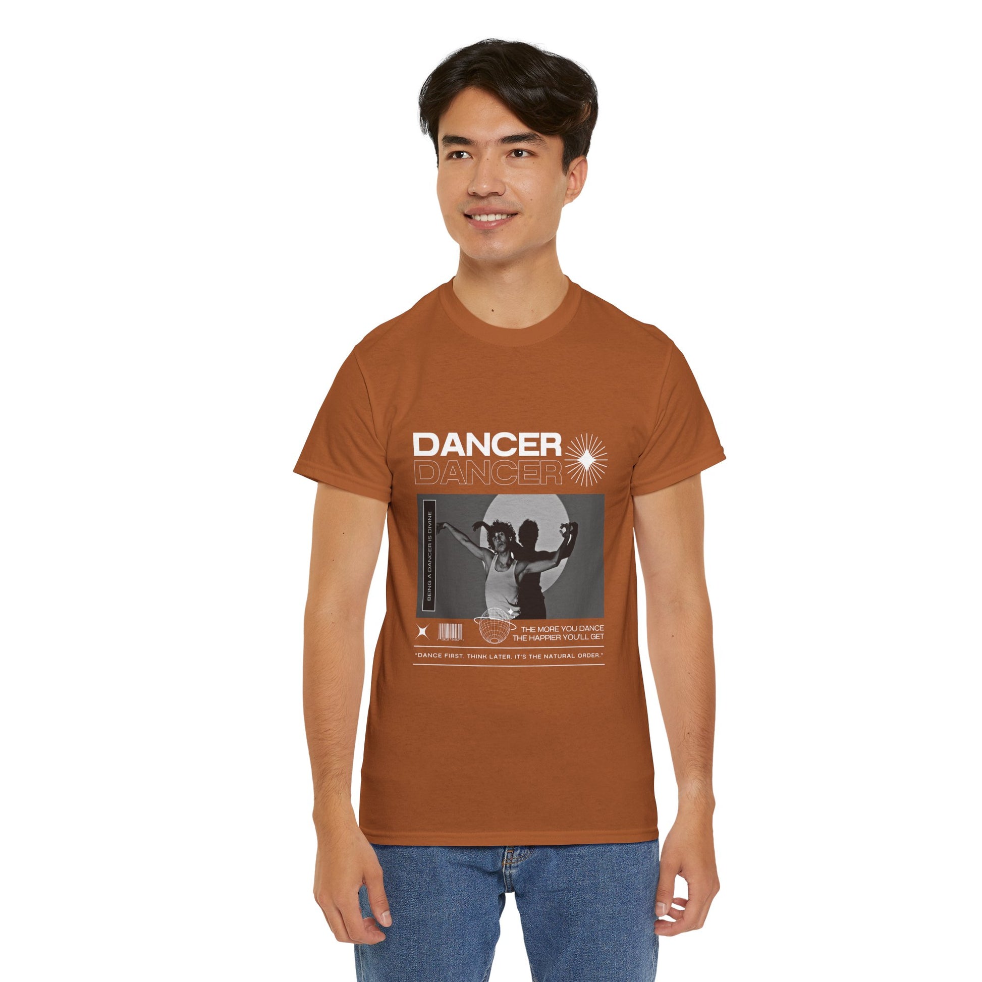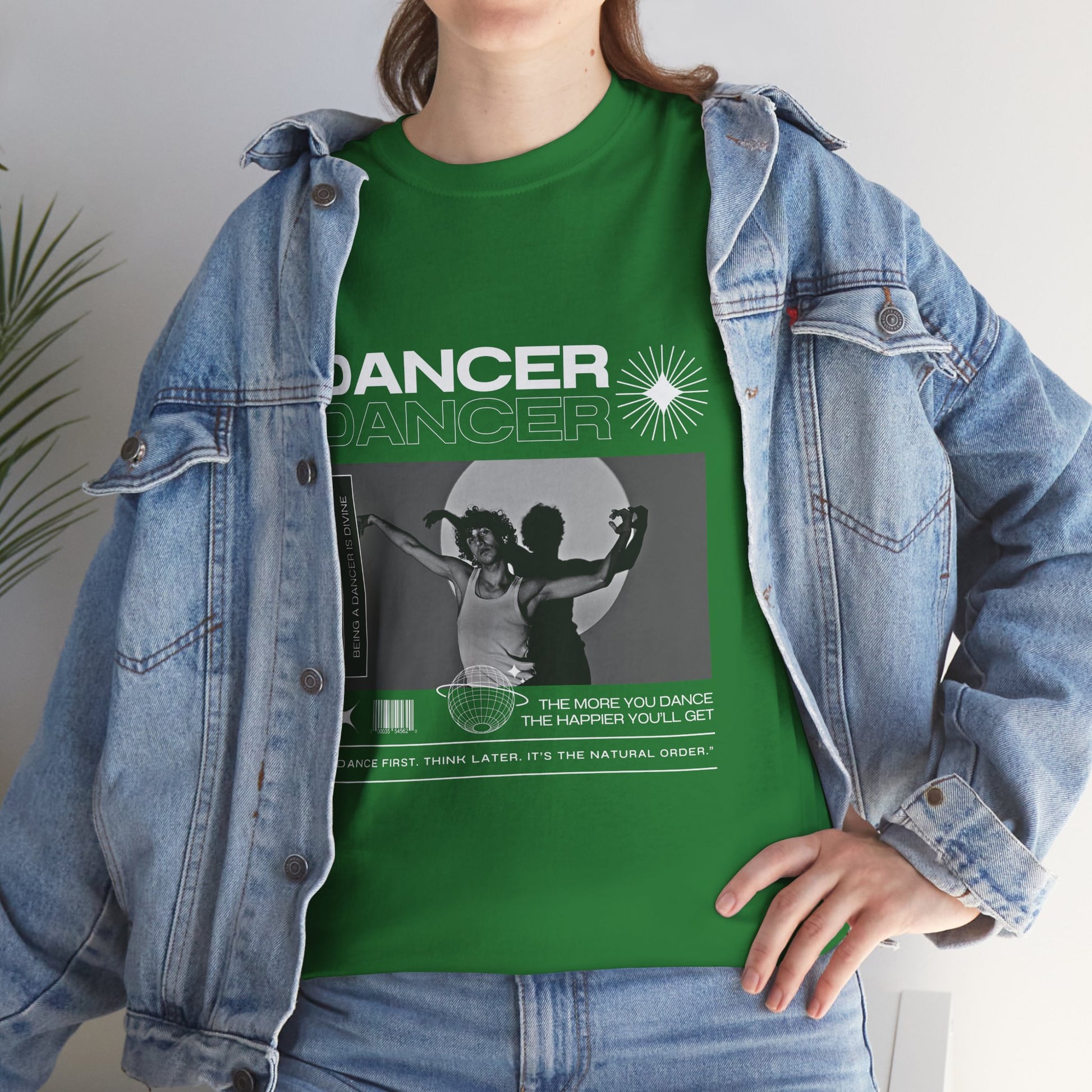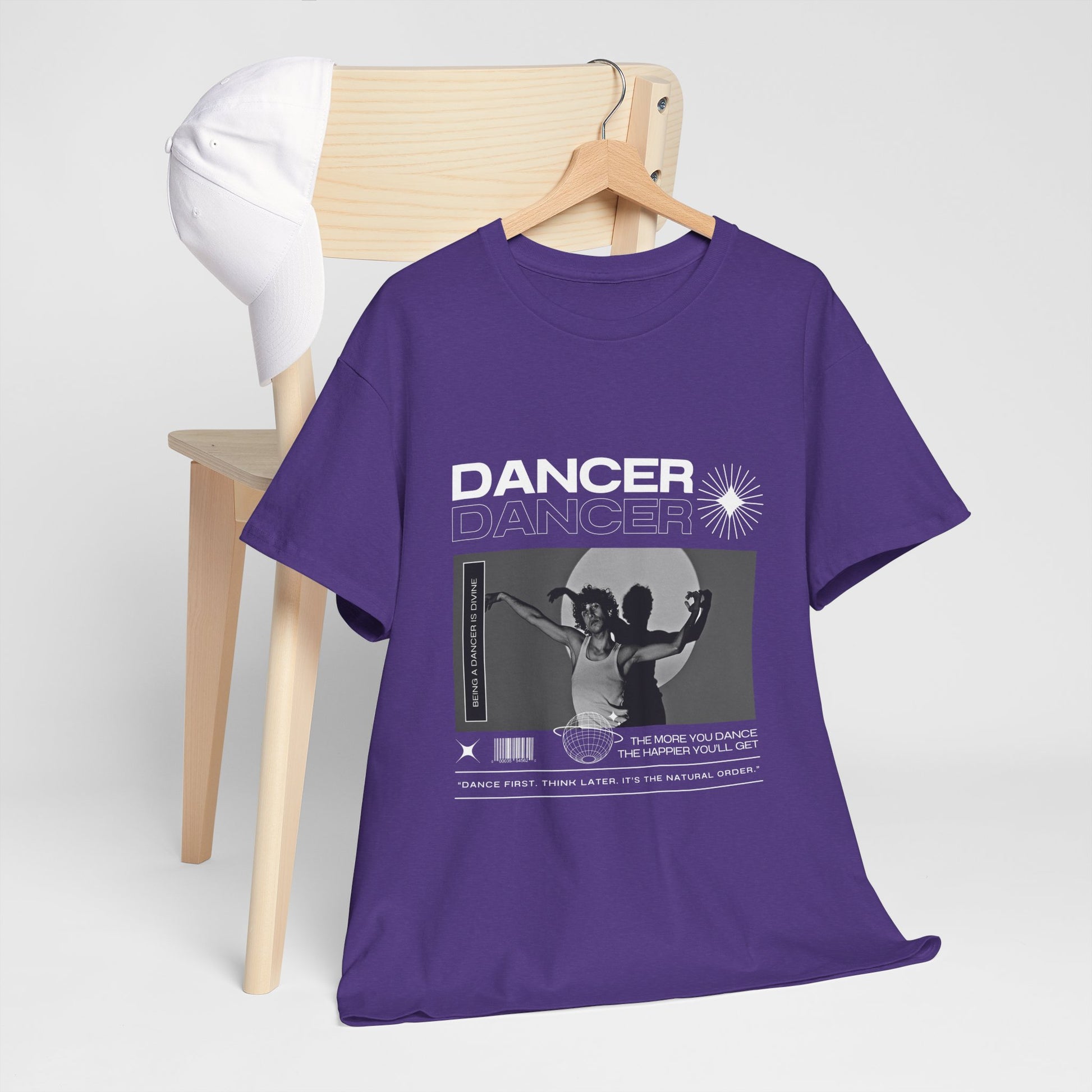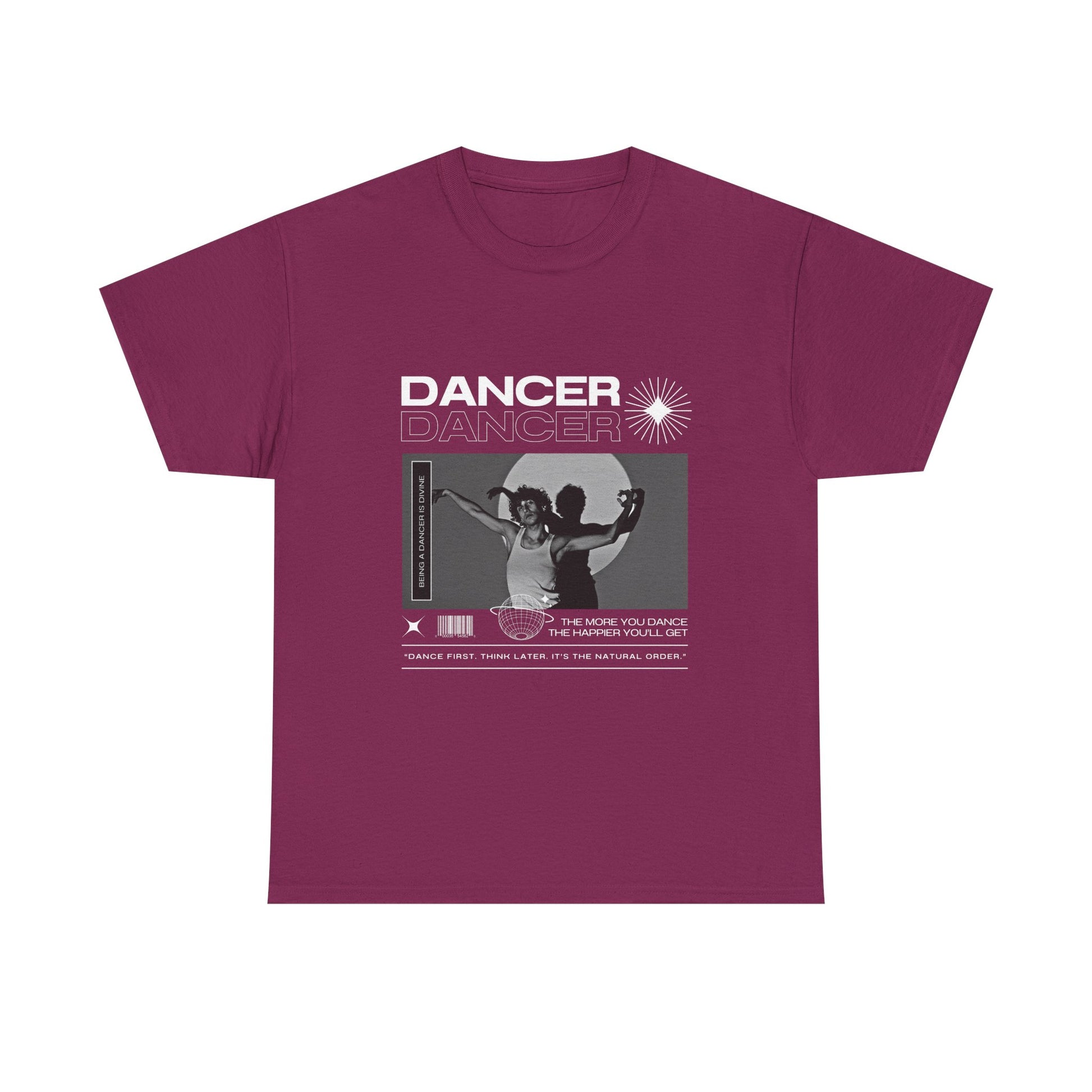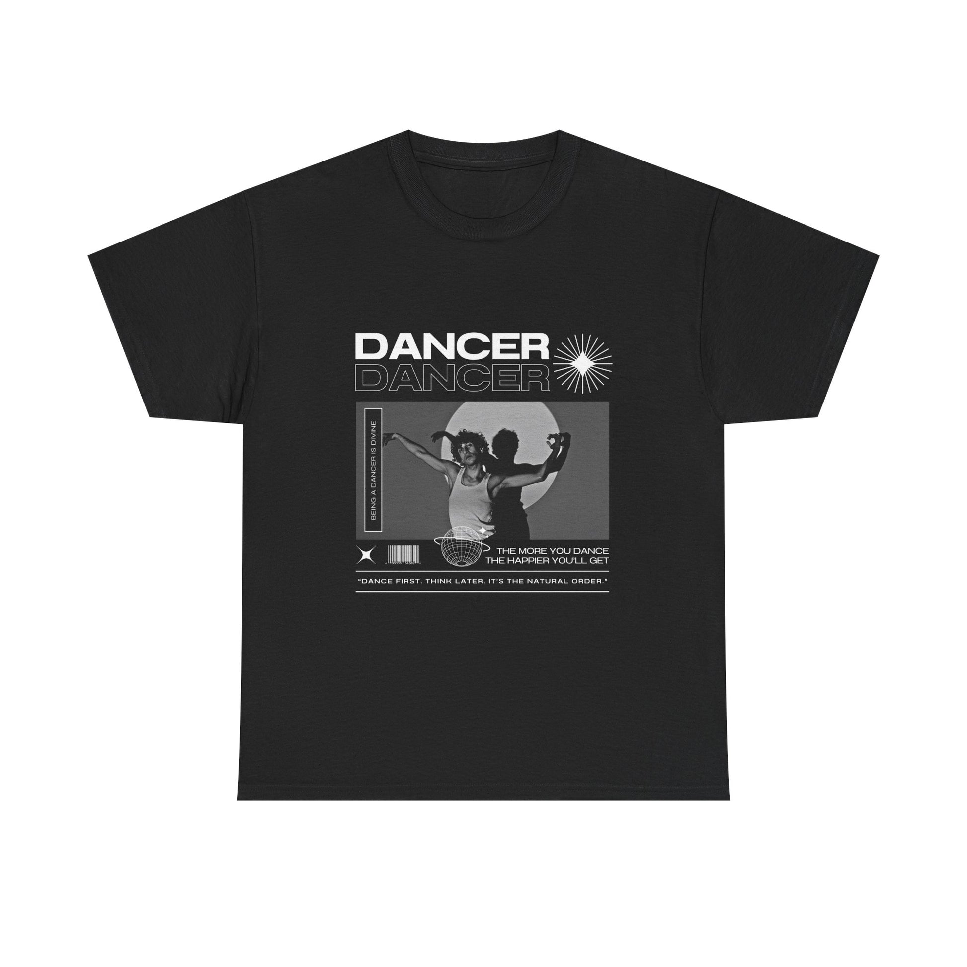 Text on Tee: "Dancer, The More You Dance, The Happier You'll Get. Dance first. Think later. It's the natural order. Being a dancer is divine."