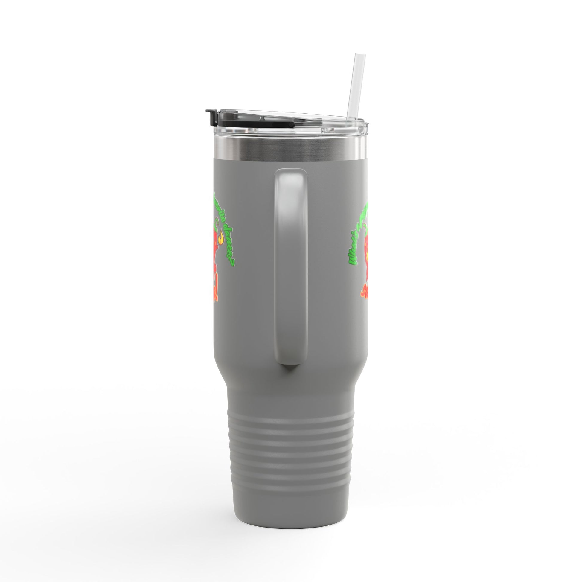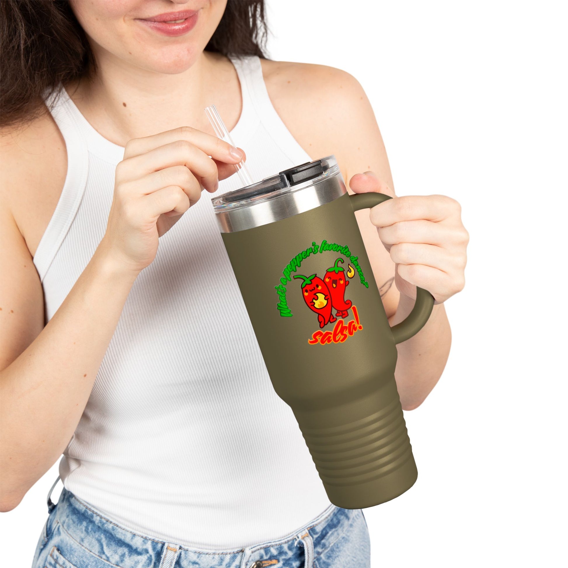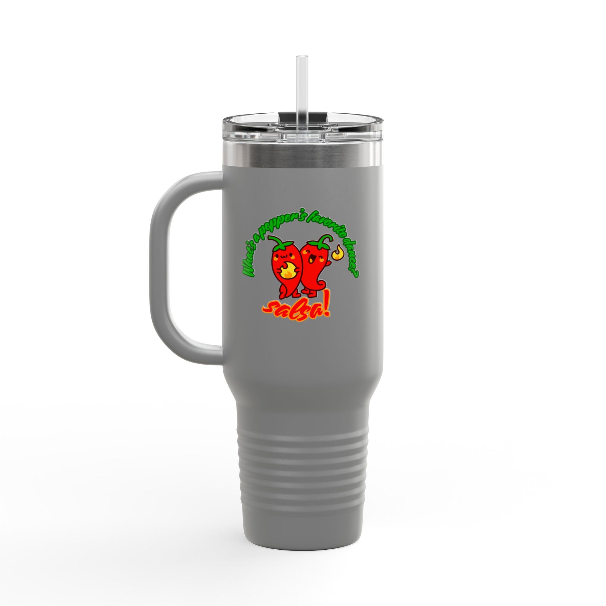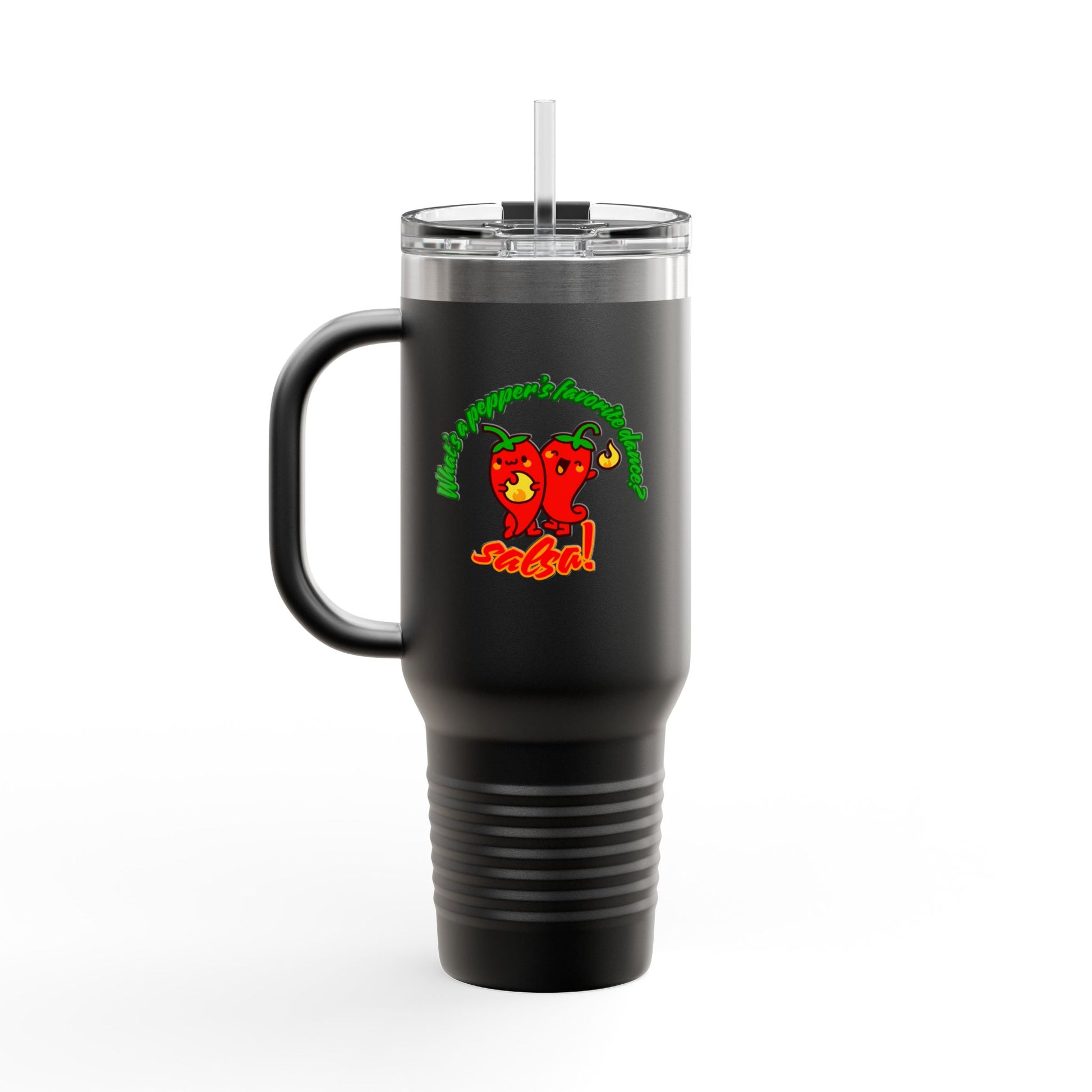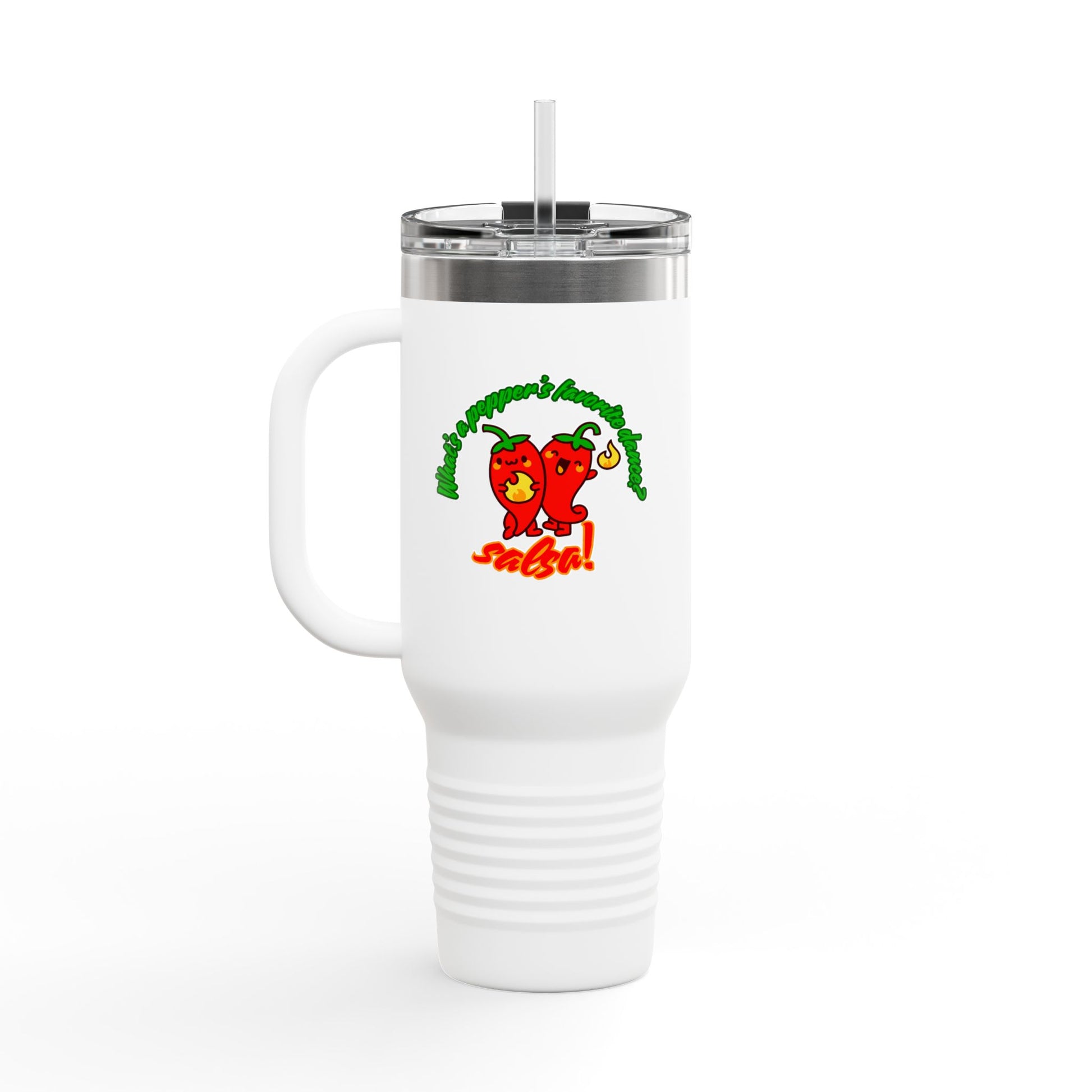 "What's a Pepper's Favorite Dance? Salsa." Funny Dance Quote 40oz Insulated Travel Mug – Bold Pepper Graphic Stainless Steel Tumbler