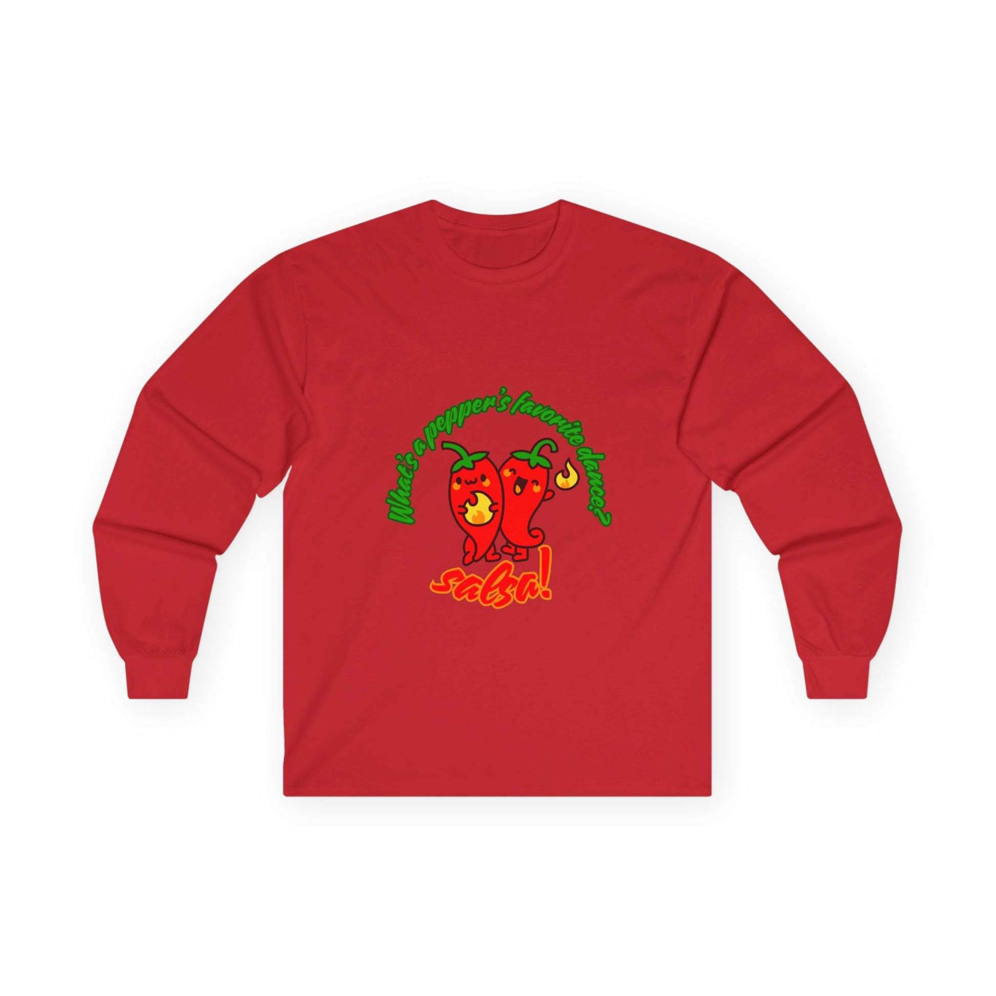 "What’s a Pepper’s Favorite Dance? Salsa!" Unisex Long Sleeve Tee – Funny Dance Pun Shirt with Cute Pepper Graphic for Dancers & Food Lovers