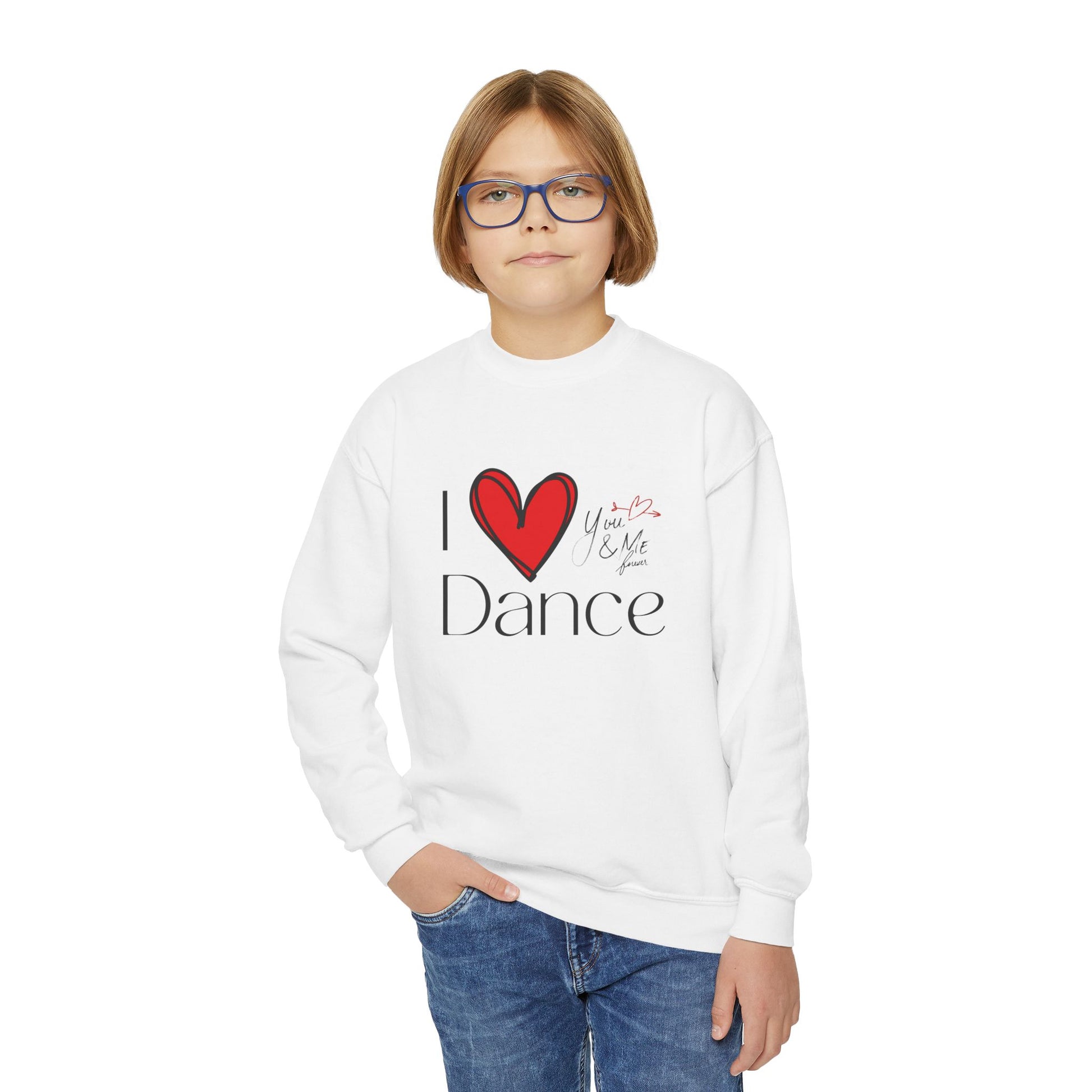 "I Love Dance" Youth Crewneck Sweatshirt – Hand-Drawn Heart & Note Graphic Dance Lover Pullover