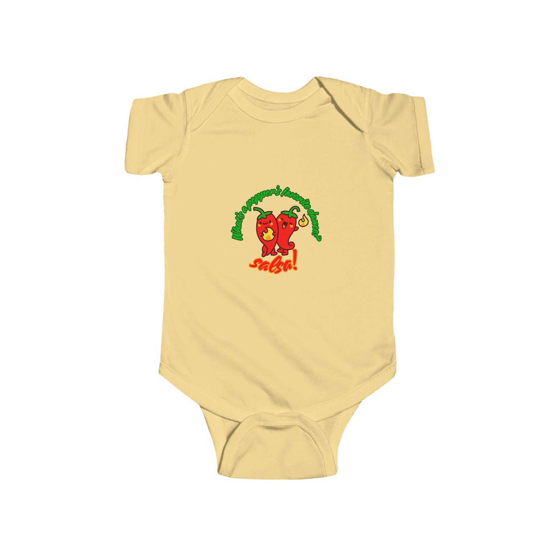 Get ready to spice up your baby’s wardrobe with this adorable and hilarious bodysuit! Featuring the pun-tastic phrase "What's a pepper's favorite dance? Salsa!" and a smiling, dance-ready pepper graphic, this infant short sleeve bodysuit is full of flavor, fun, and fiesta vibes. It’s the perfect outfit for little movers who are already heating up the room with their cuteness.