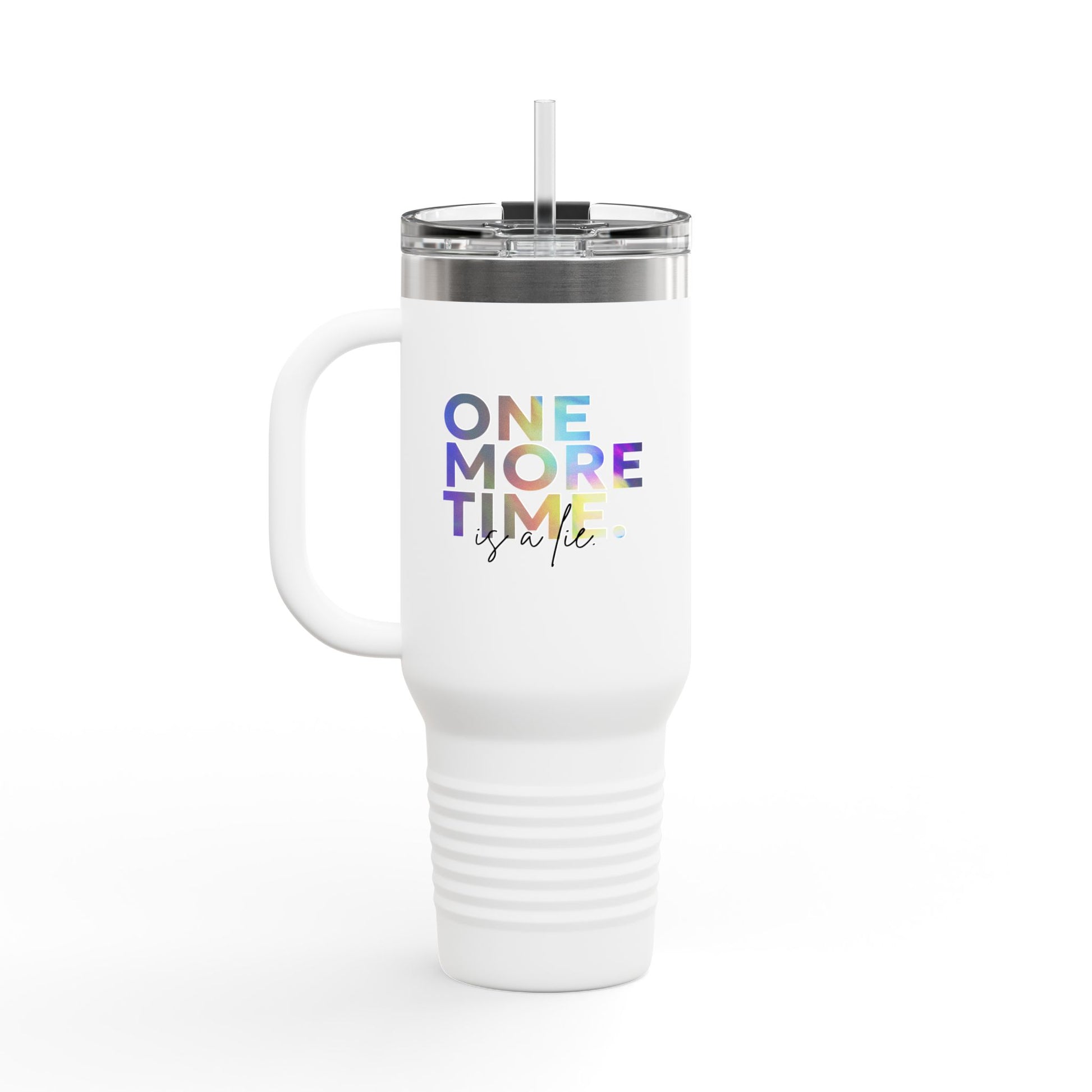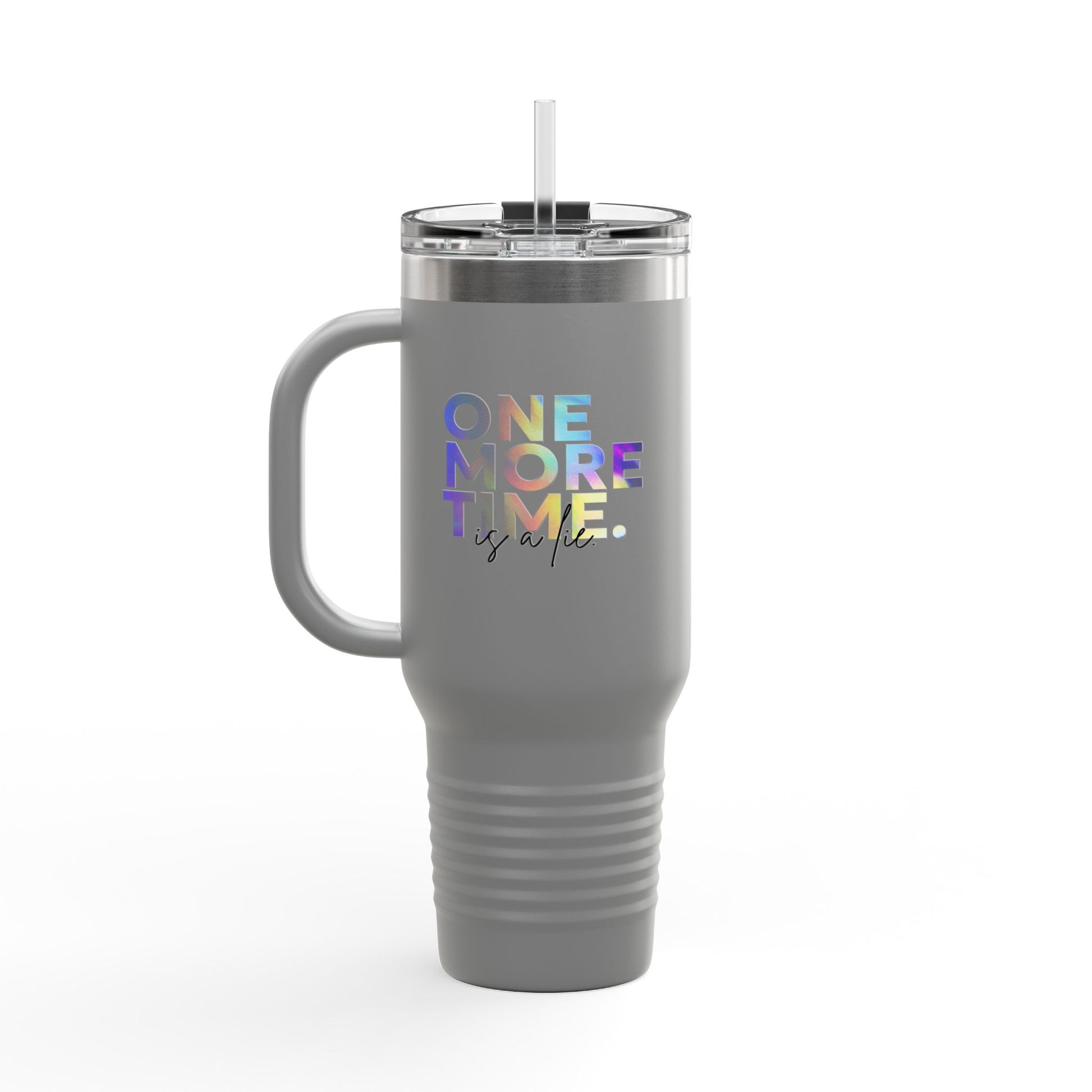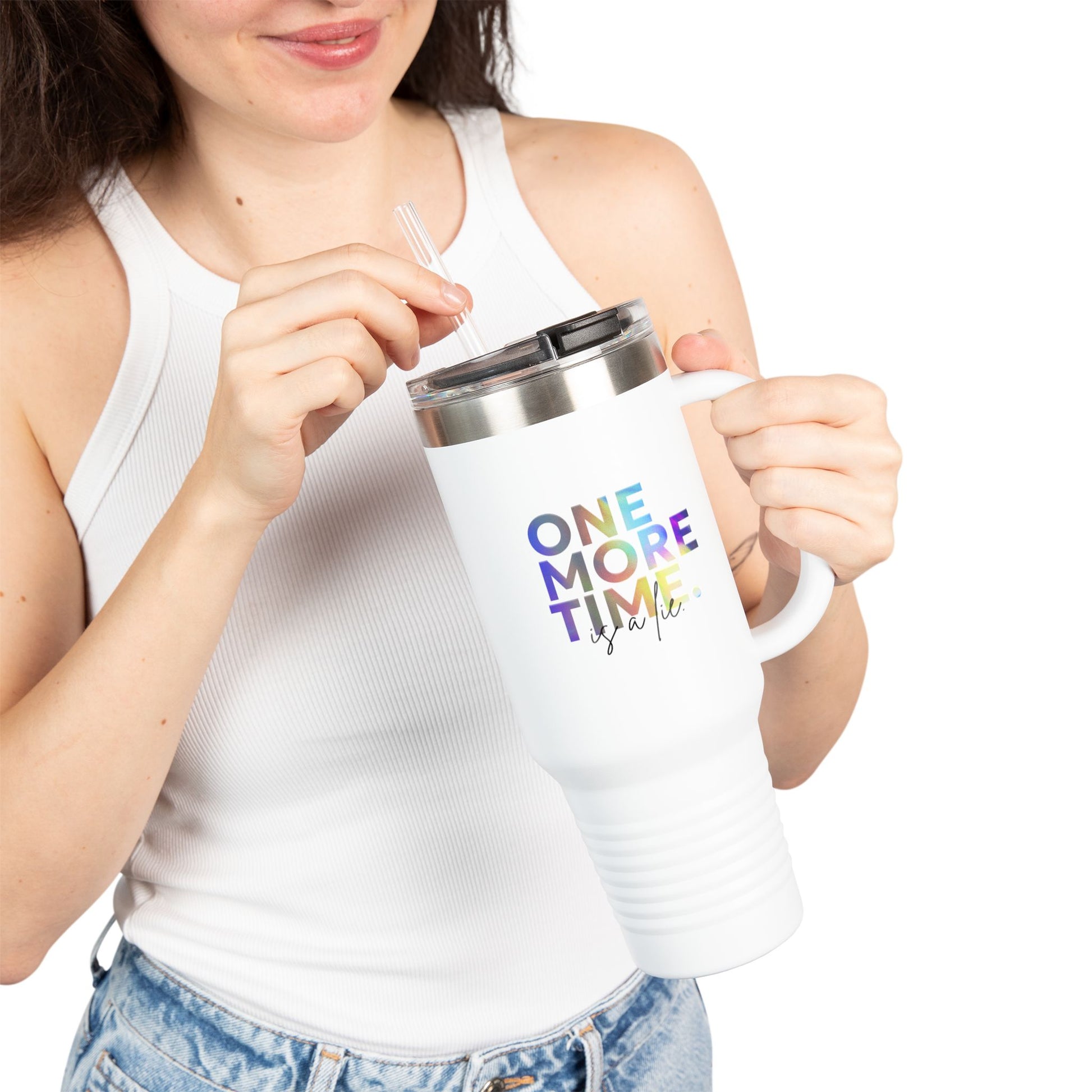 "One More Time is a Lie" 40oz Insulated Travel Mug – Funny Dance Quote Stainless Steel Tumbler with Text Graphic – Durable, Leak-Proof Coffee Mug for Dancers & On-the-Go Lifestyles