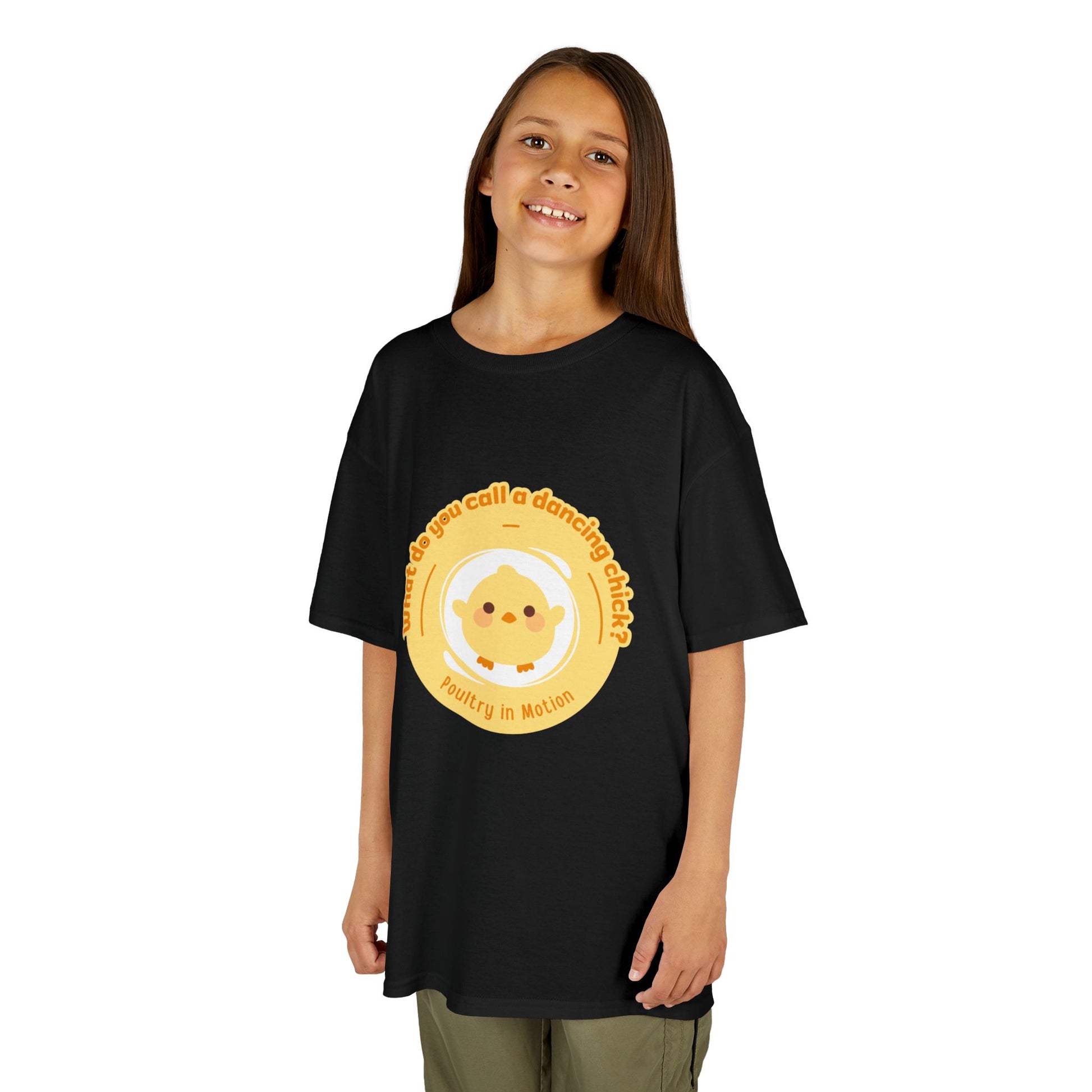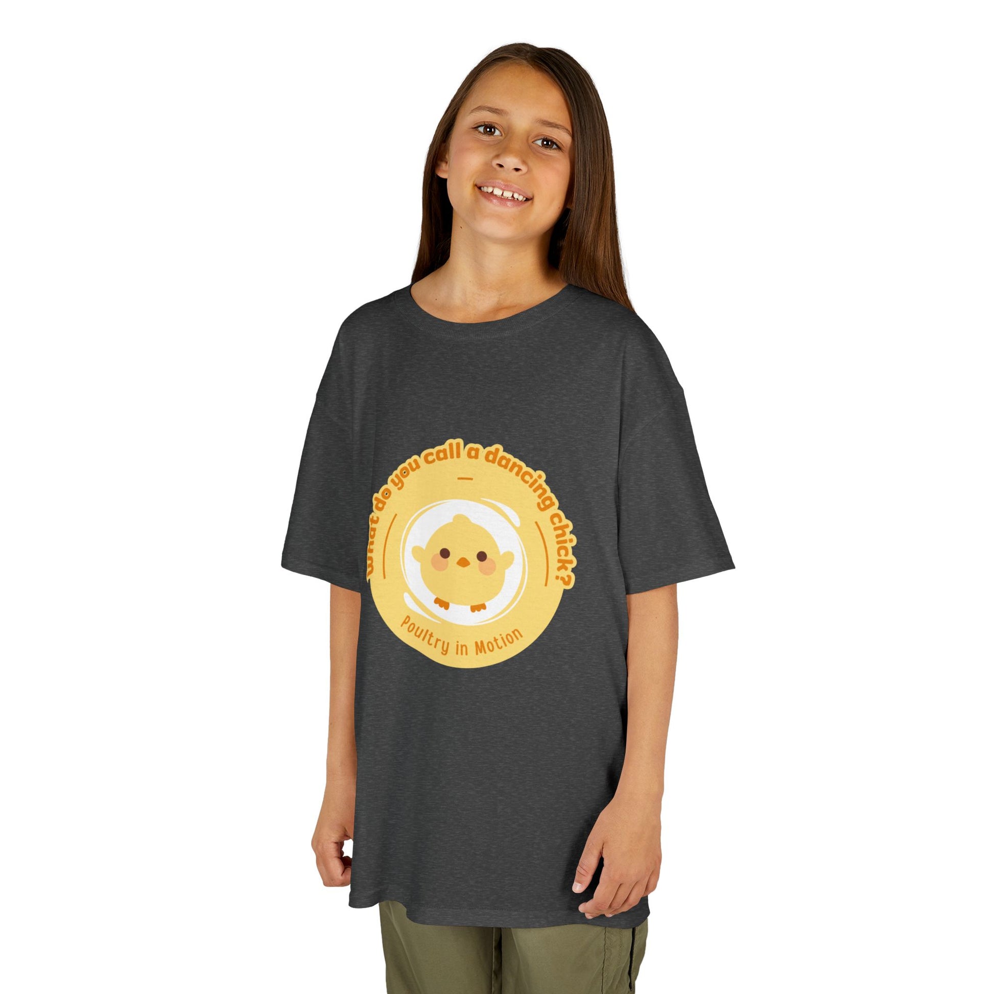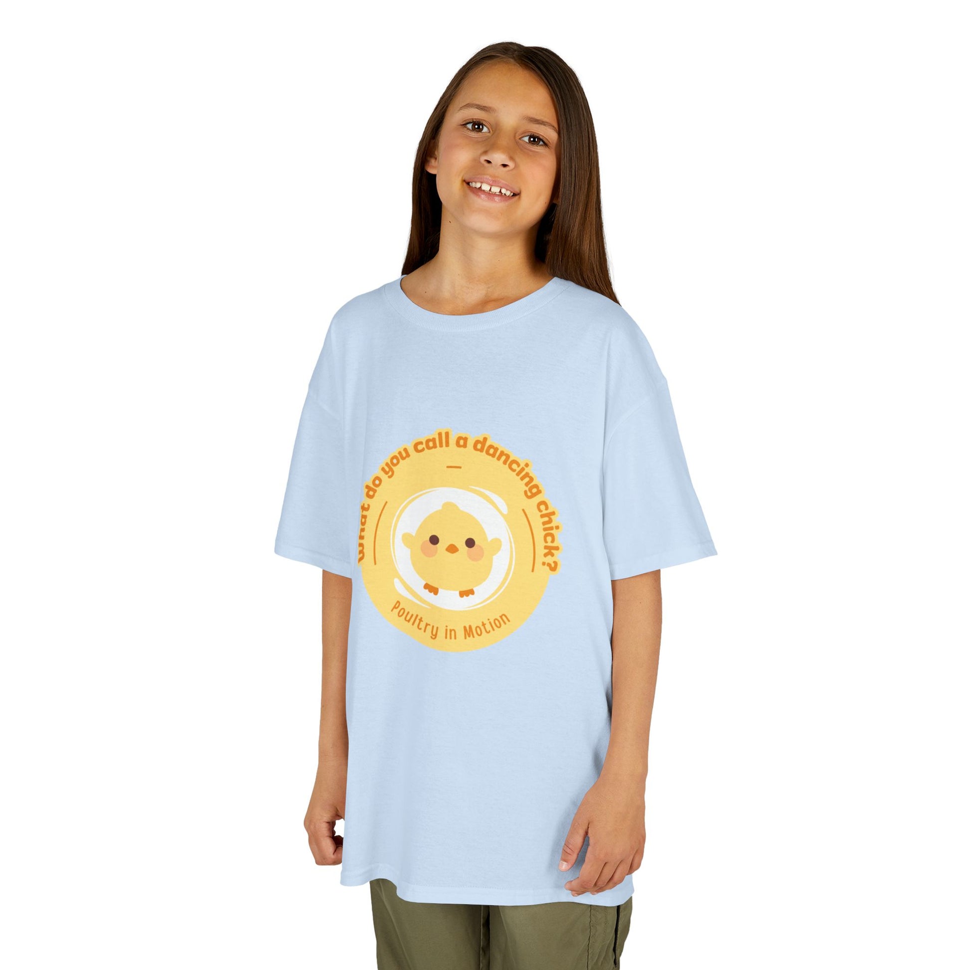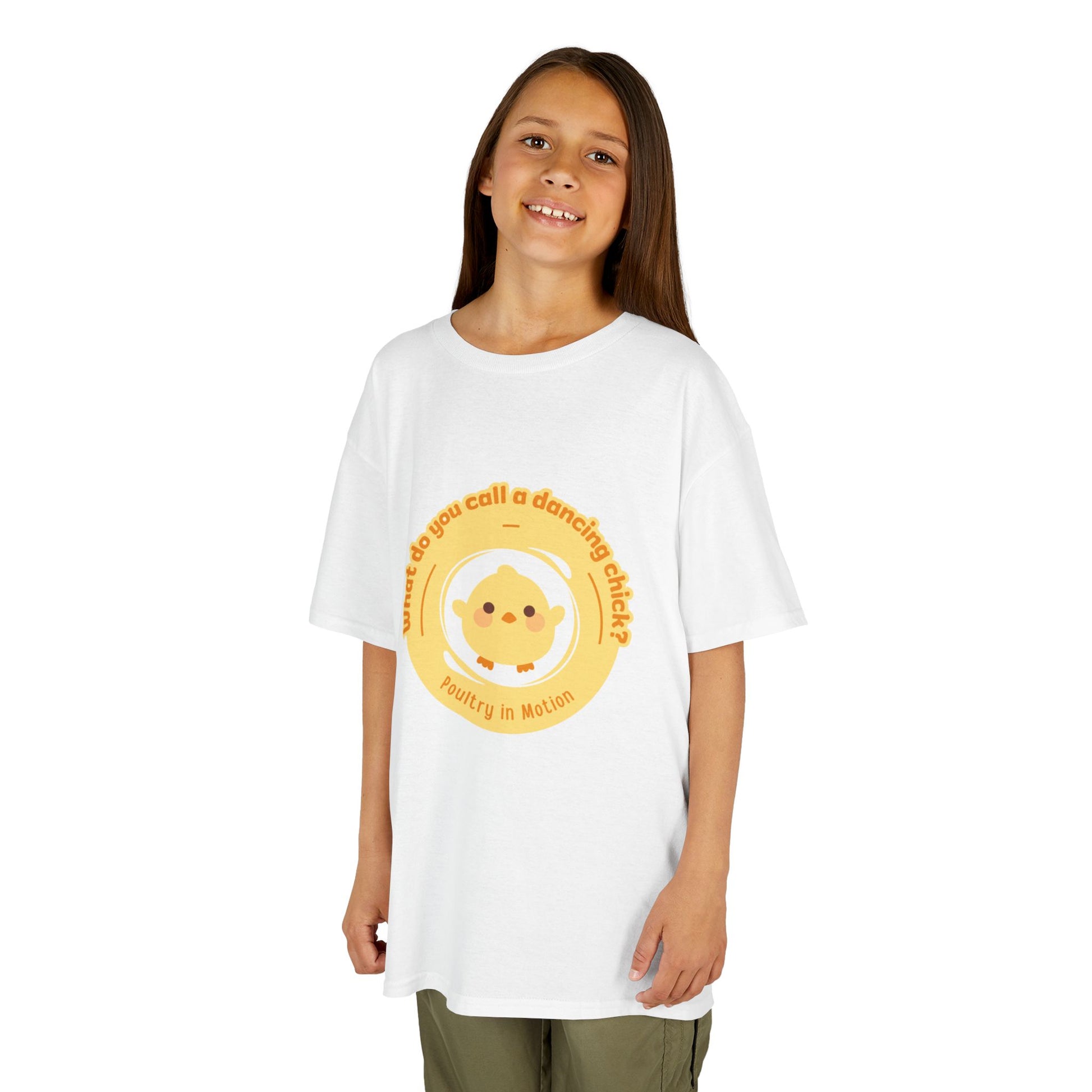 “What do you call a dancing chick? Poultry in Motion” Funny Chick Dance Tee for Kids – Cute Chicken Graphic - Youth Dance Pun T-Shirt