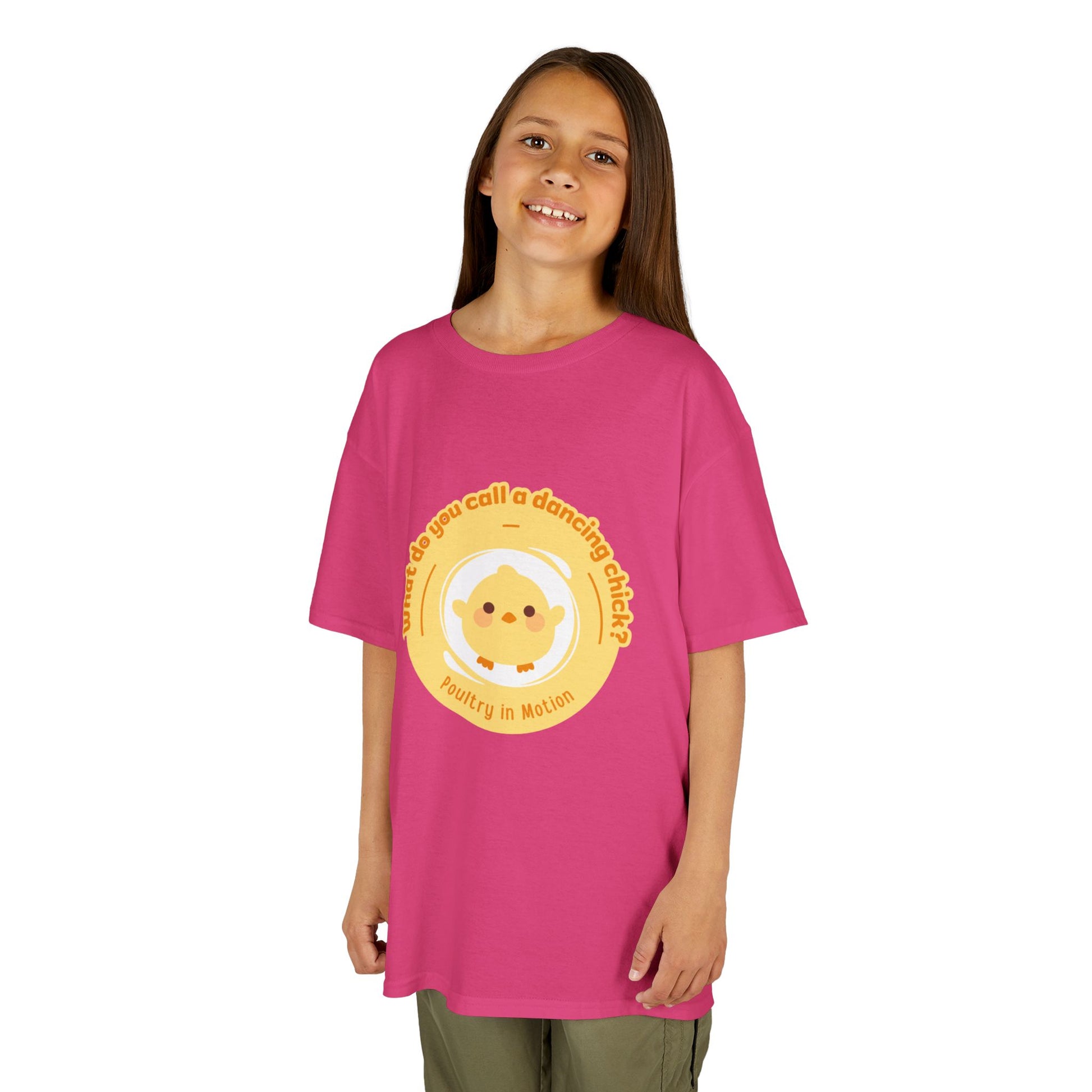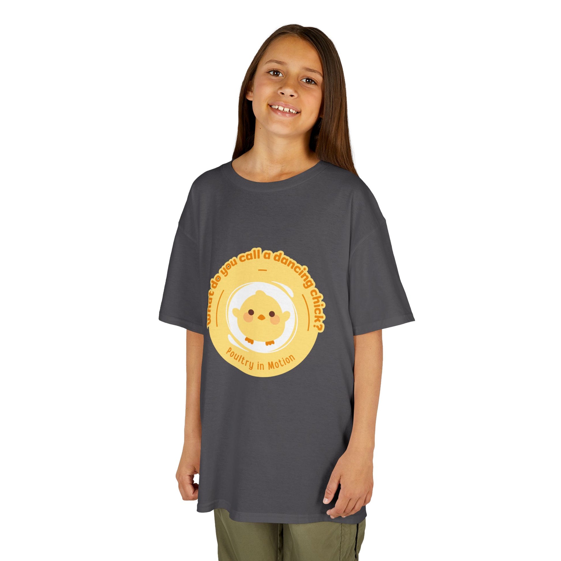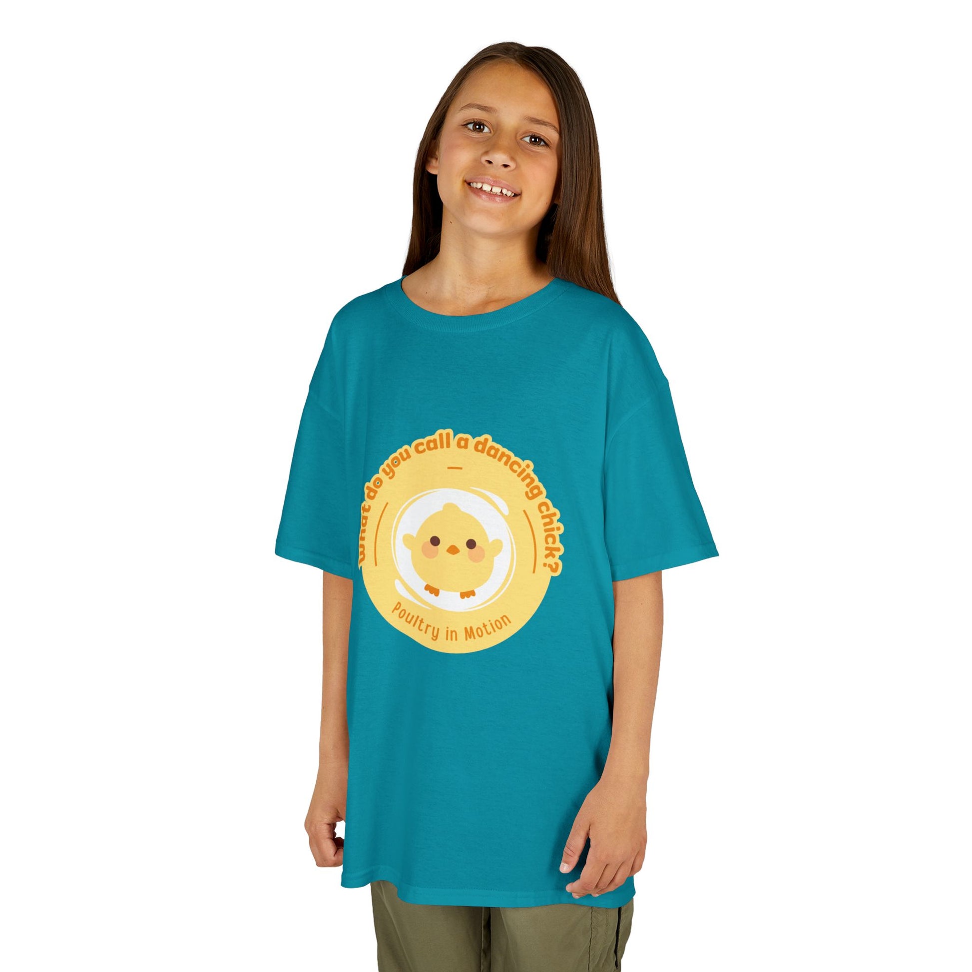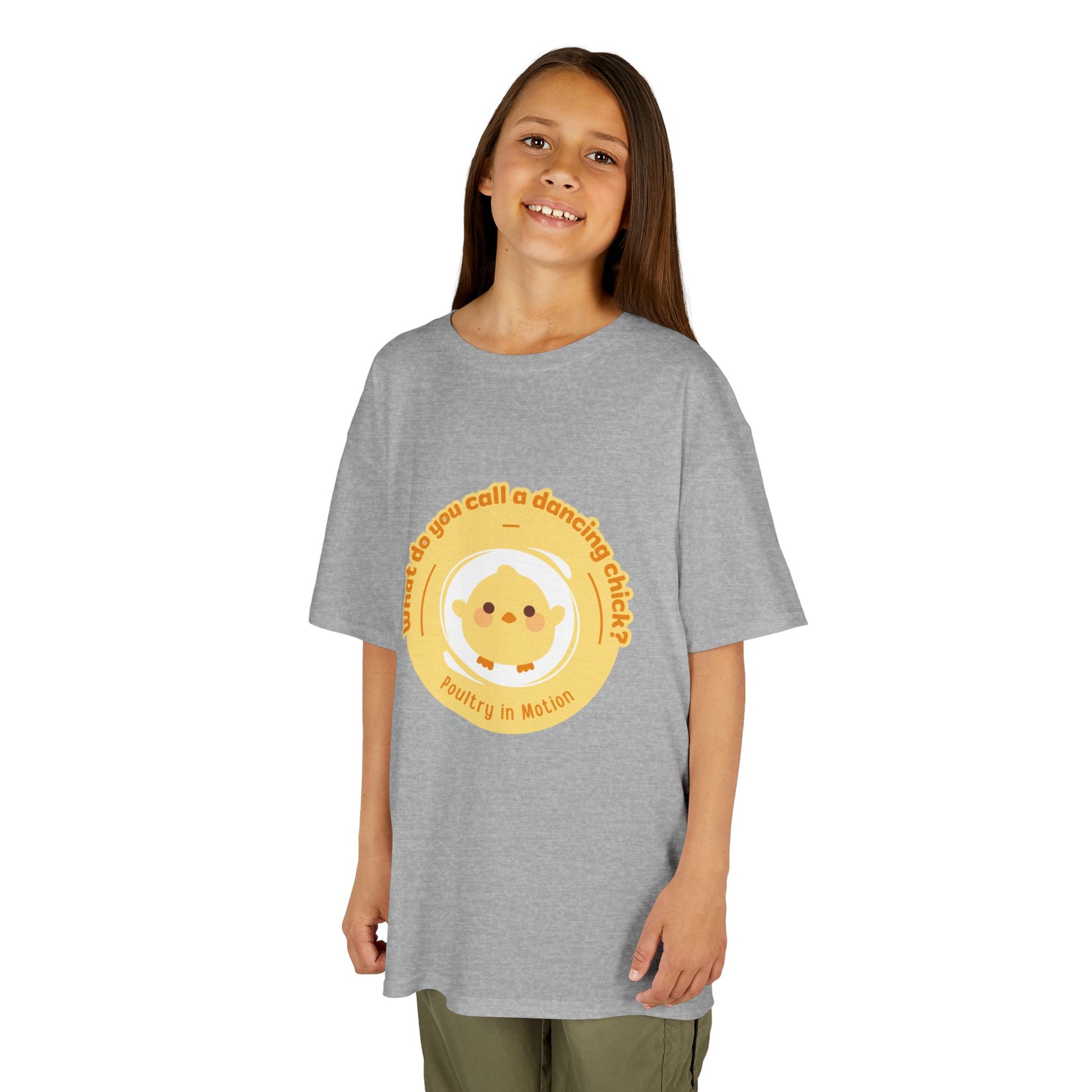 “What do you call a dancing chick? Poultry in Motion” Funny Chick Dance Tee for Kids – Cute Chicken Graphic - Youth Dance Pun T-Shirt