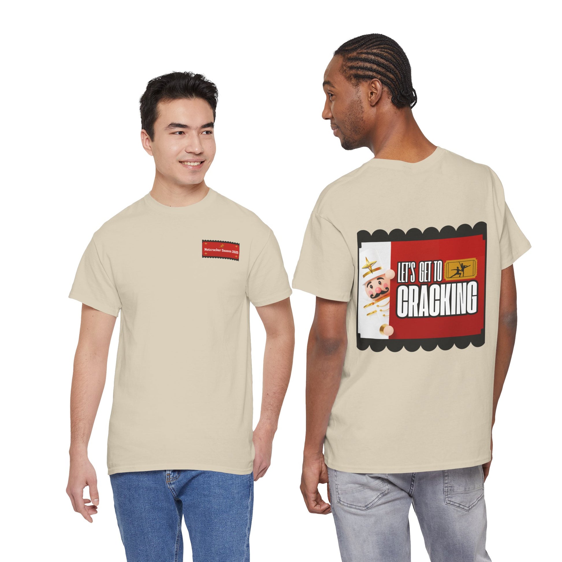 Bring a little humor into your holiday season with this Unisex Heavy Cotton Tee, the perfect blend of cozy comfort and Nutcracker cheekiness. The front keeps things subtle with a small “Nutcracker 2025” stitched-style label near the chest, while the back delivers the real punchline: a bold, retro-inspired “LET’S GET TO CRACKING” graphic framed in scalloped edges and vintage colors. It’s playful, nostalgic, and sure to get a grin from dancers and dance families alike.