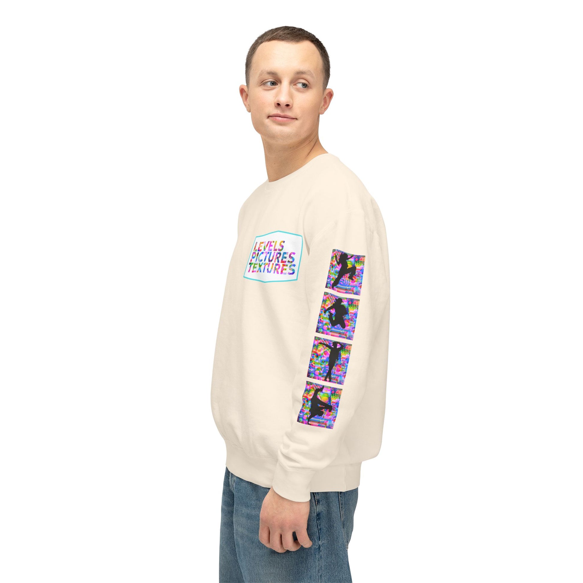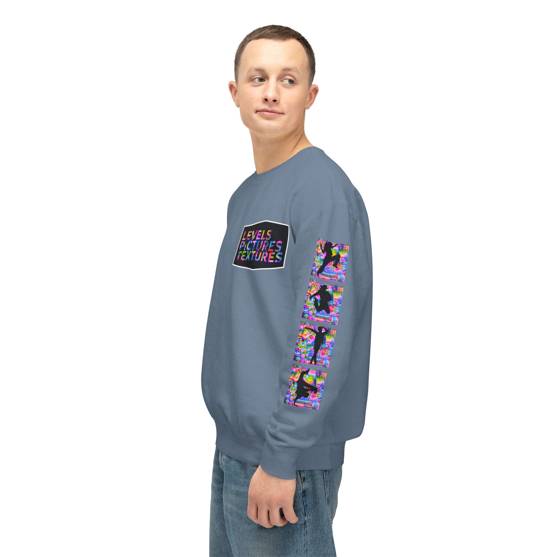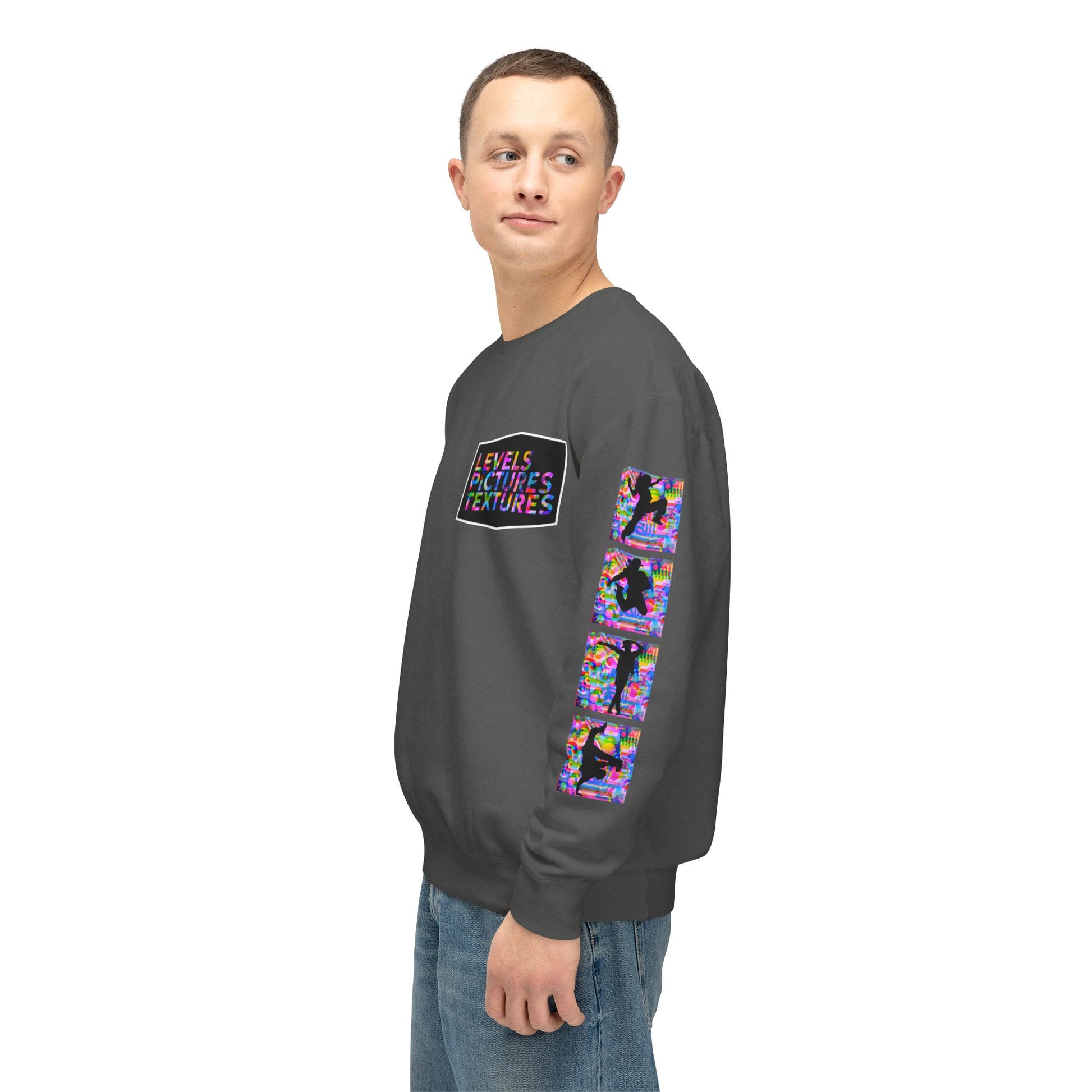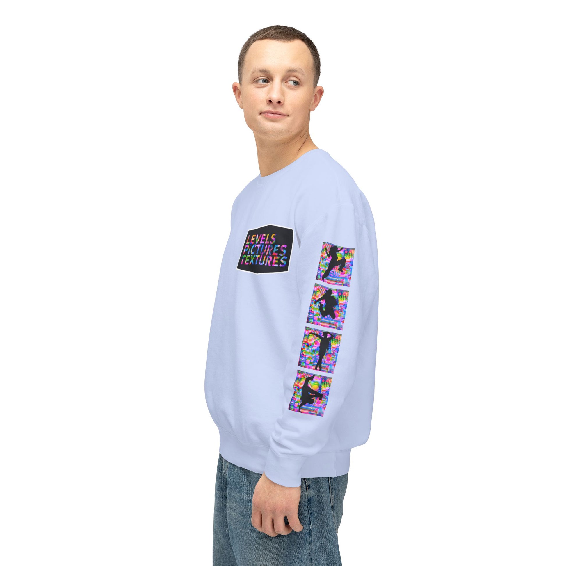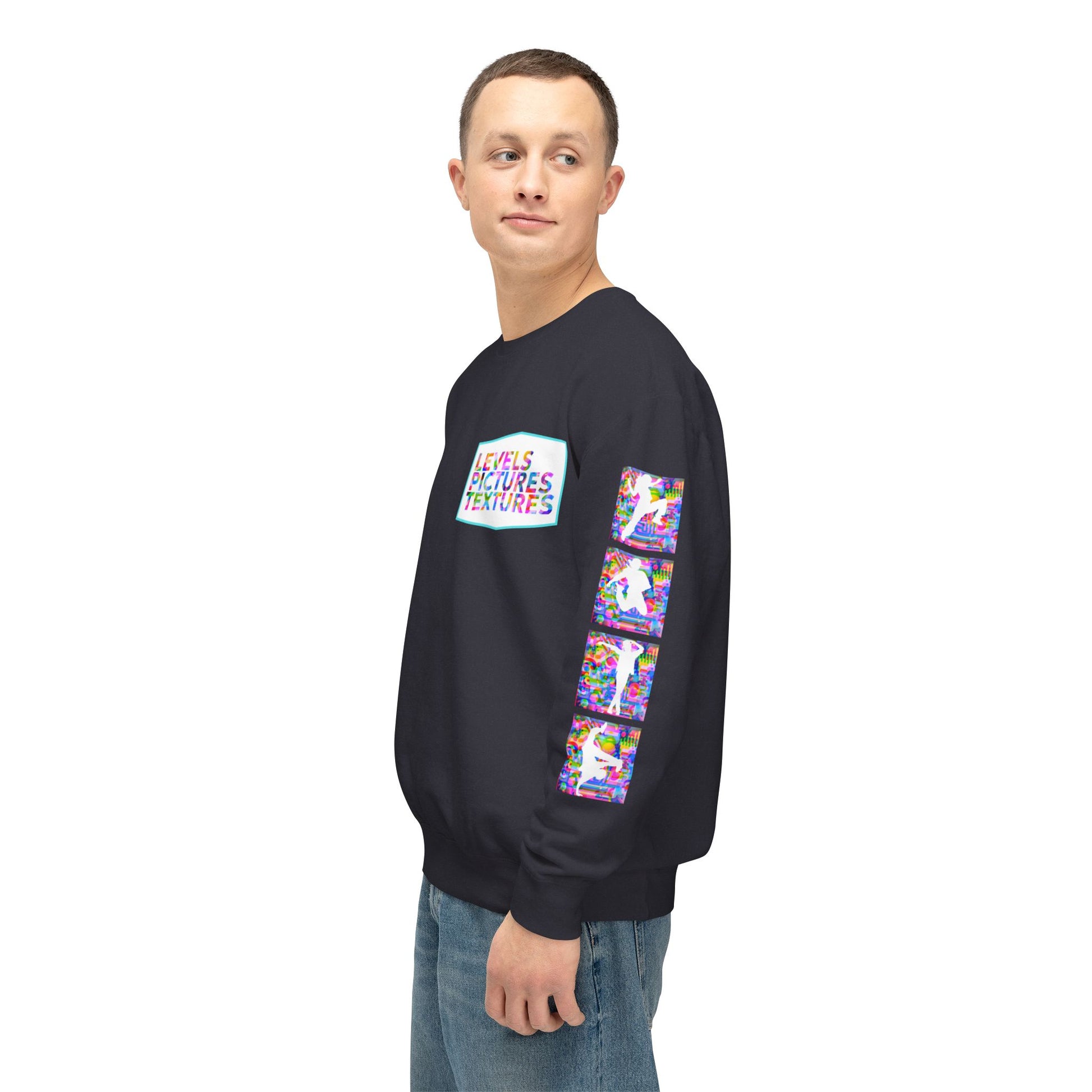 Levels Premium Collection Dance Crewneck Sweatshirt – Vibrant Unisex Streetwear Pullover with "Levels Pictures Textures" Front Text and Dancer Silhouettes on Sleeves