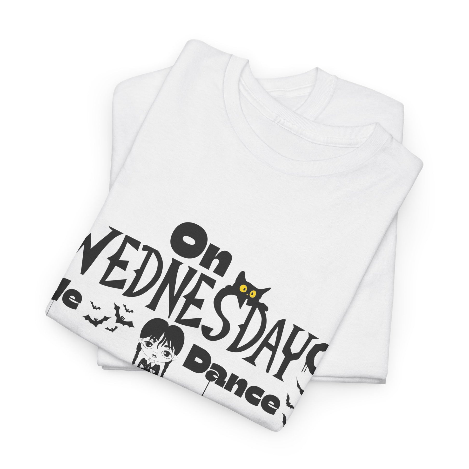 “On Wednesdays We Dance” Gothic Halloween T-Shirt with Cute Girl, Black Cat, Spiders & Bats - Unisex Heavy Cotton Tee