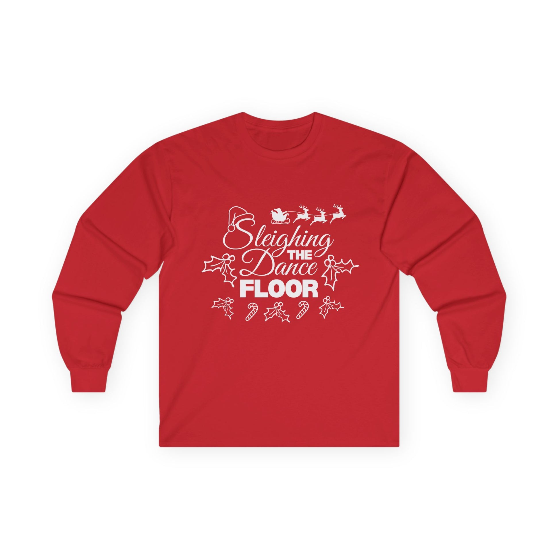 “Sleighing the Dance Floor” ADULT TEE Unisex Long Sleeve with Santa’s Sleigh and Reindeer – Festive Christmas Dance Shirt for Dancers, Studios and Holiday Events