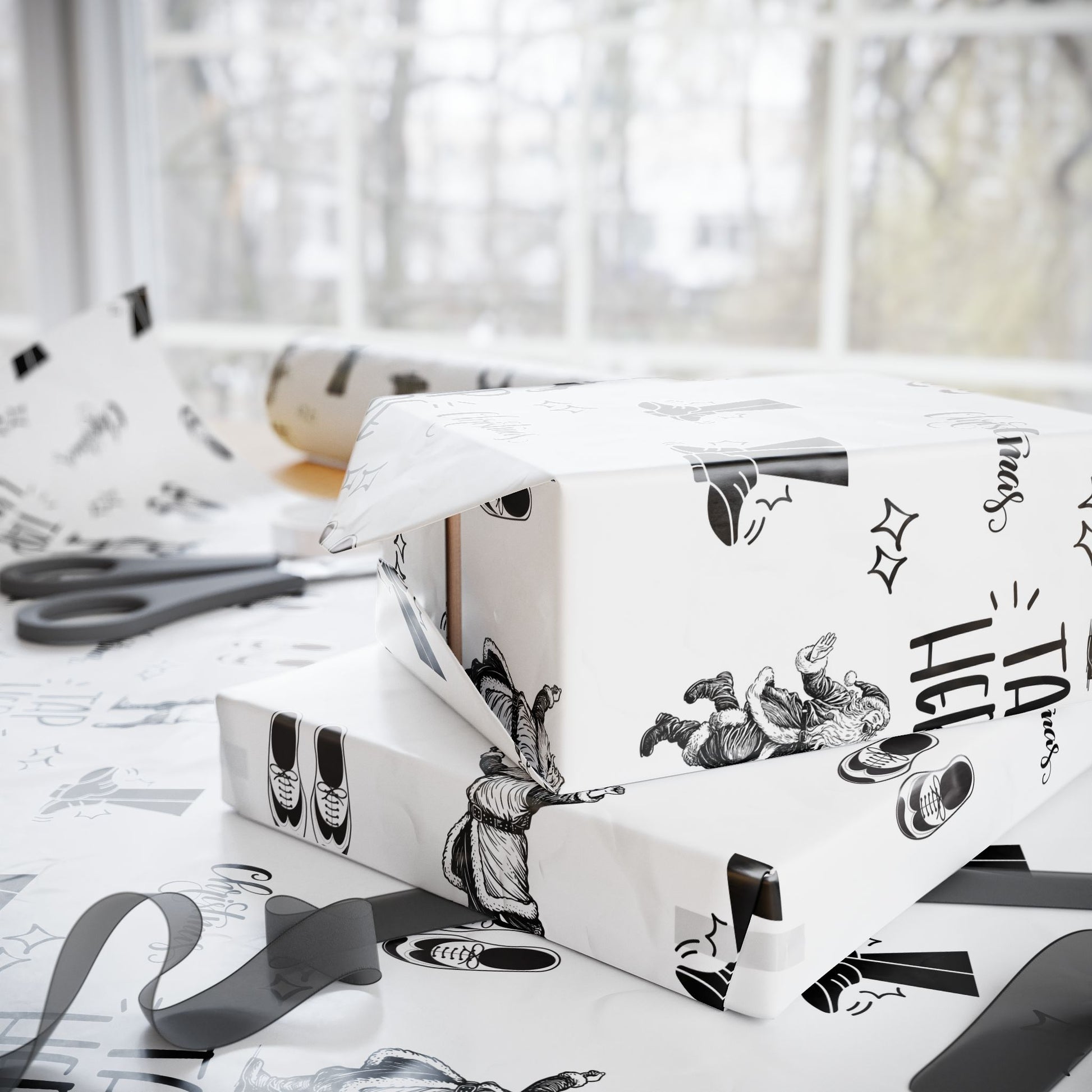 “Tap Here” Christmas Wrapping Paper – Fun Black & White Holiday Gift Wrap with Tap Shoes & Santa Design, Perfect for Tap Dancers & Dance Studios