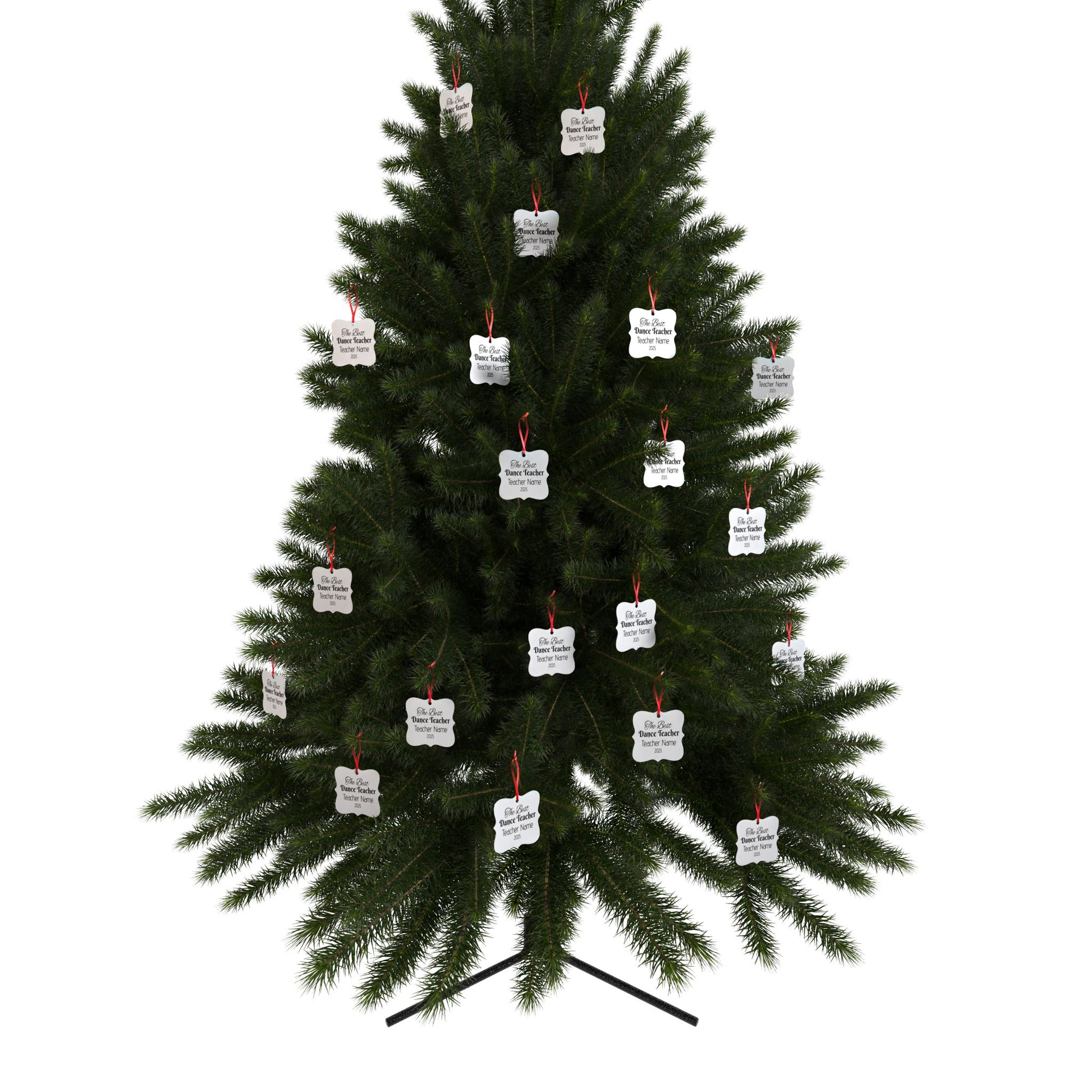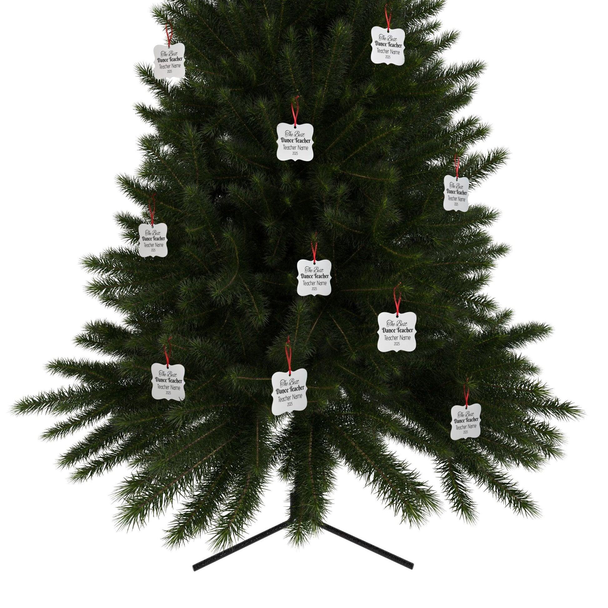 Each piece features a soft matte finish that keeps glare low while letting the vivid colors shine beautifully against the brushed-metal backing. A red satin ribbon threads through the pre-drilled hole, making it ready to hang on a Christmas tree, a studio display, or even a year-round memory wall. Choose from three elegant shapes a square, scalloped corner, or medallion to match your teacher’s style, and order single ornaments or bundles for the whole team.