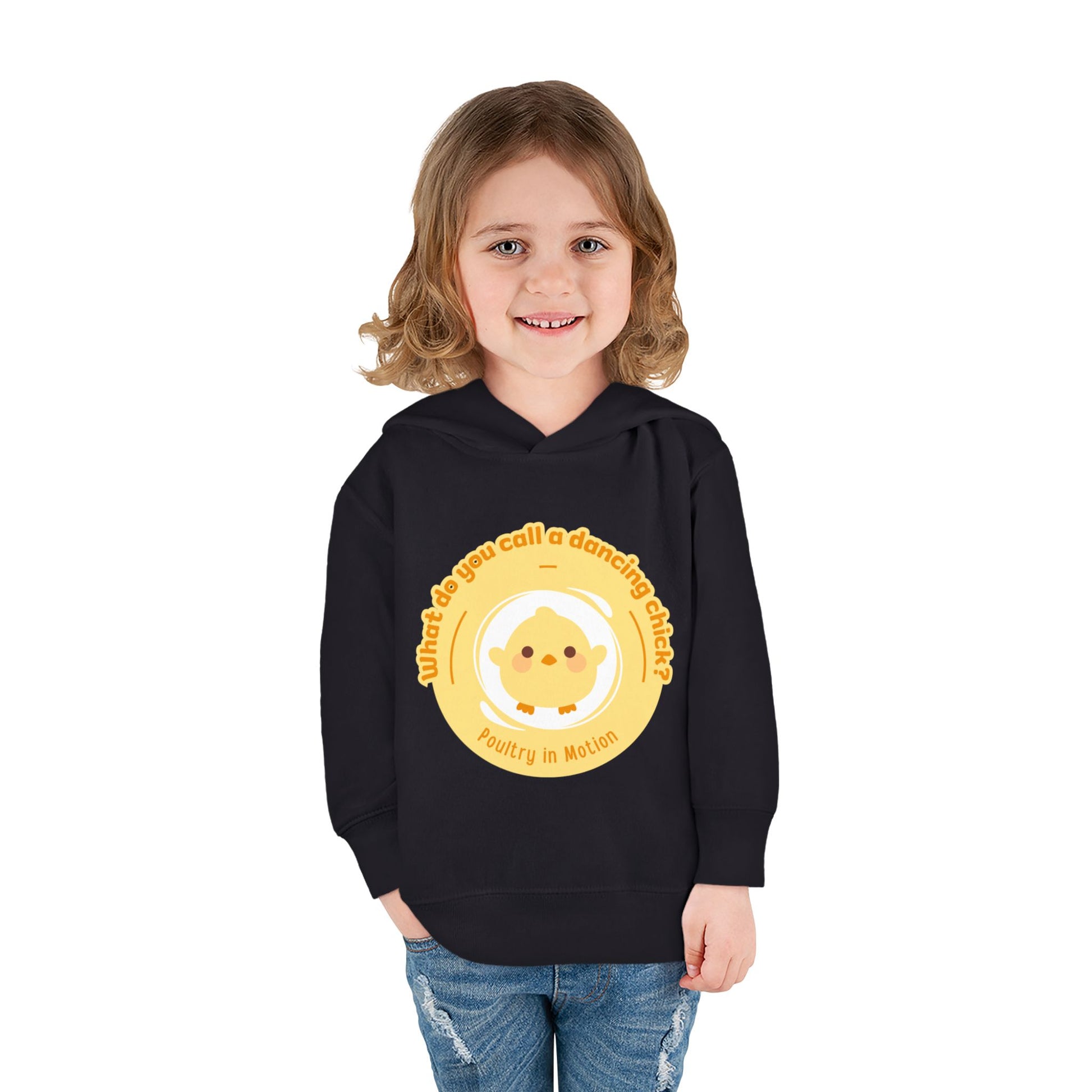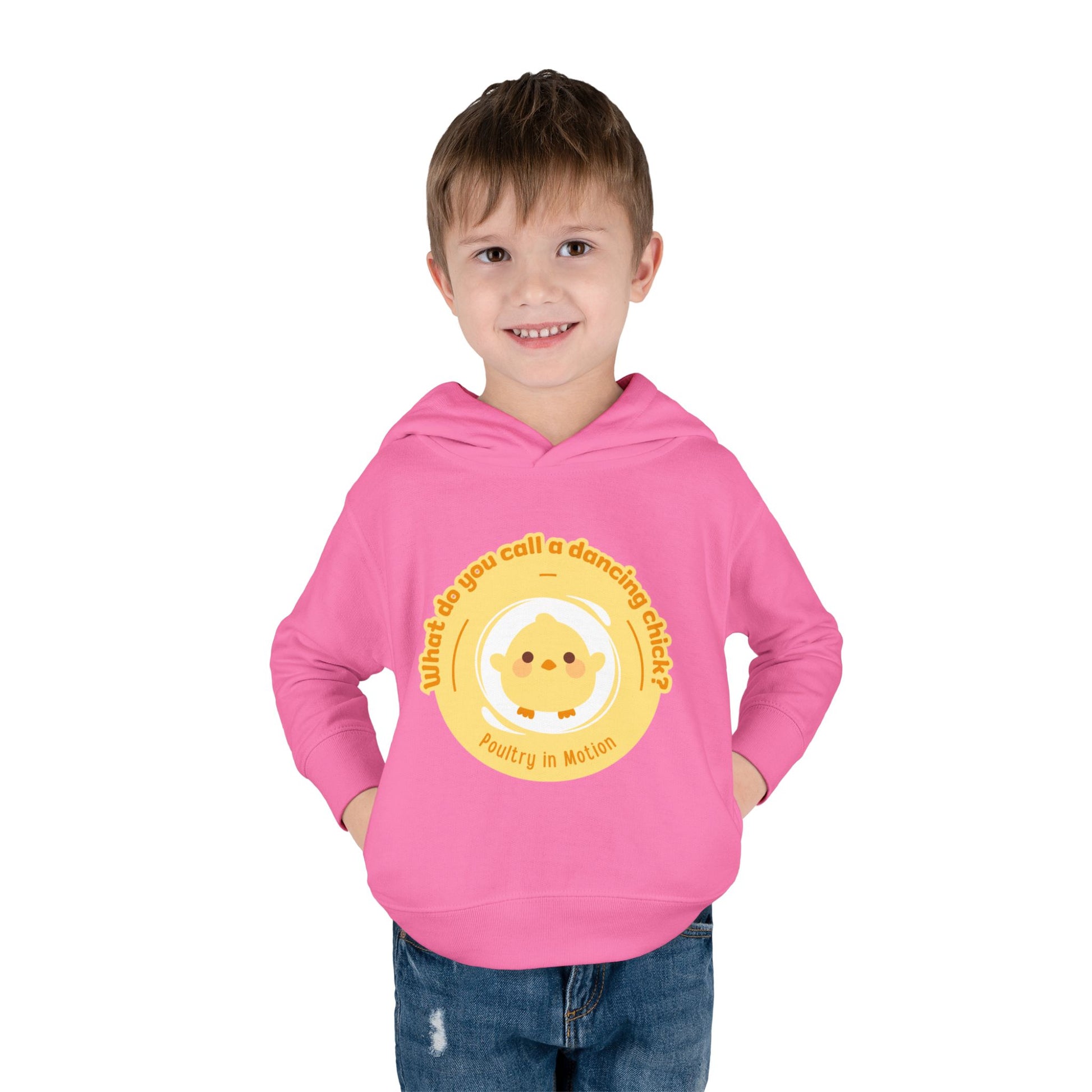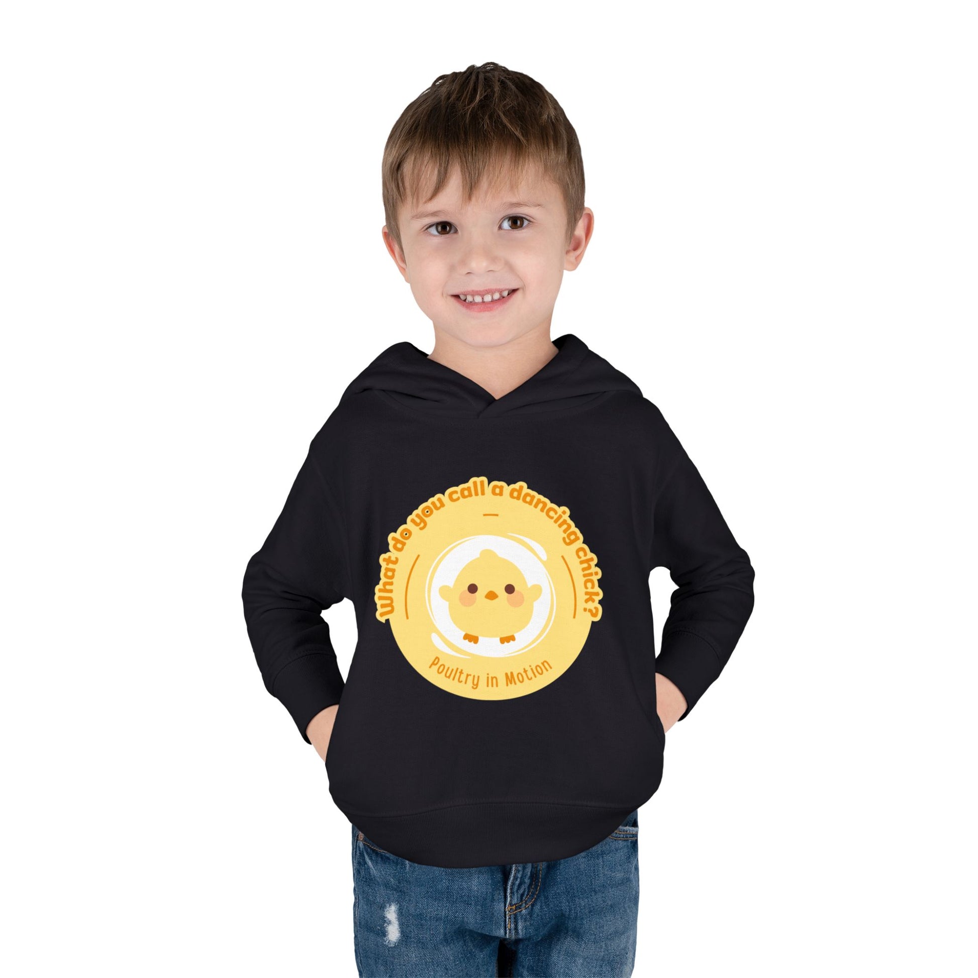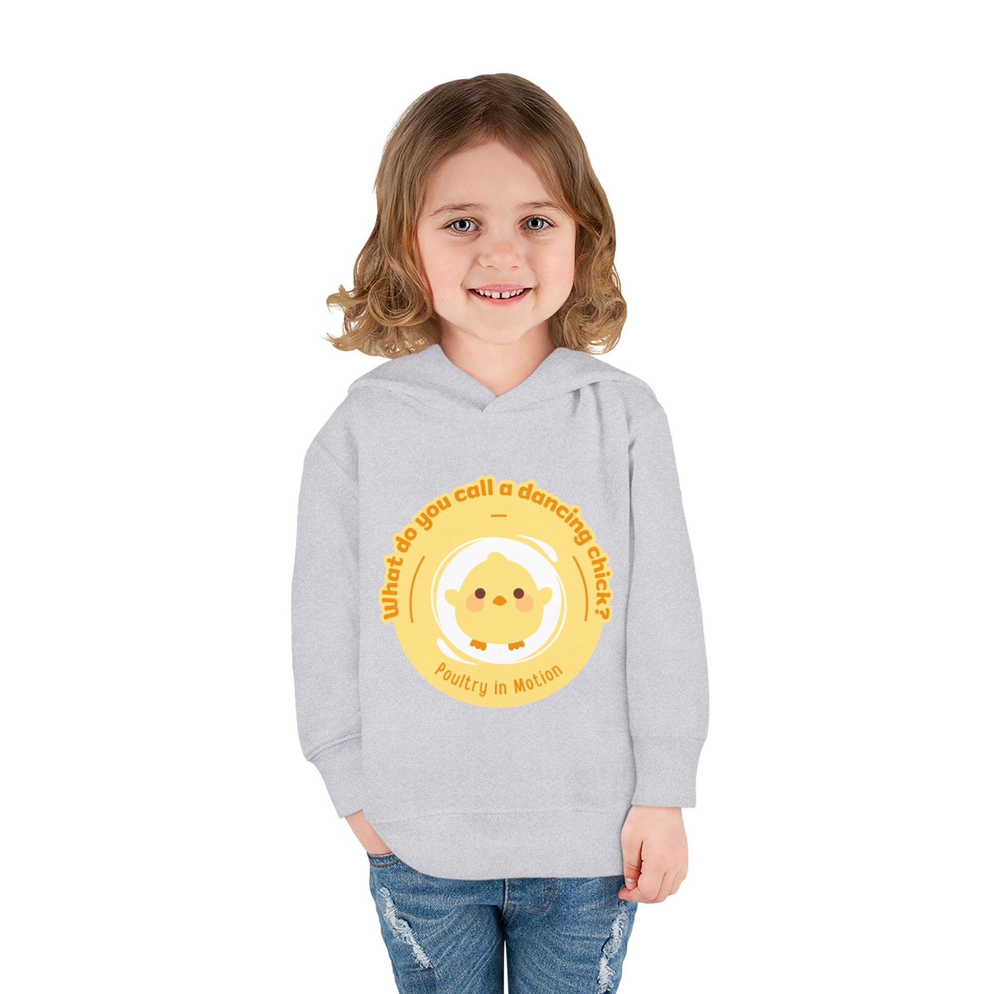 "What do you call a dancing chick? Poultry in Motion." Toddler Pullover Hoodie – Funny Dancing Chicken Pun Graphic Fleece Sweatshirt for Kids