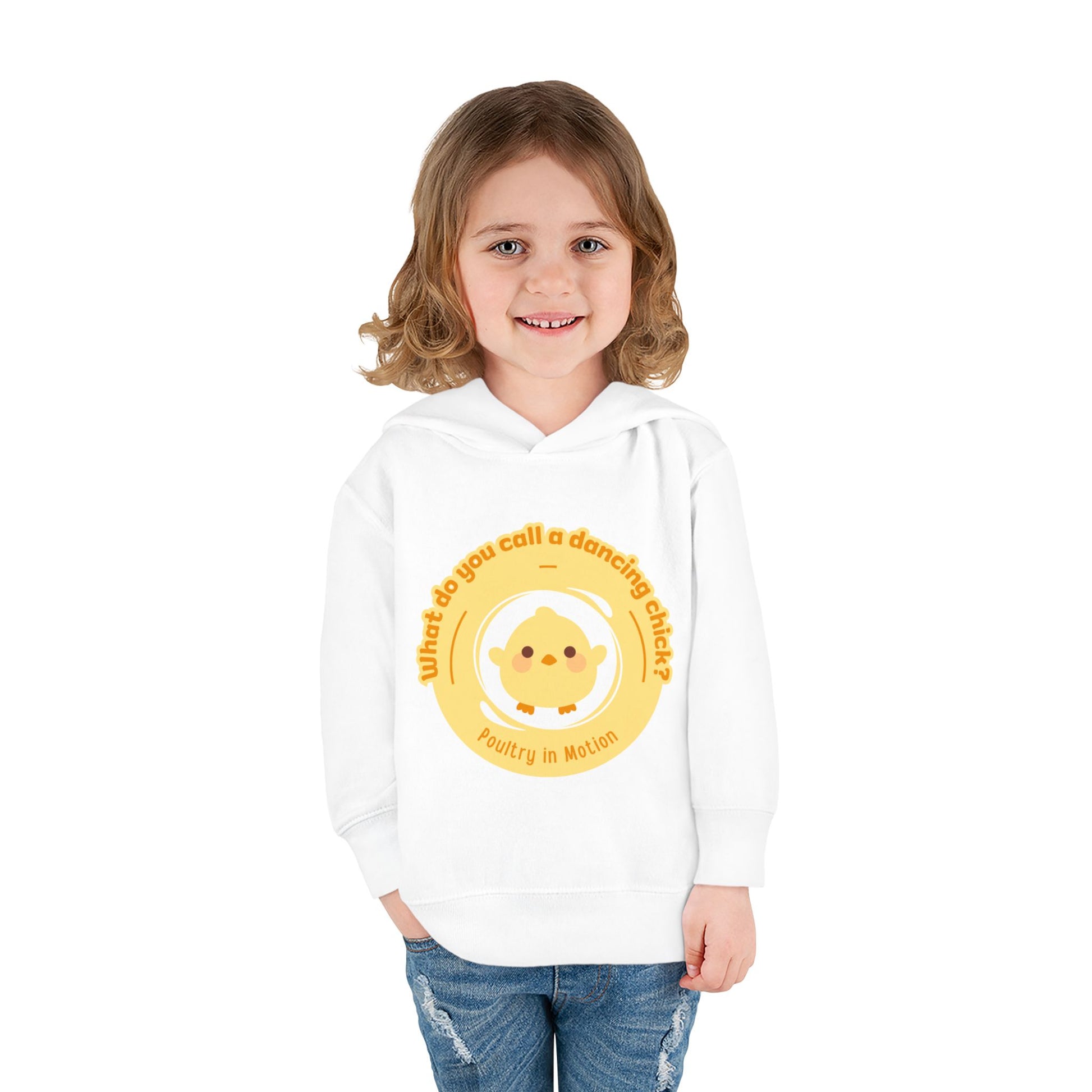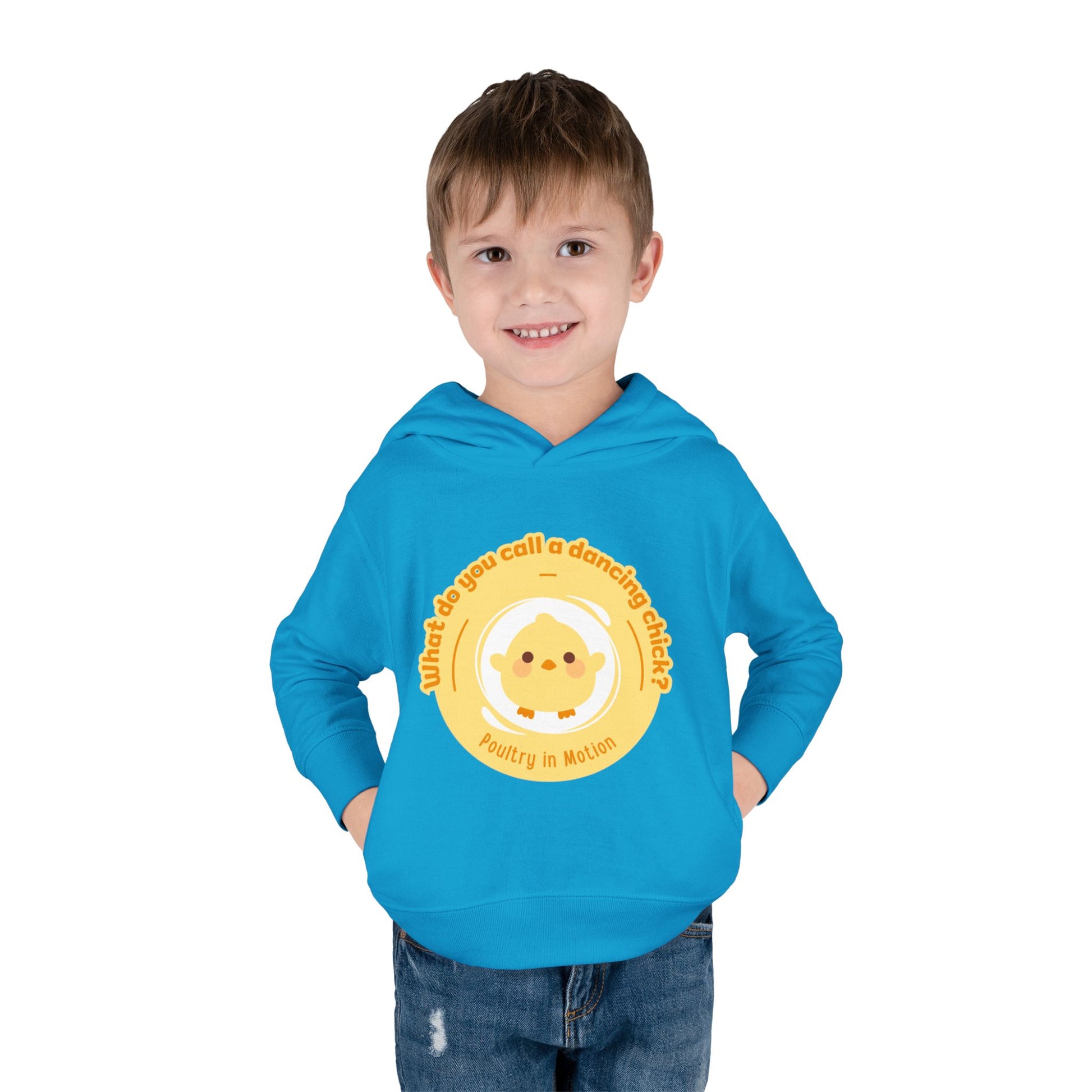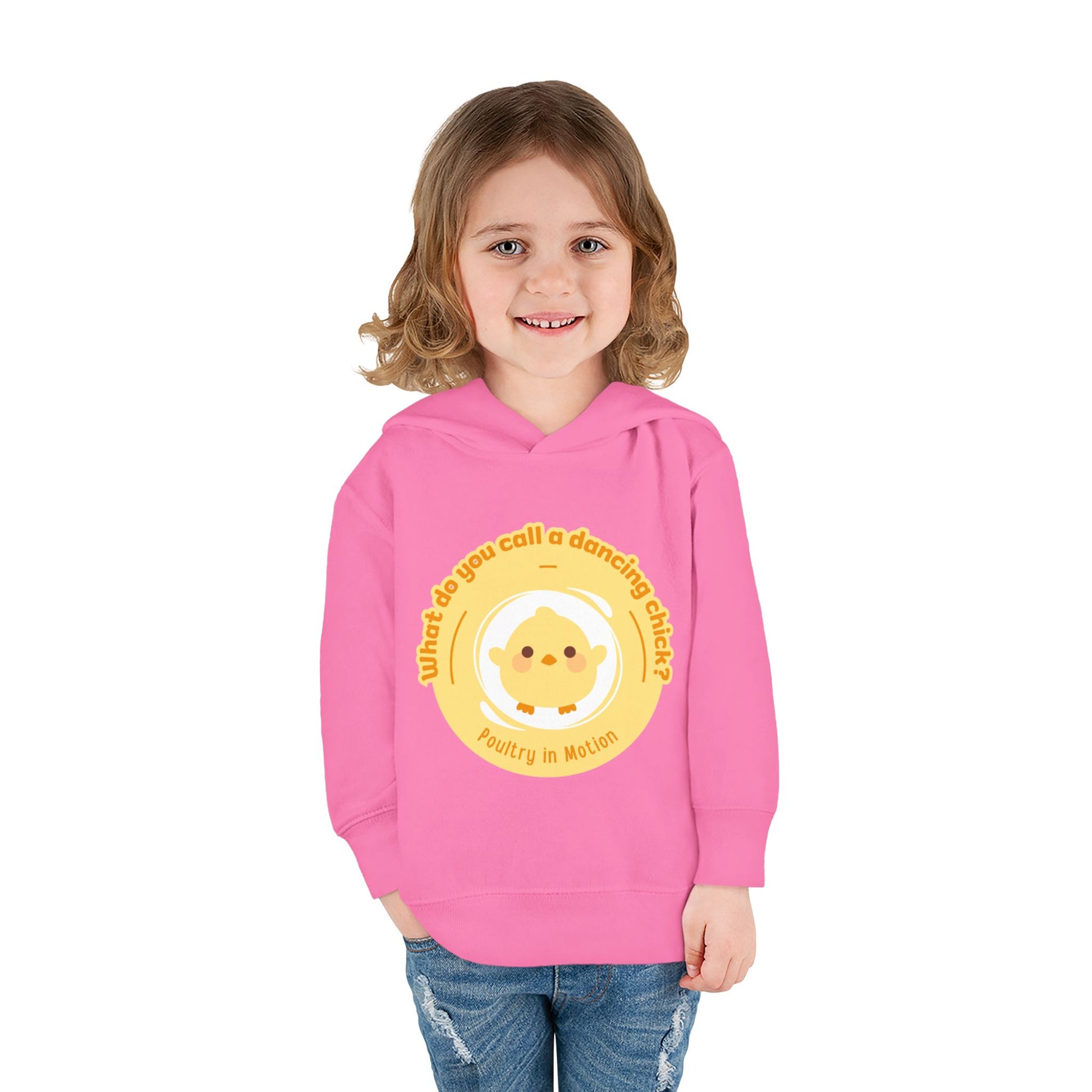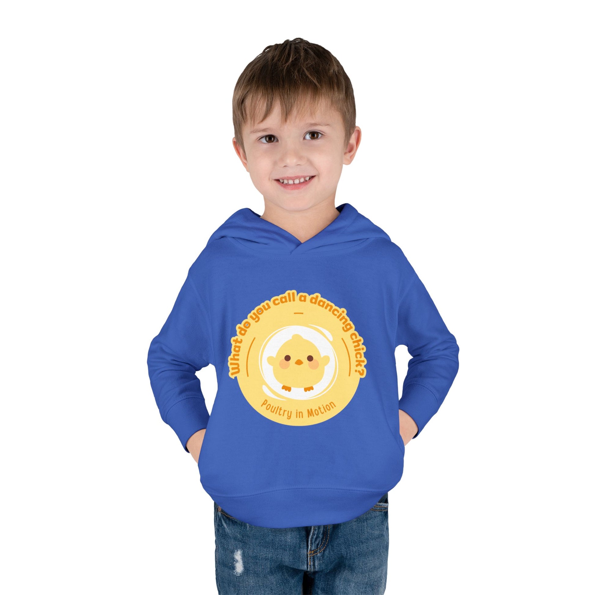 "What do you call a dancing chick? Poultry in Motion." Toddler Pullover Hoodie – Funny Dancing Chicken Pun Graphic Fleece Sweatshirt for Kids