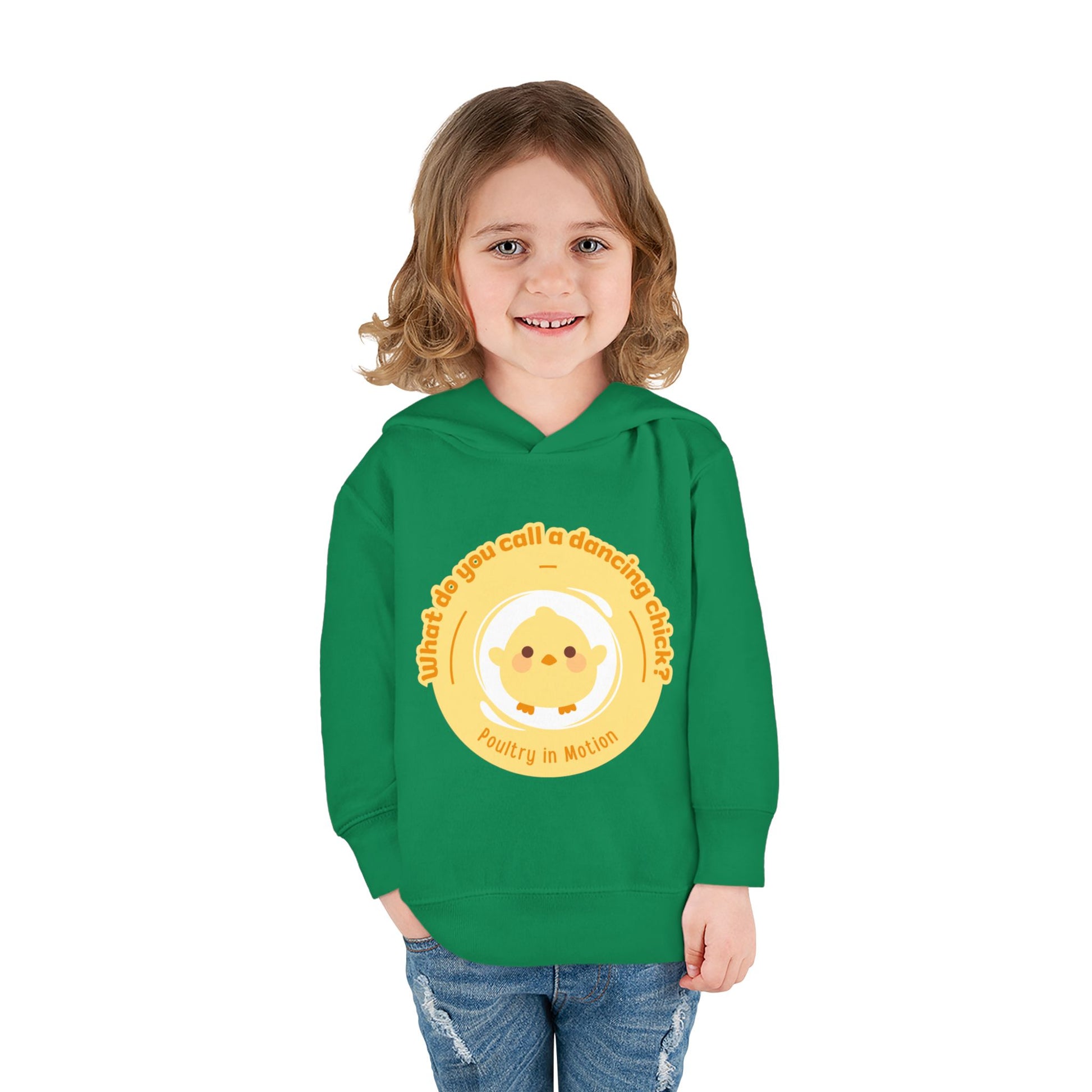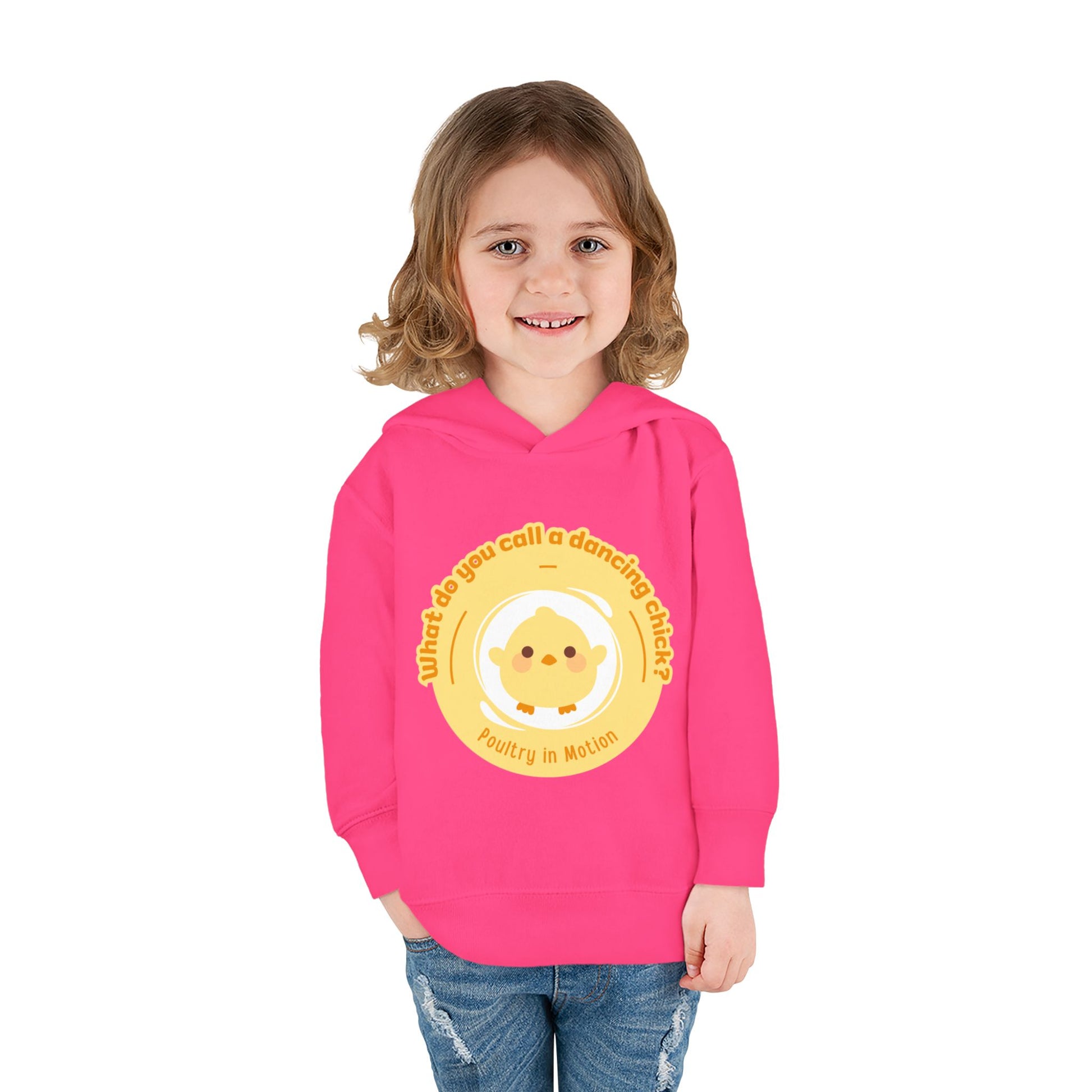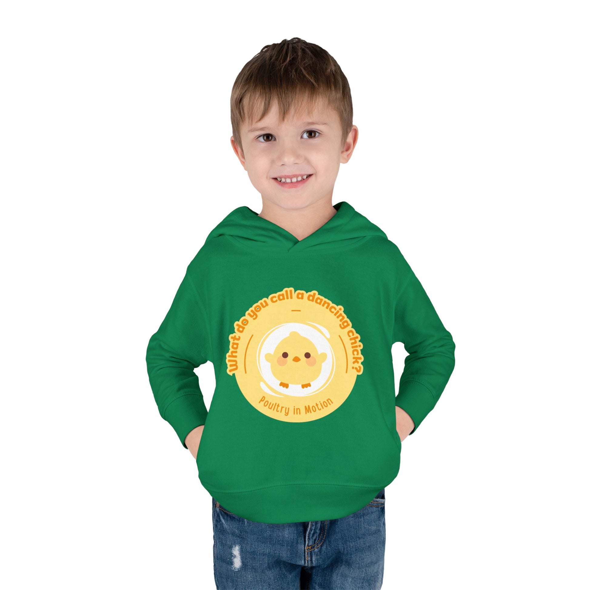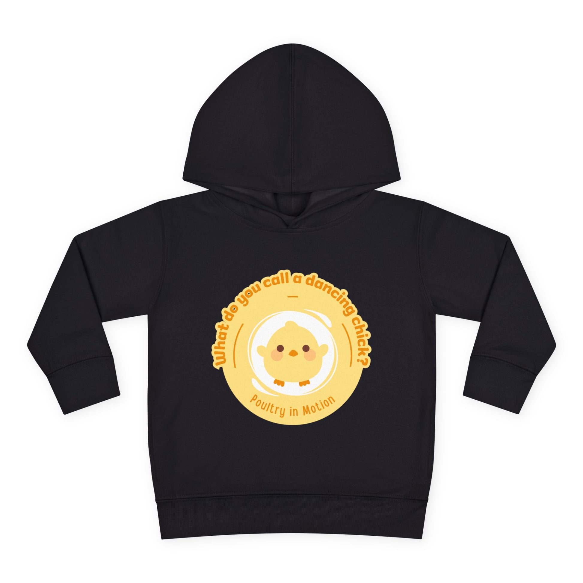 "What do you call a dancing chick? Poultry in Motion." Toddler Pullover Hoodie – Funny Dancing Chicken Pun Graphic Fleece Sweatshirt for Kids