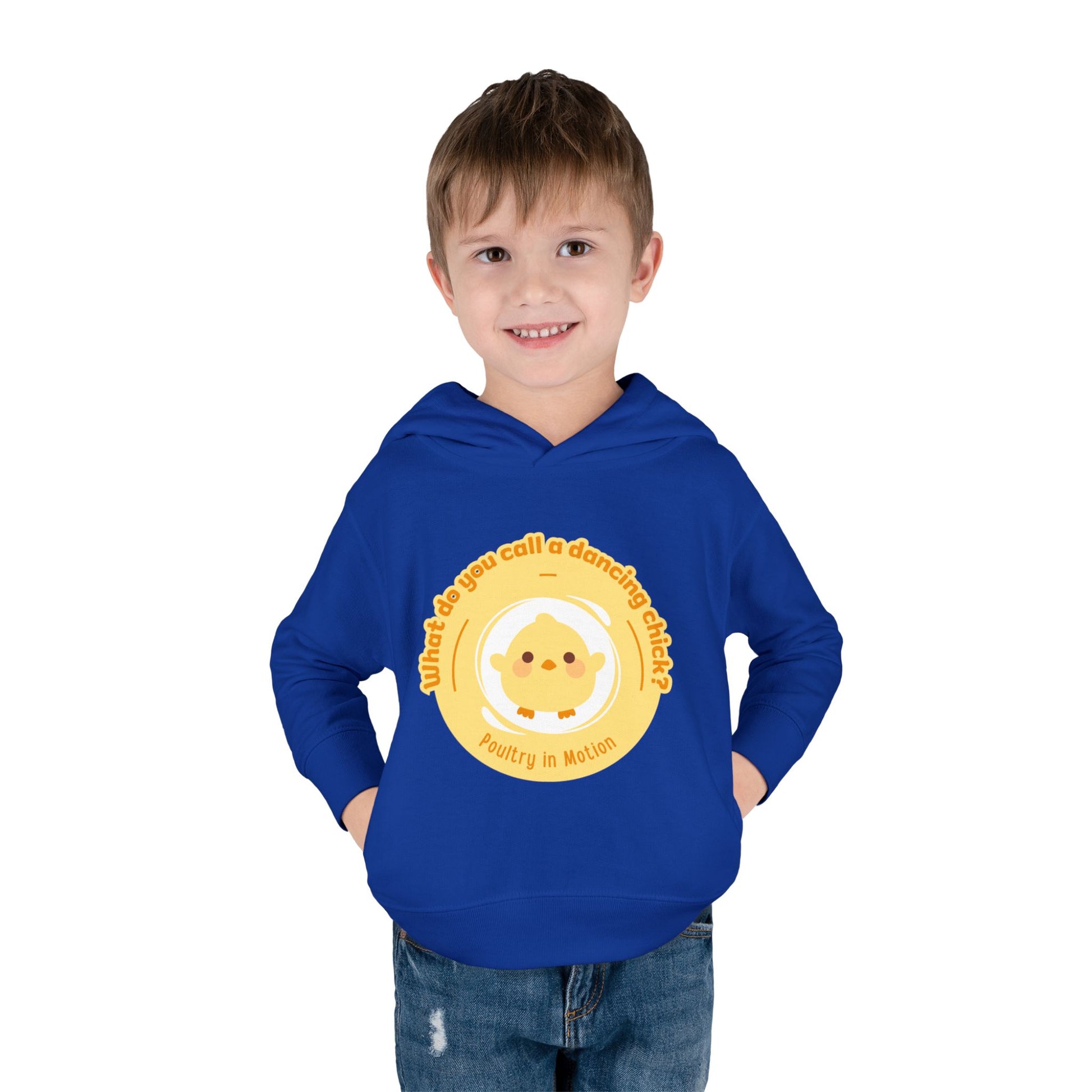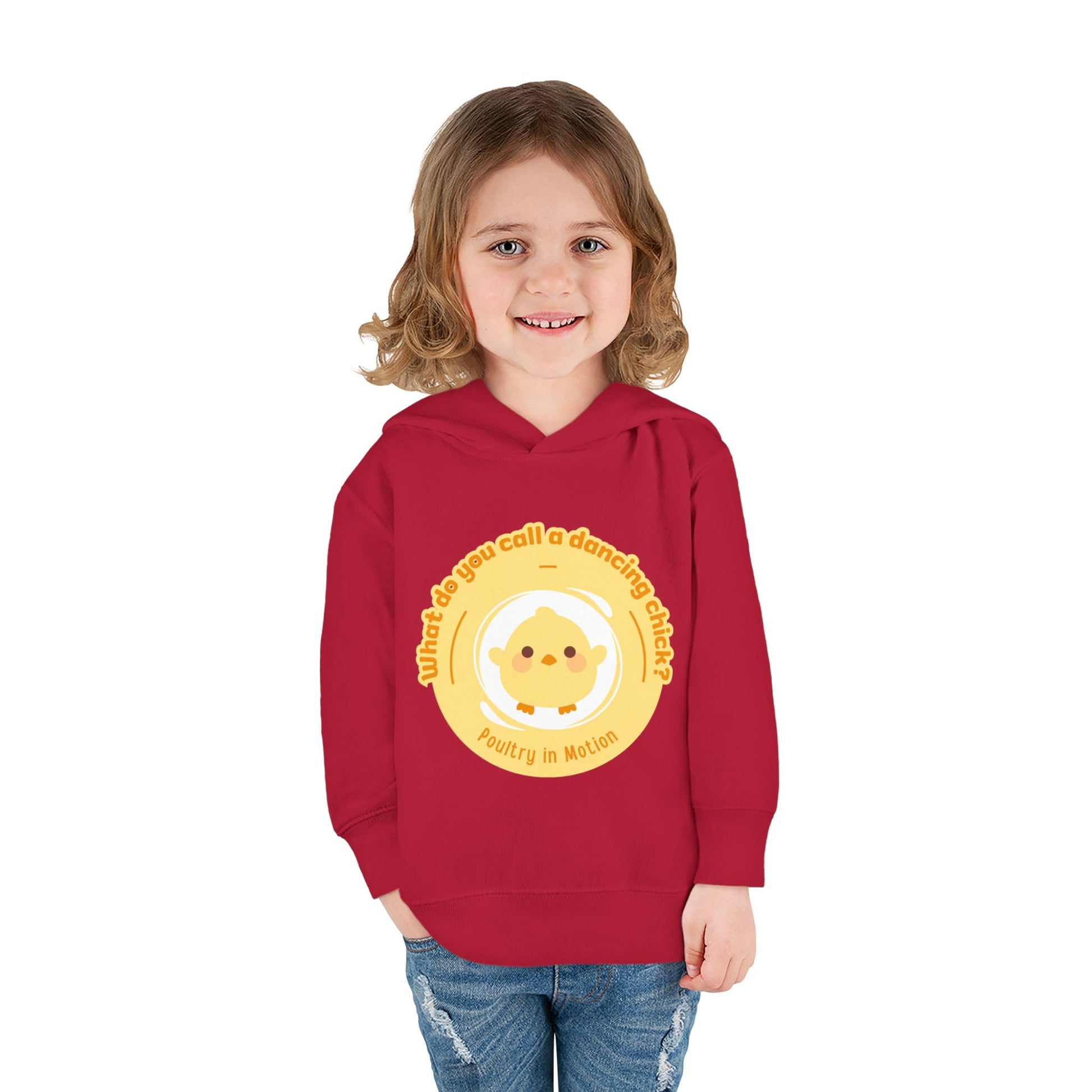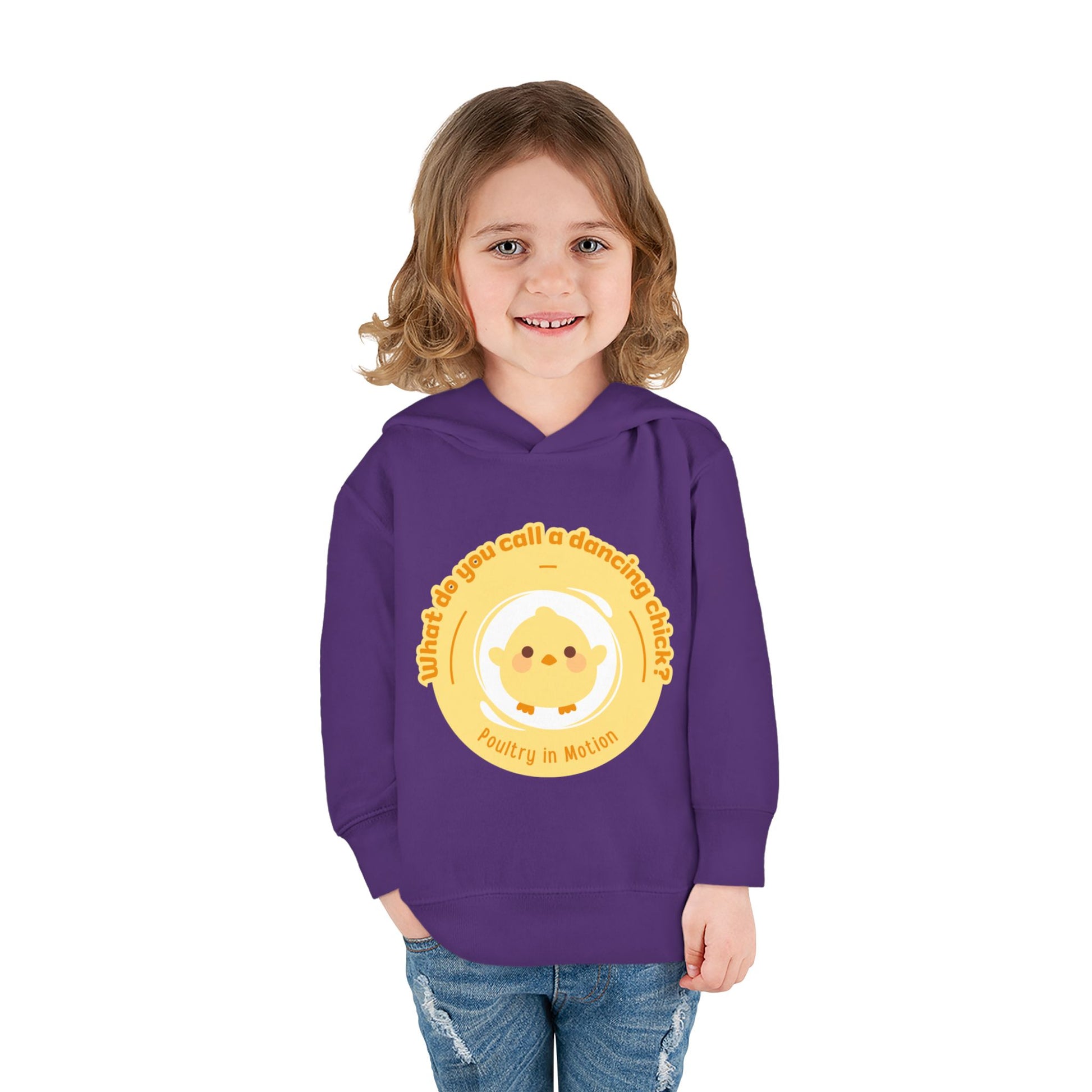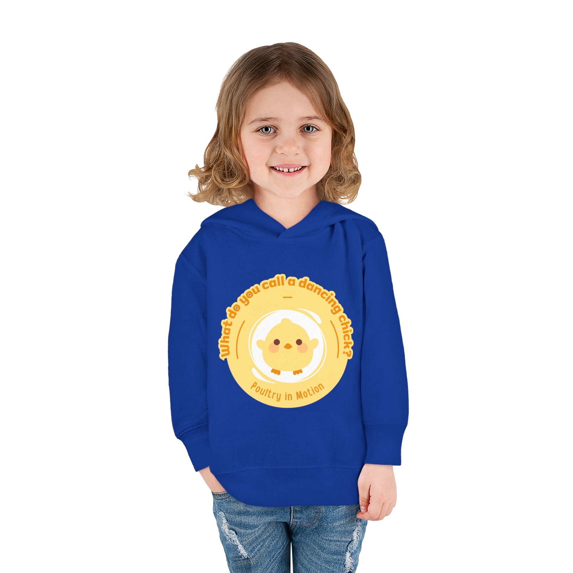 "What do you call a dancing chick? Poultry in Motion." Toddler Pullover Hoodie – Funny Dancing Chicken Pun Graphic Fleece Sweatshirt for Kids