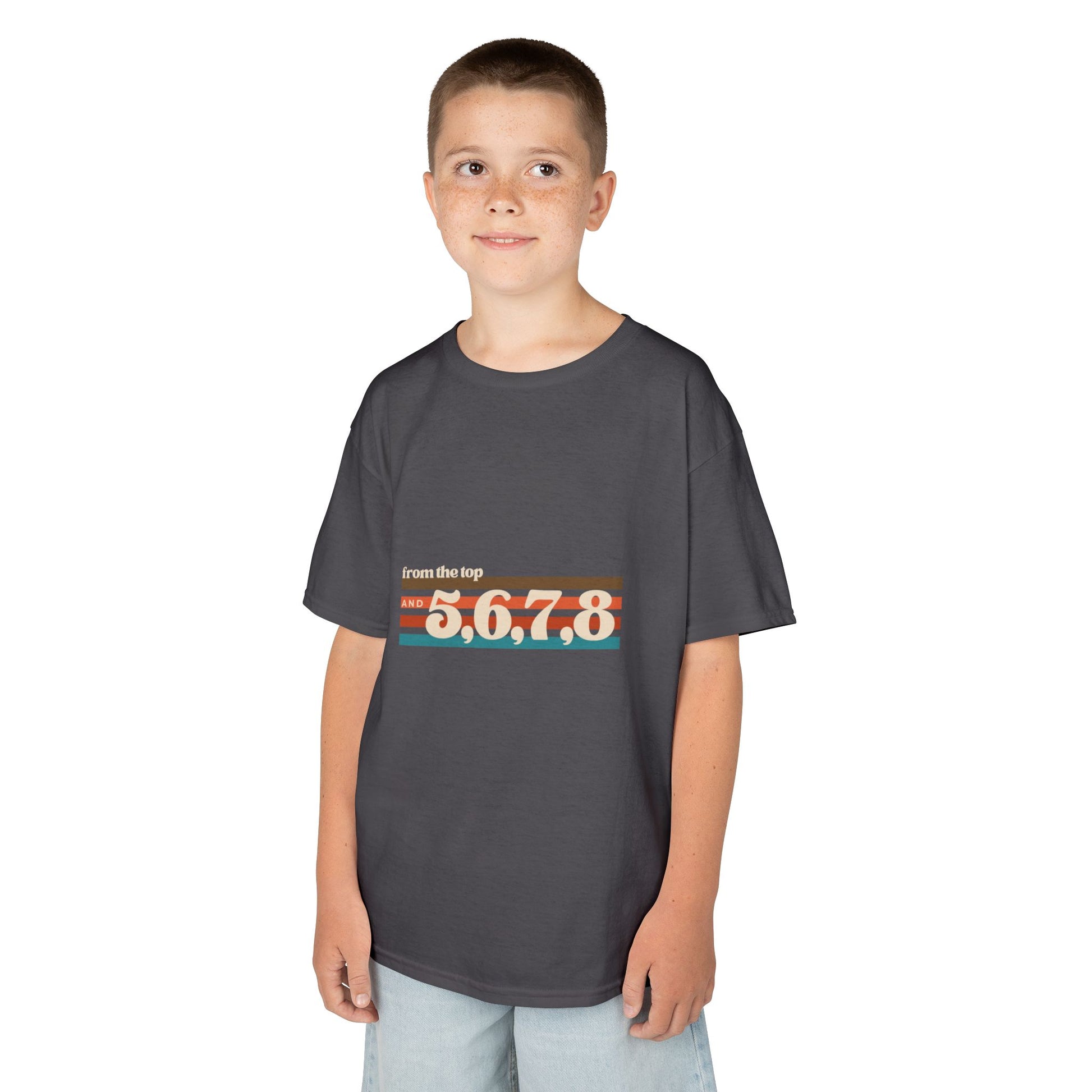 “From the Top and 5, 6, 7, 8” Youth Short Sleeve Tee – Retro Graphic Dance Shirt for Kids and Young Performers