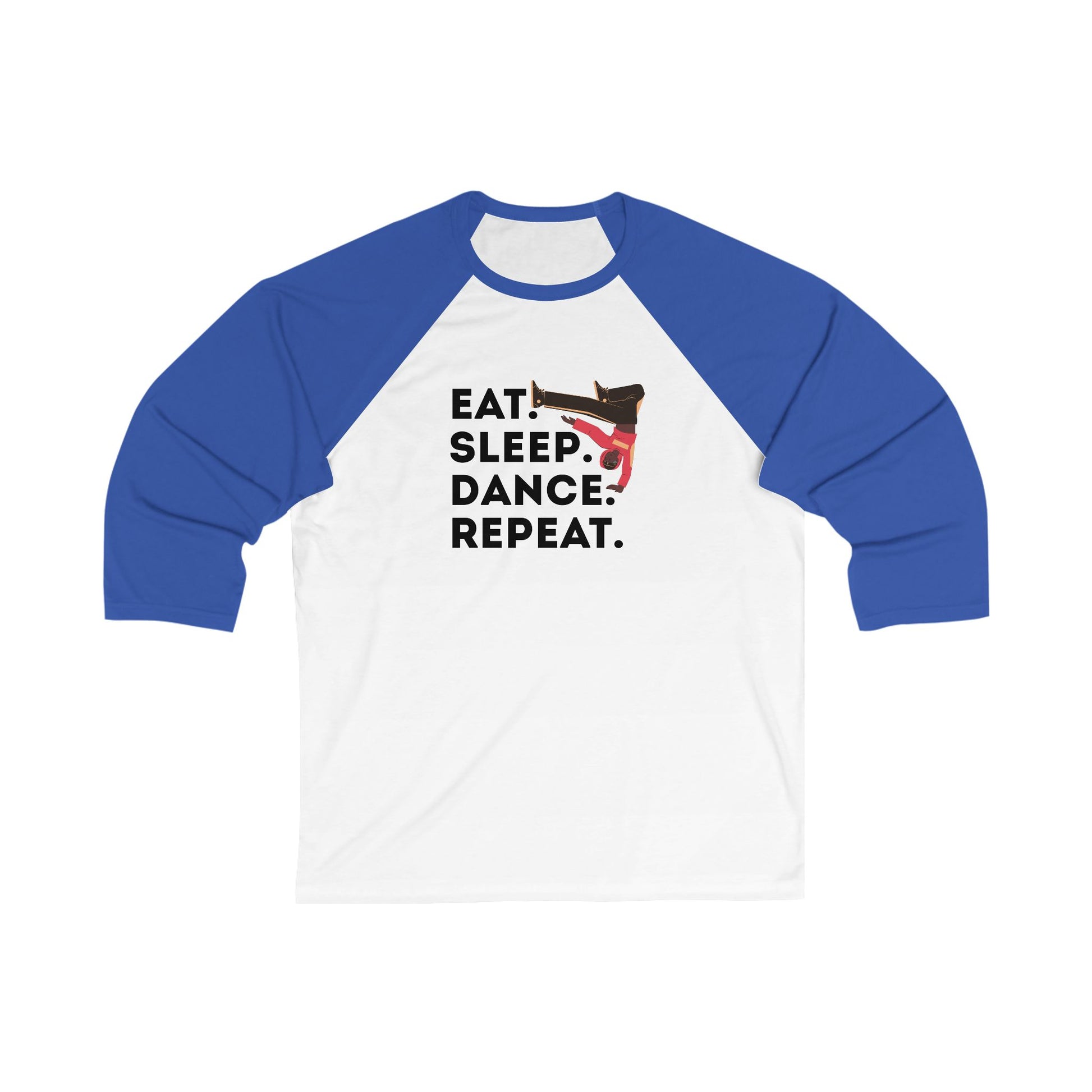"Eat Sleep Dance Repeat" Unisex 3/4 Sleeve Baseball Tee – Bold B-Boy Dancer Graphic Dance Shirt for Street and Hip-Hop Dancers