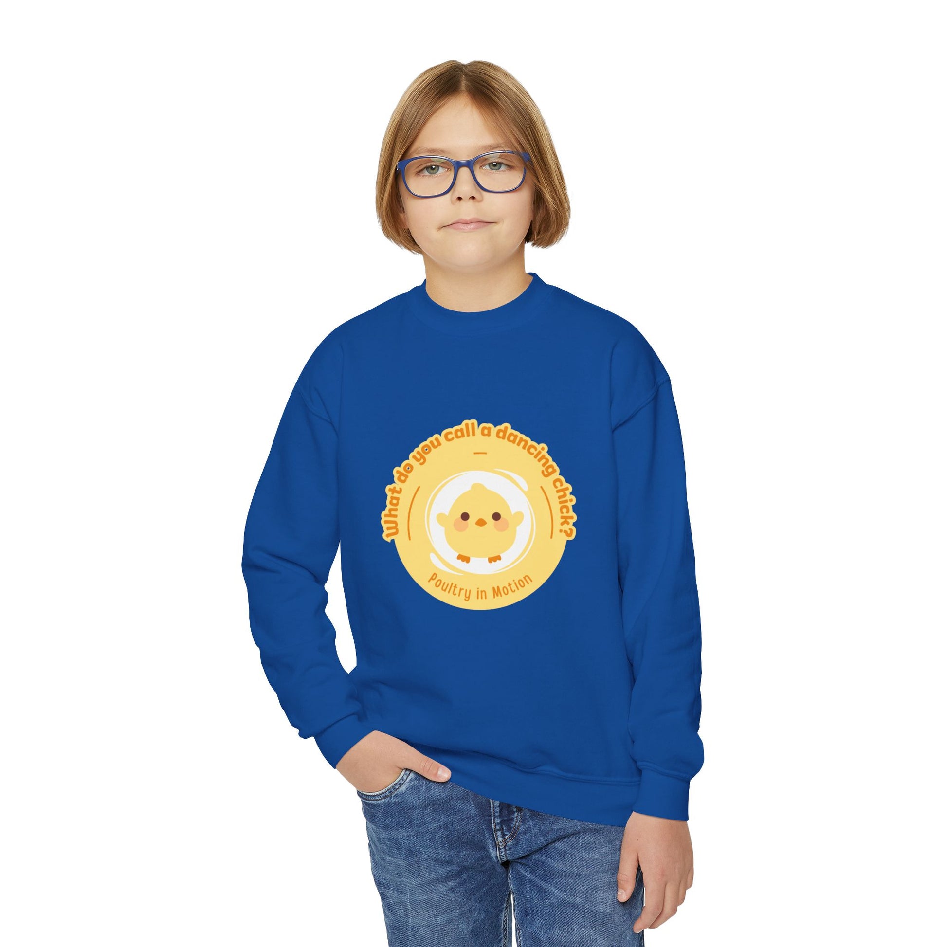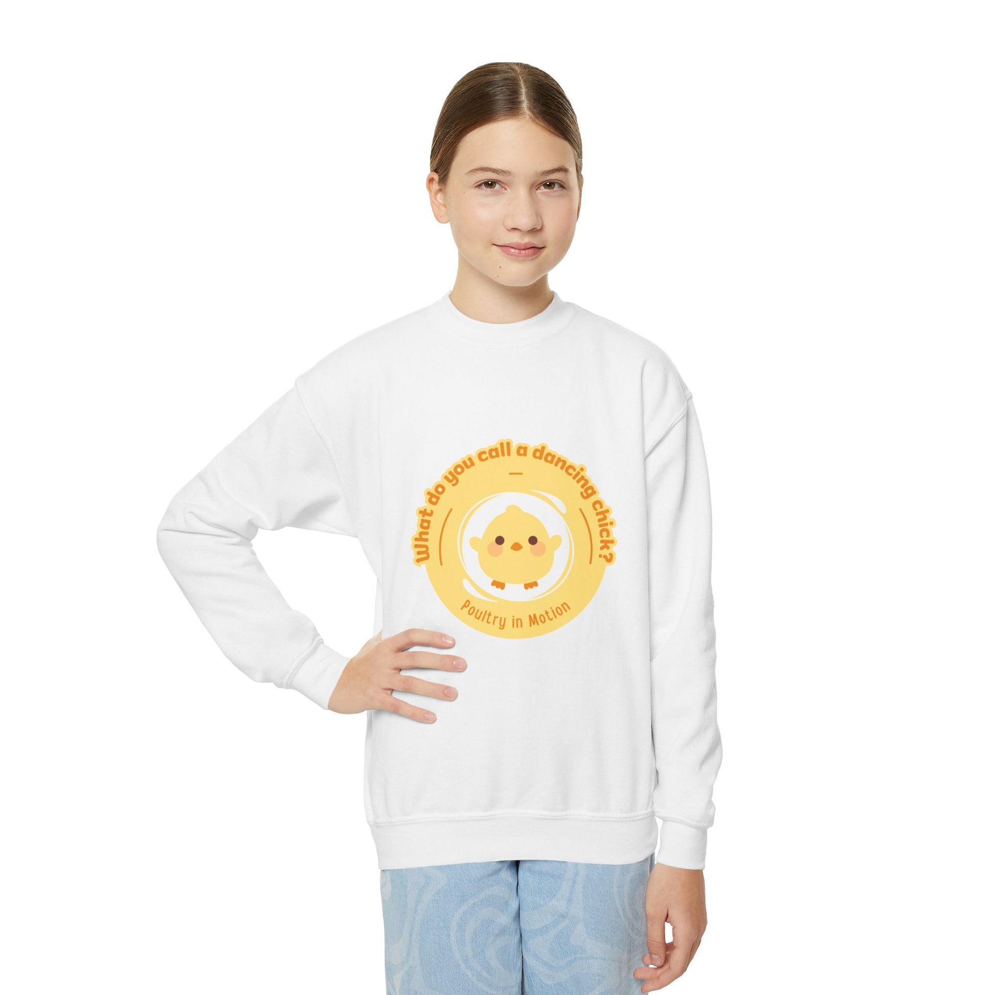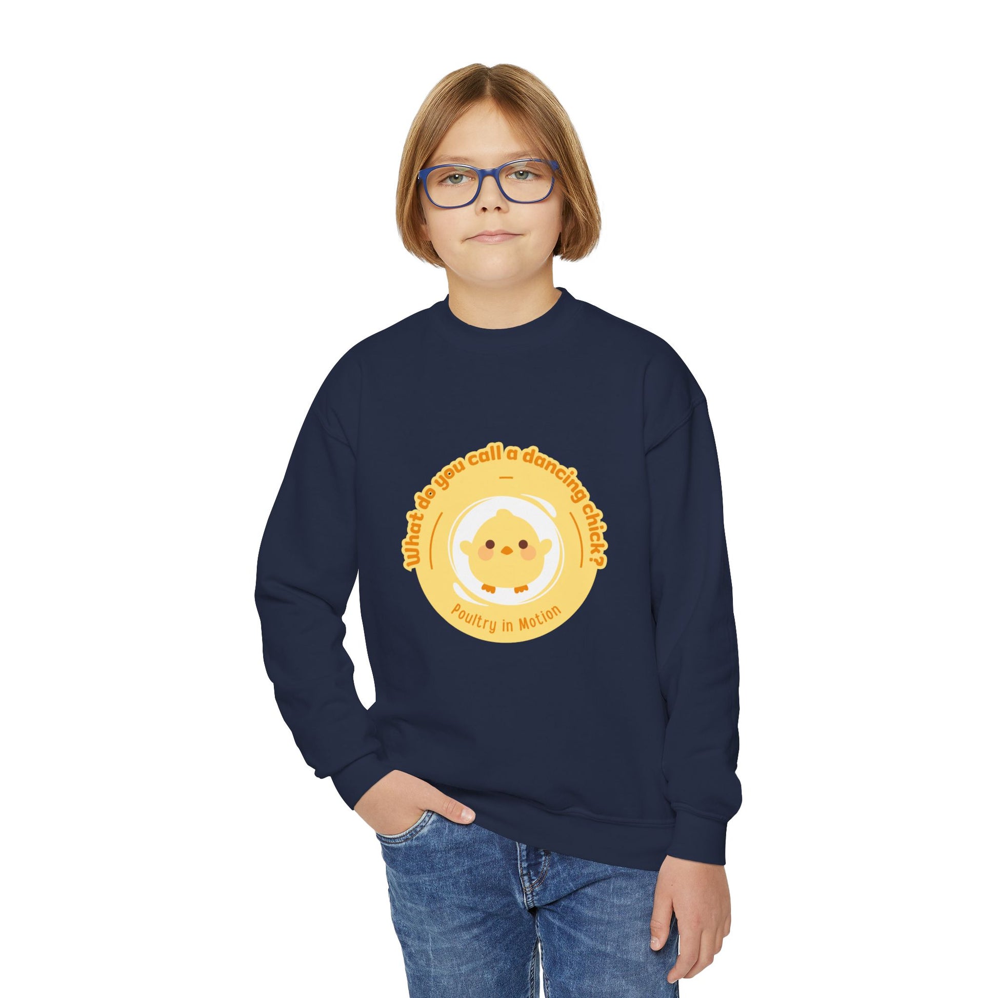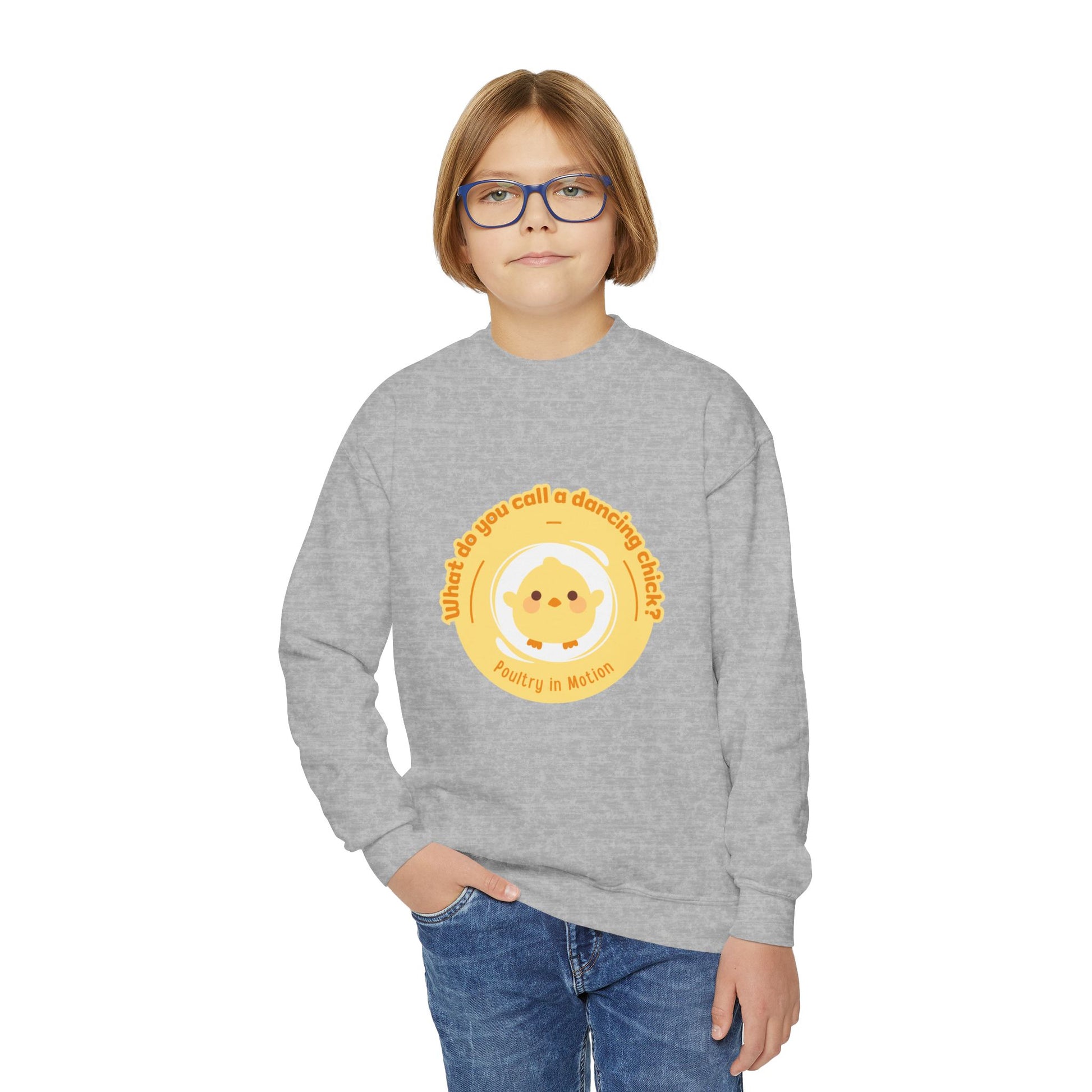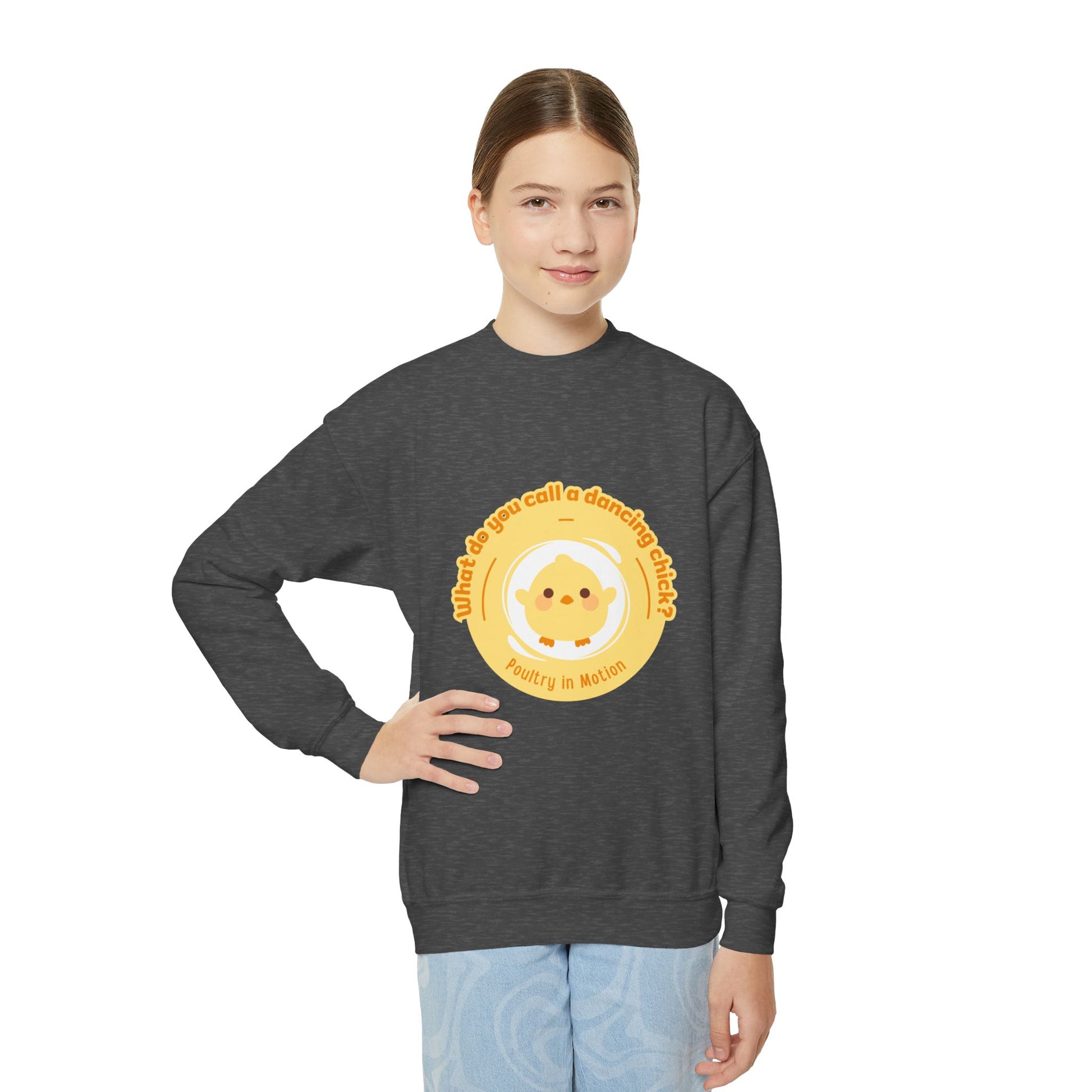 "What do you call a dancing chick? Poultry in Motion." – Funny Dance Pun Youth Crewneck Sweatshirt | Cute Dancing Chicken Kids Pullover