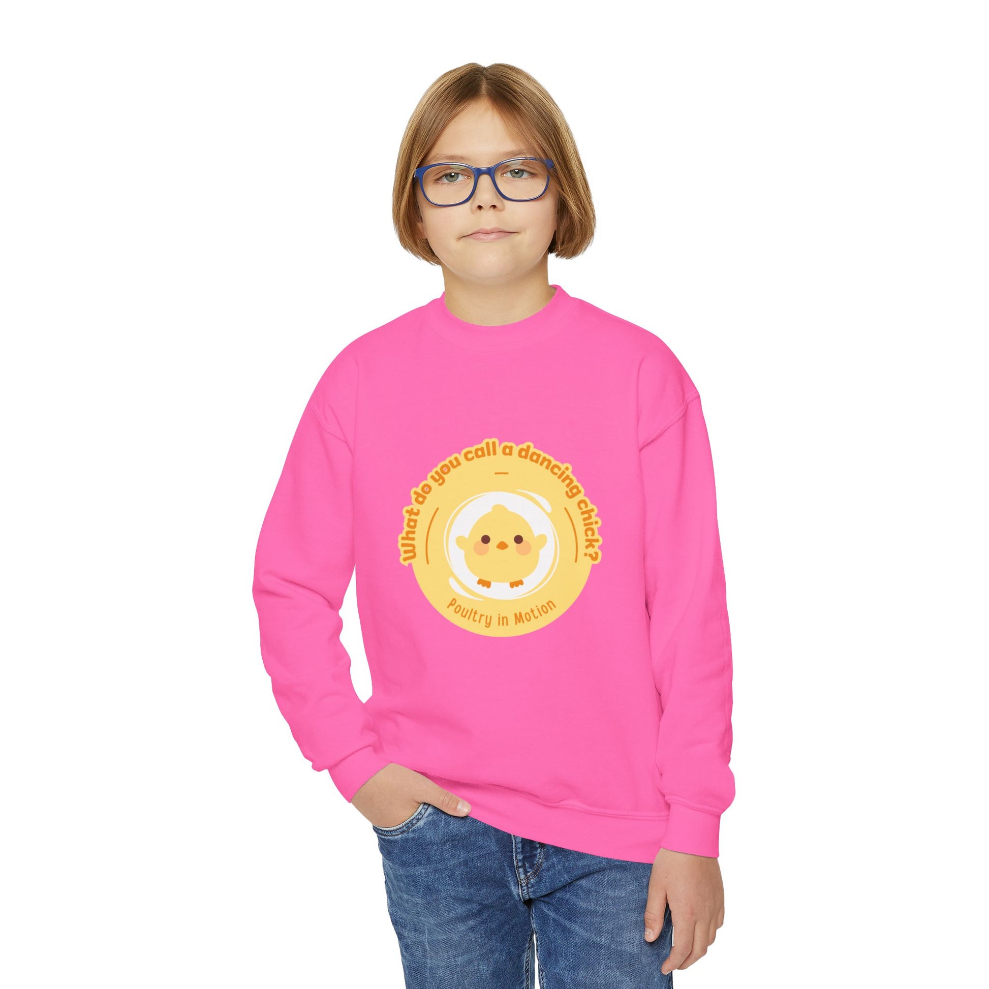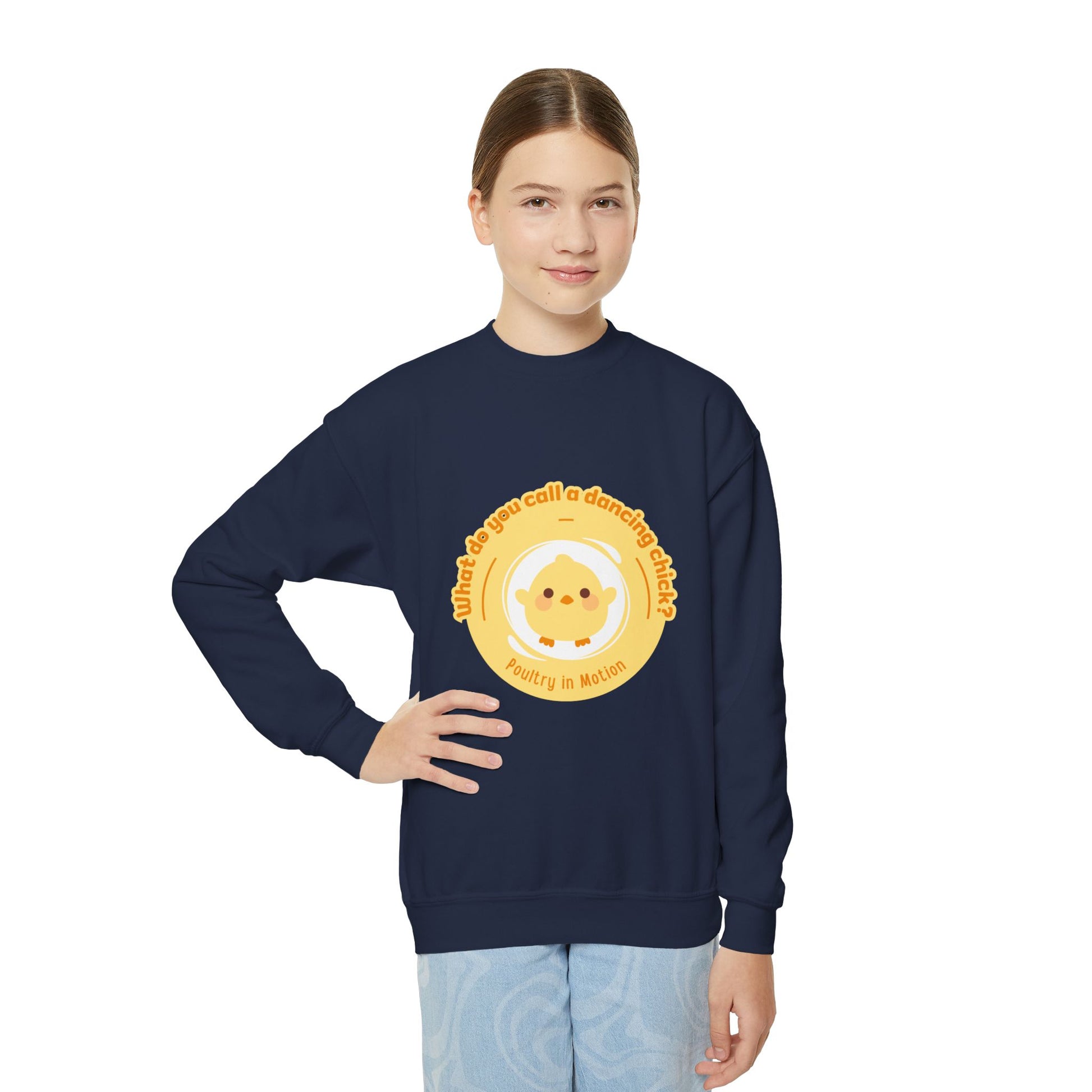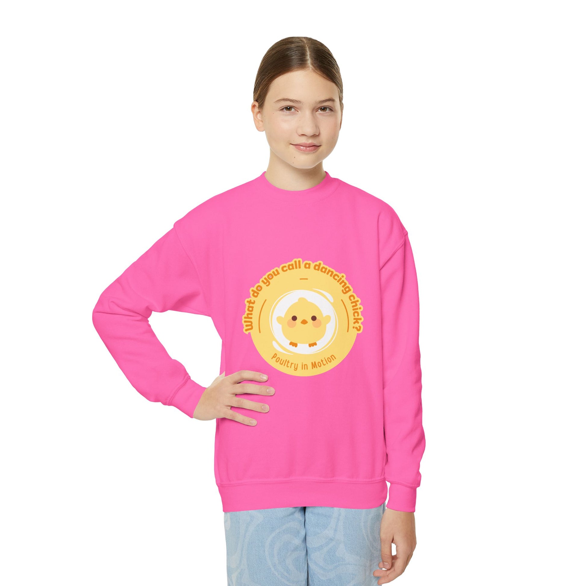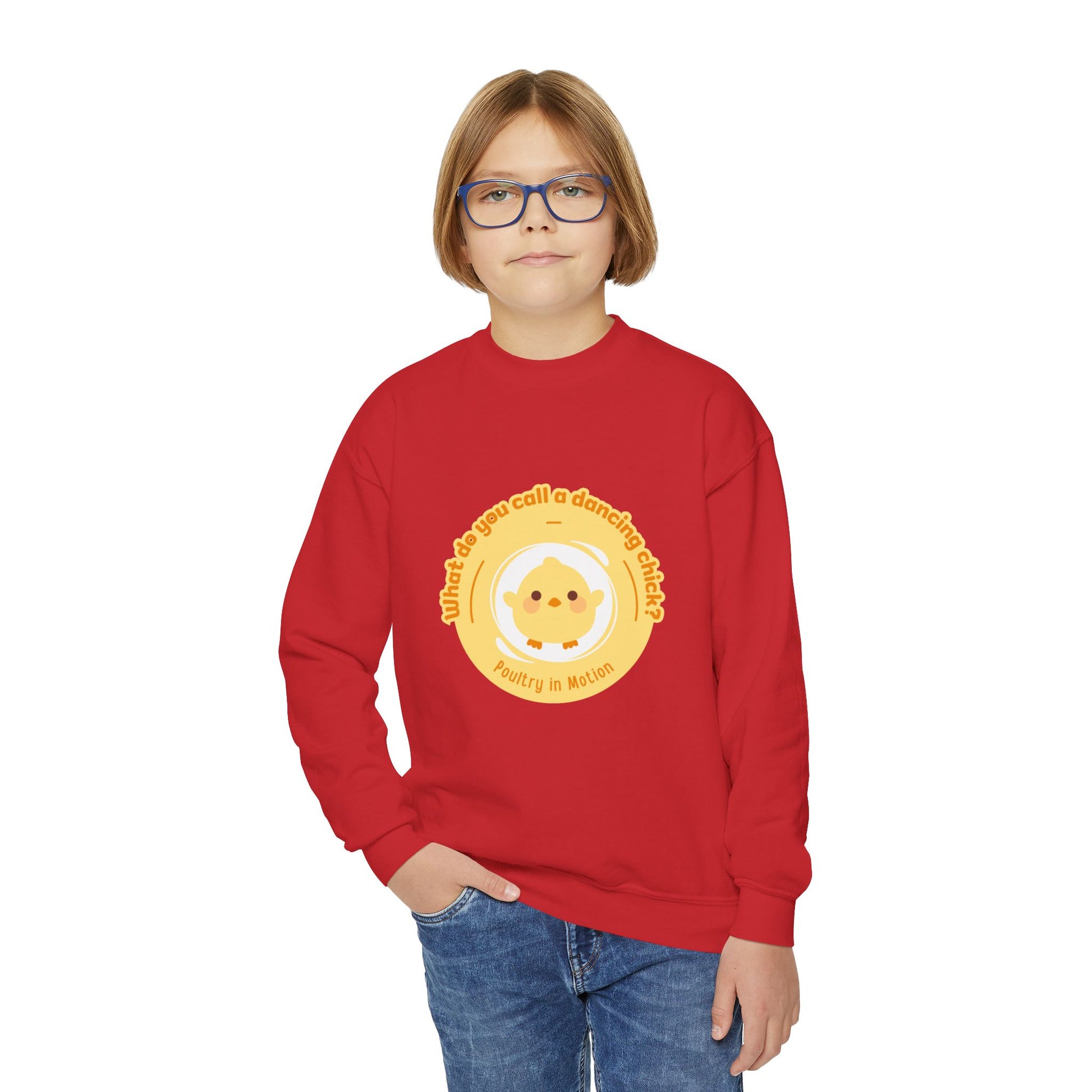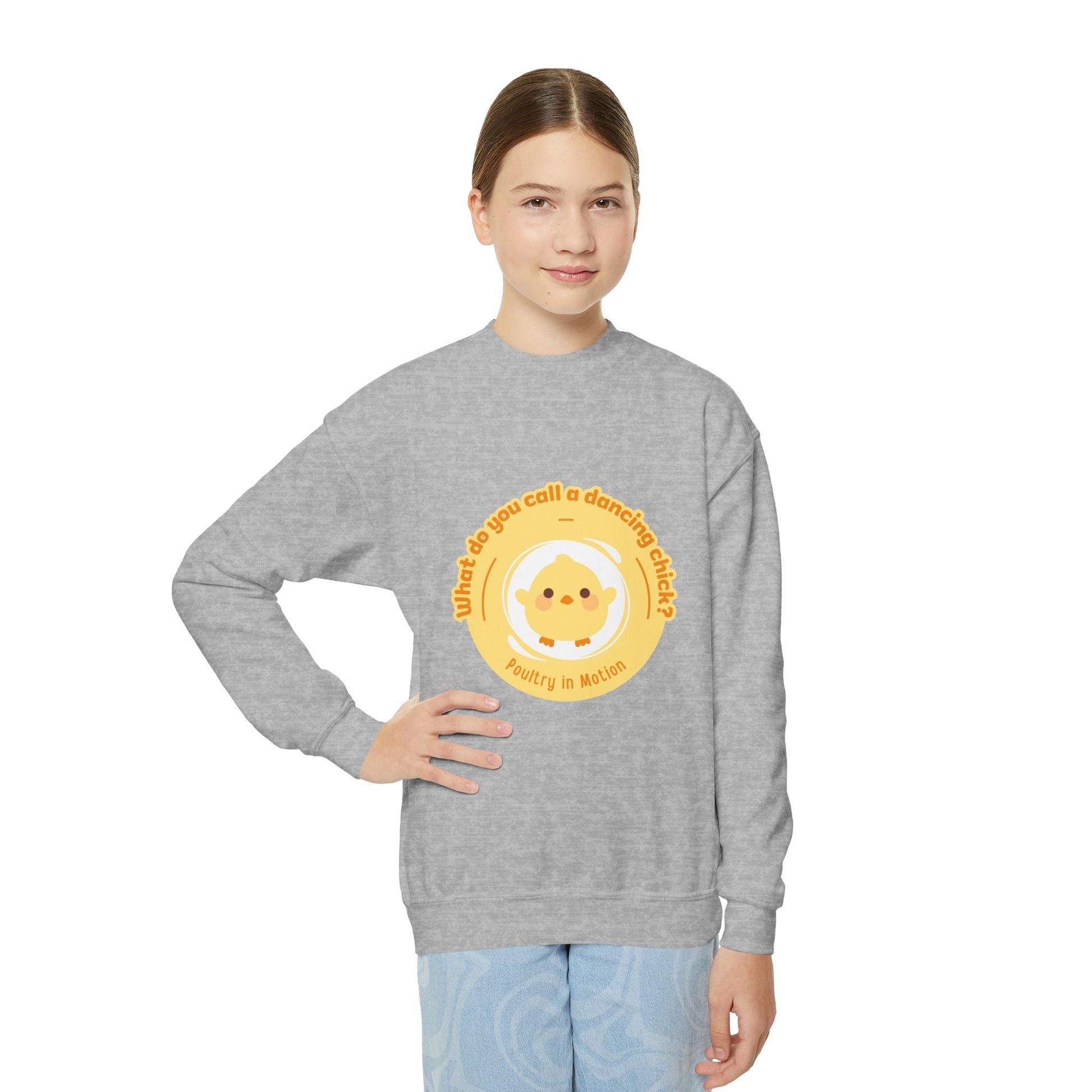 "What do you call a dancing chick? Poultry in Motion." – Funny Dance Pun Youth Crewneck Sweatshirt | Cute Dancing Chicken Kids Pullover