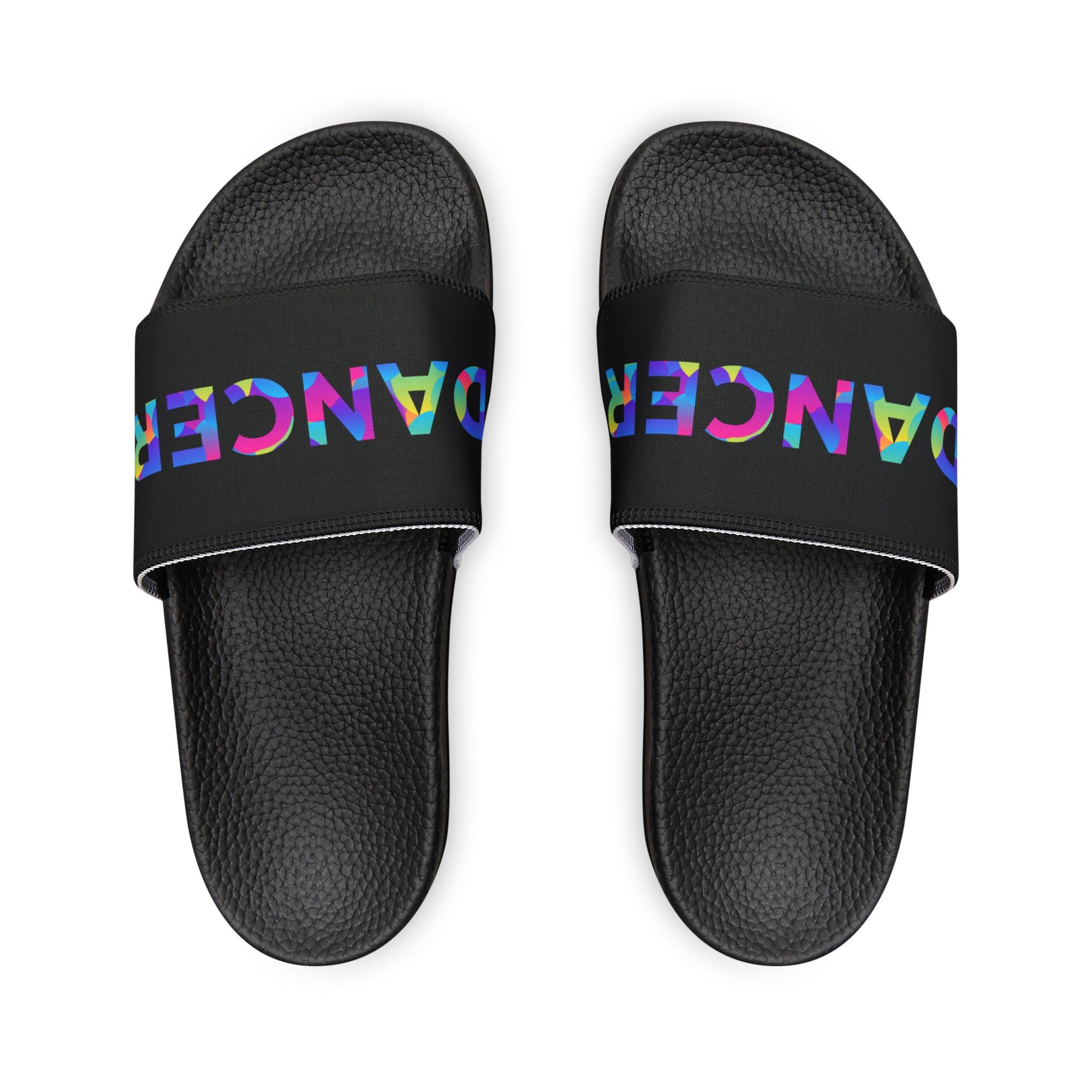 YOUTH SIZES - “Dancer” Colorful Text – Dance-Inspired Custom Slides with Removable Straps | Youth Sandal Slides